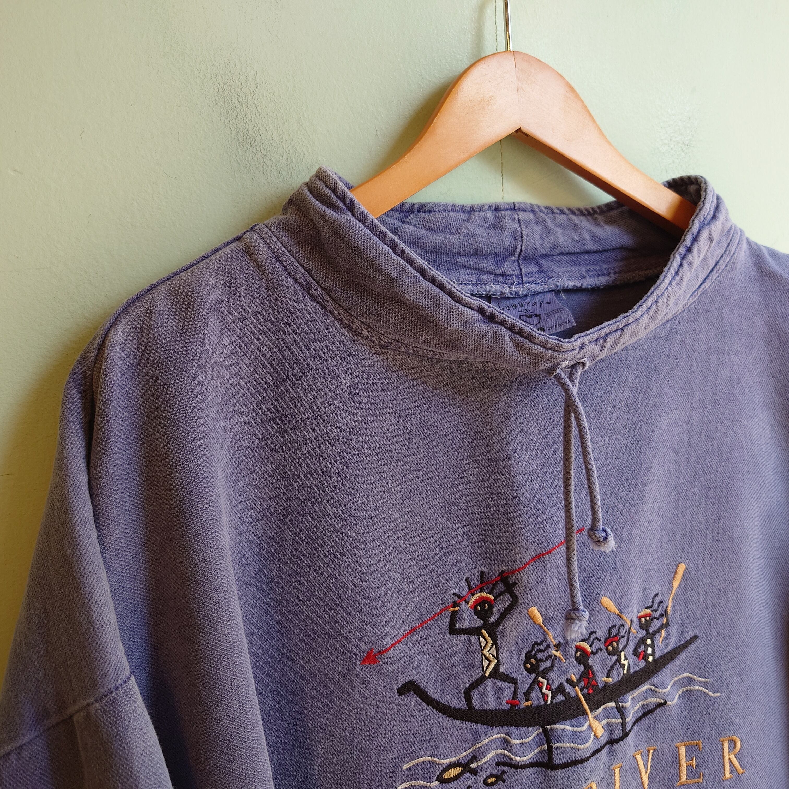 カヌーやカヤックなどのレジャーで非常に人気のある観光地、サコ川のスーベニアプルオーバー。程よい厚さで柔らかなコットン素材で、プルオーバーシャツやカットソーのような質感ながら、スウェットのような気楽さがいい。くすんだ青紫とネイティブ感ある刺繍も抜群の雰囲気。
