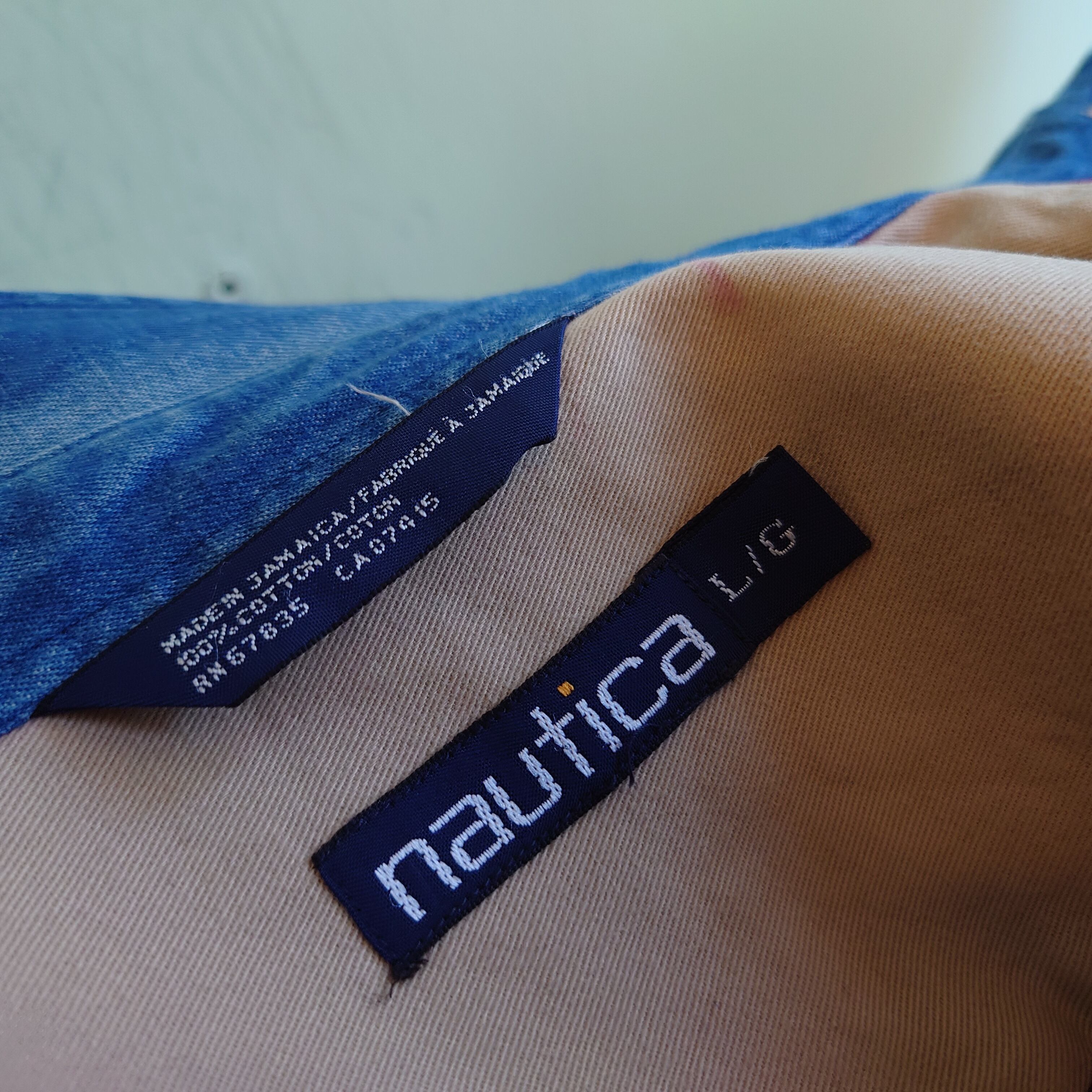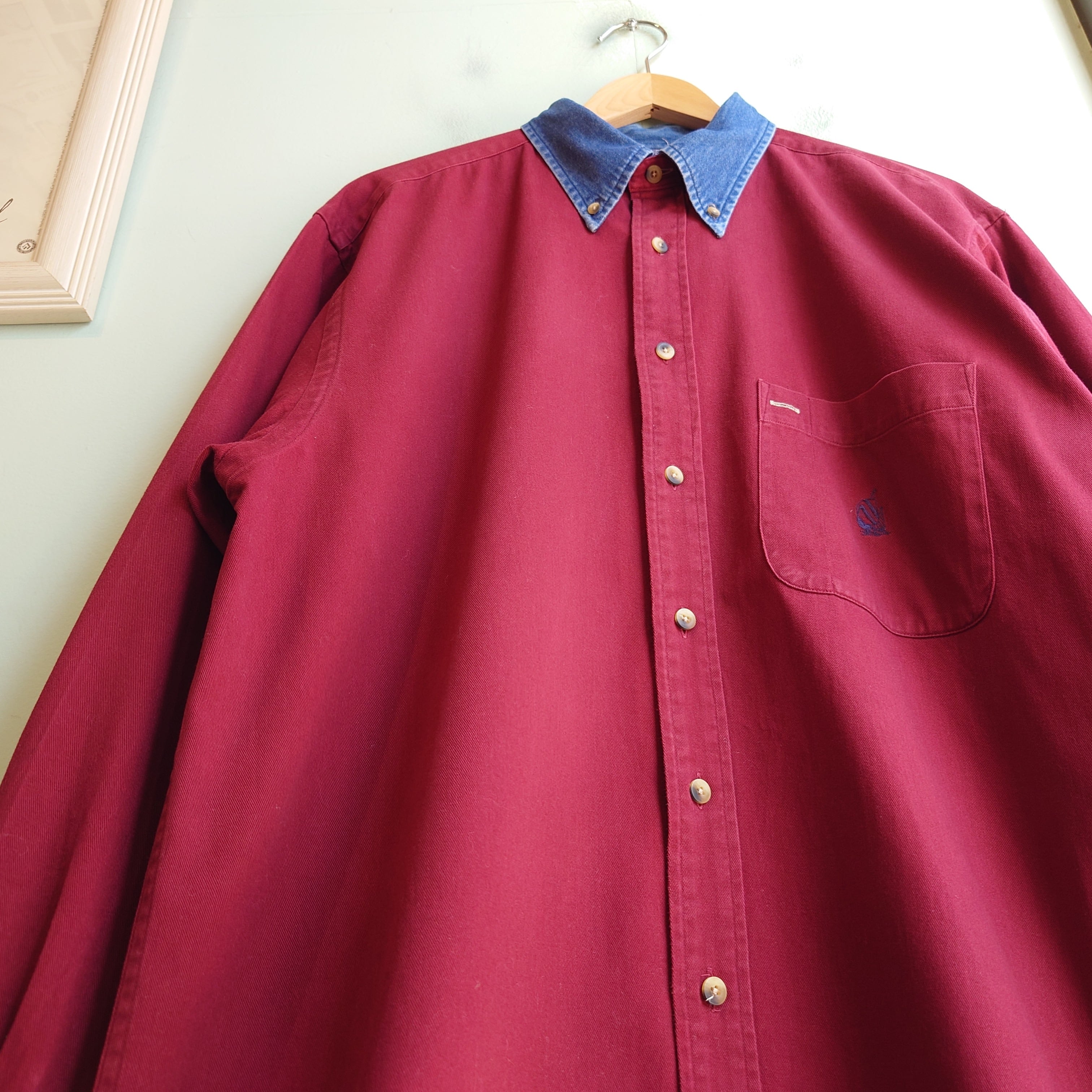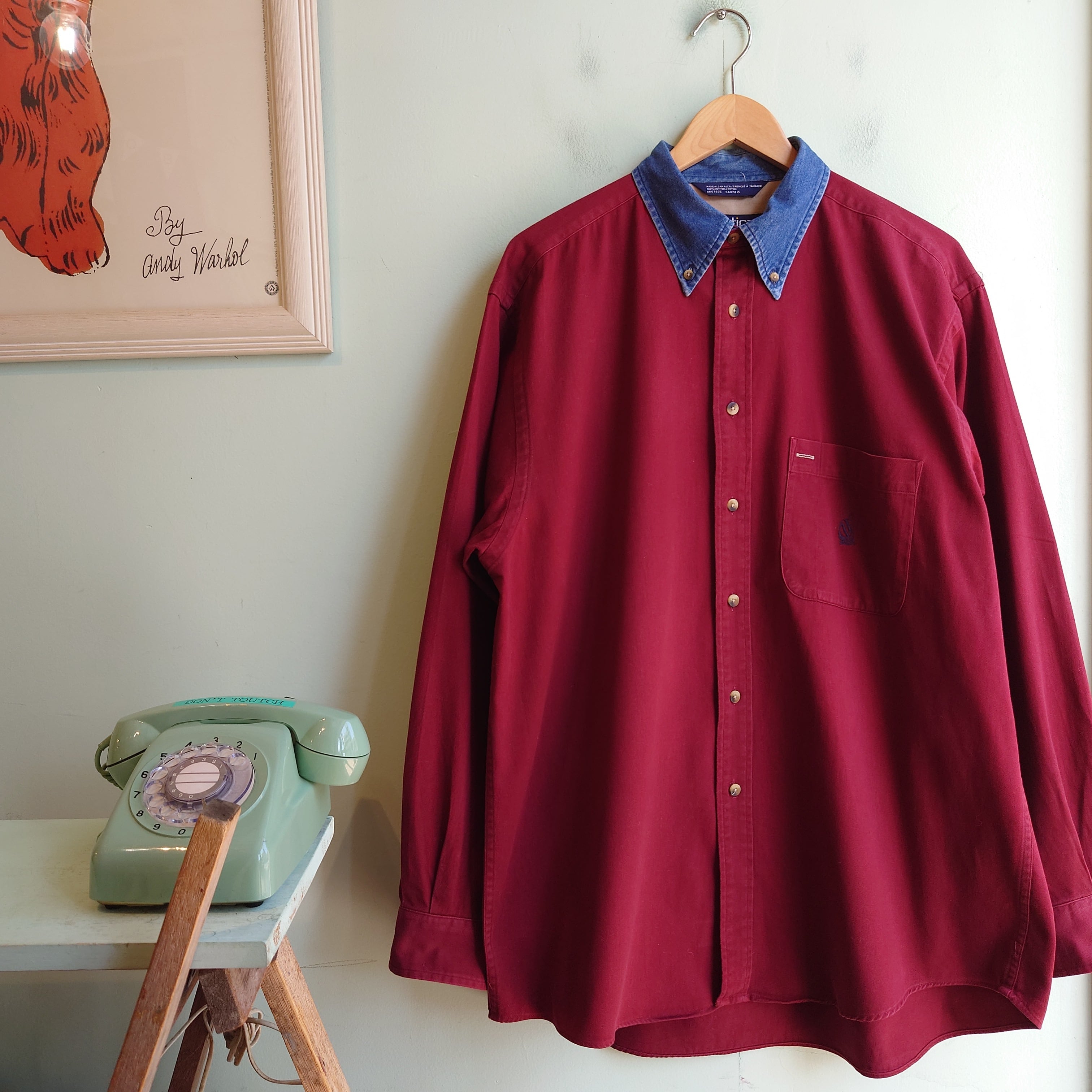 nauticaのオールドシャツ。ボルドーにデニムの襟を組み合わせた、レトロなデザインとコットンの風合いが最高。特に襟周りは現代より高めでシャープなスタイリッシュさ。またポケットのボタンや内タグ付近にベージュのアクセントもセンスよし。