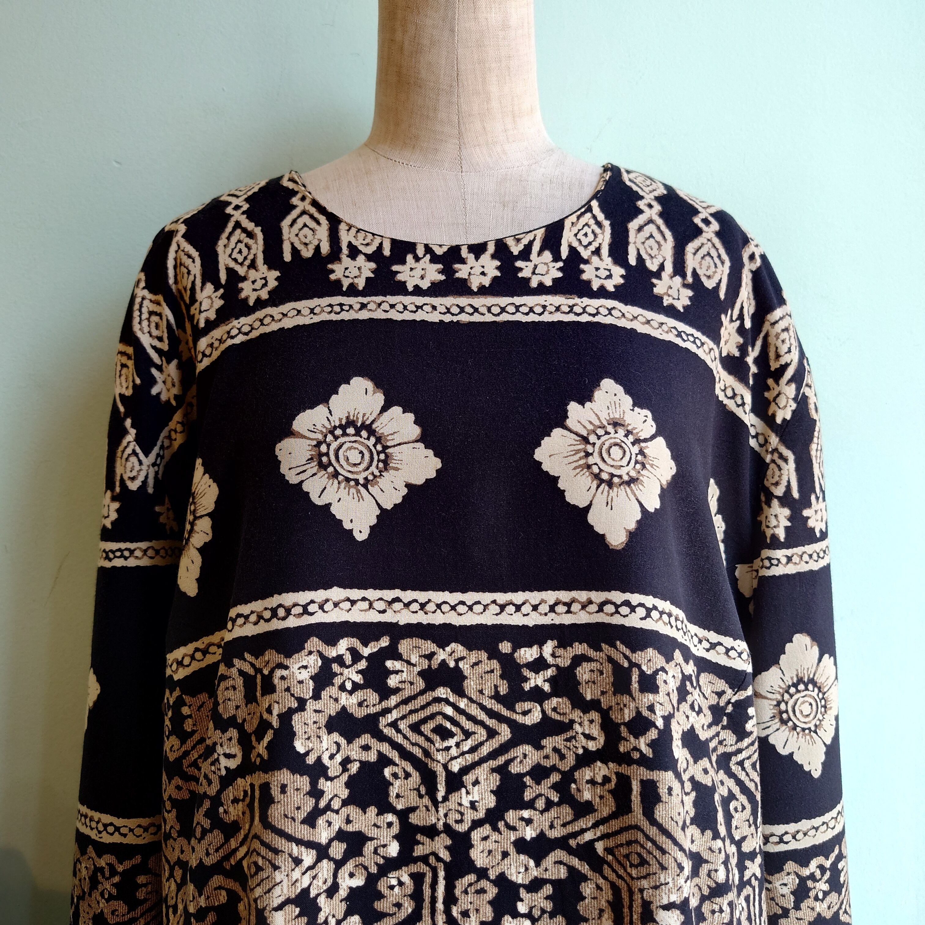 アンサンブル系では珍しく、ジャケットではなくオーバーサイズのカットソーを重ねたようなデザインのヴィンテージドレス。ハワイアンネイティブを思わせるリゾートテイストな総柄ながら、黒でピリッと引き締まった感じも◎。ストンとゆるっとしたレーヨン素材で、とろみ、動き感も絶妙。