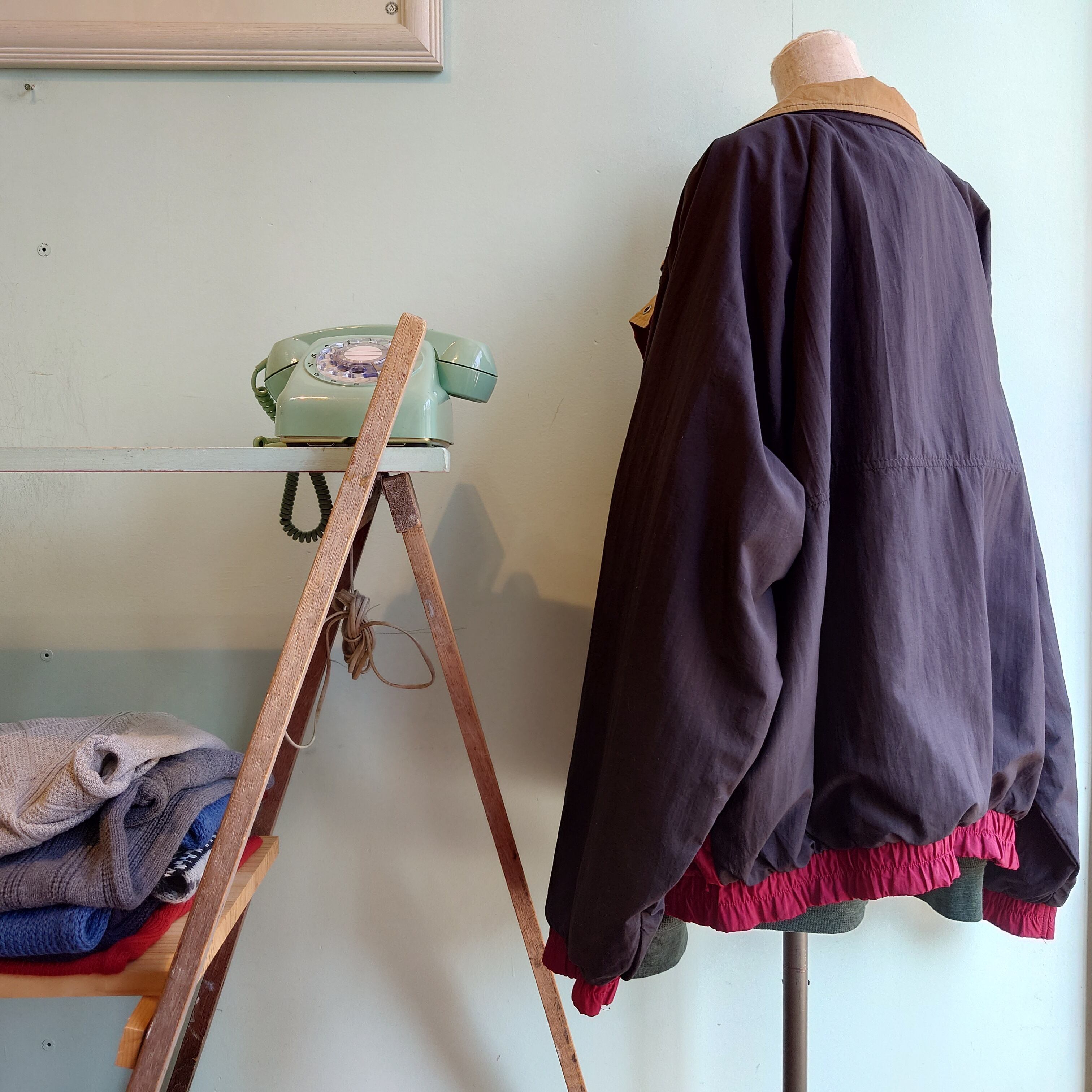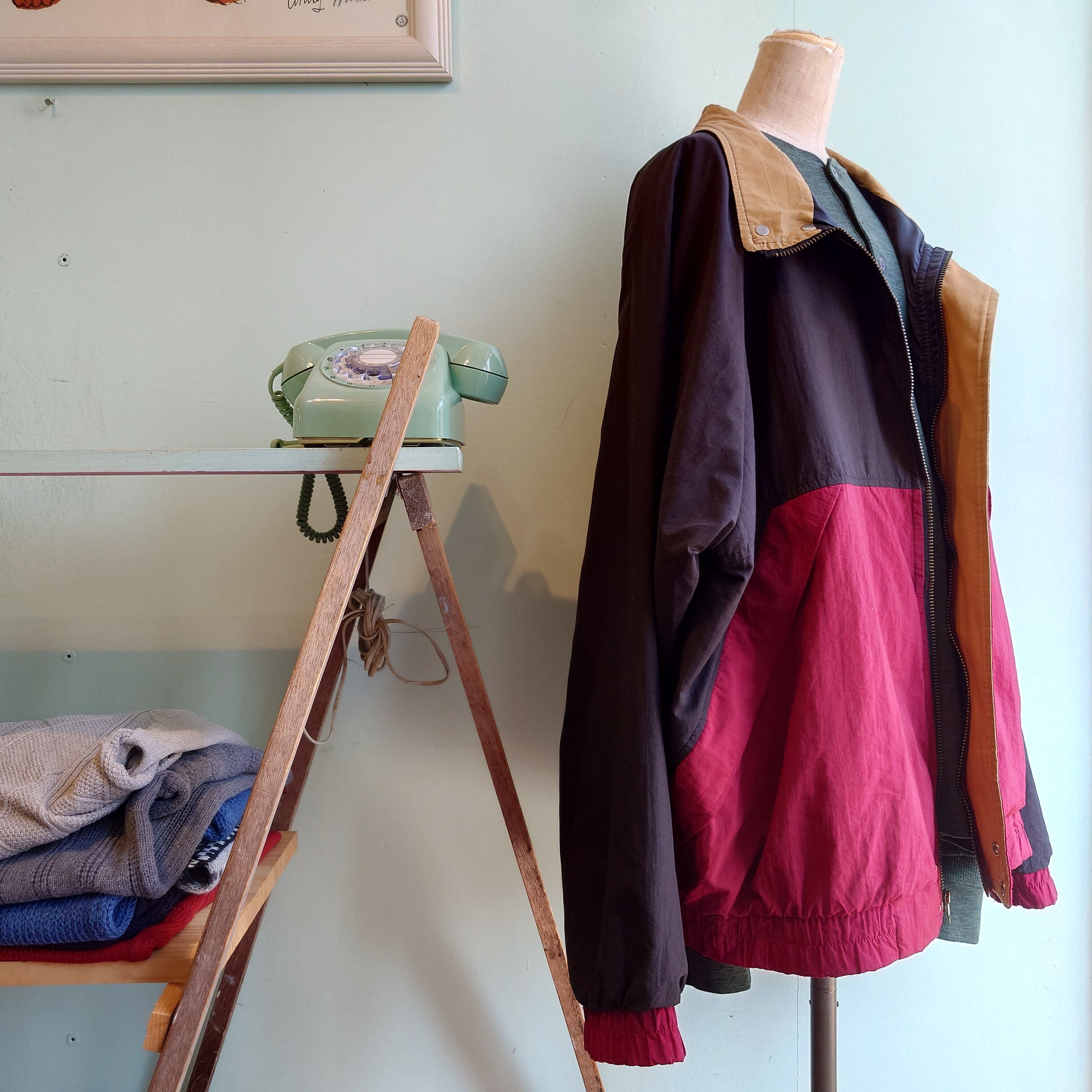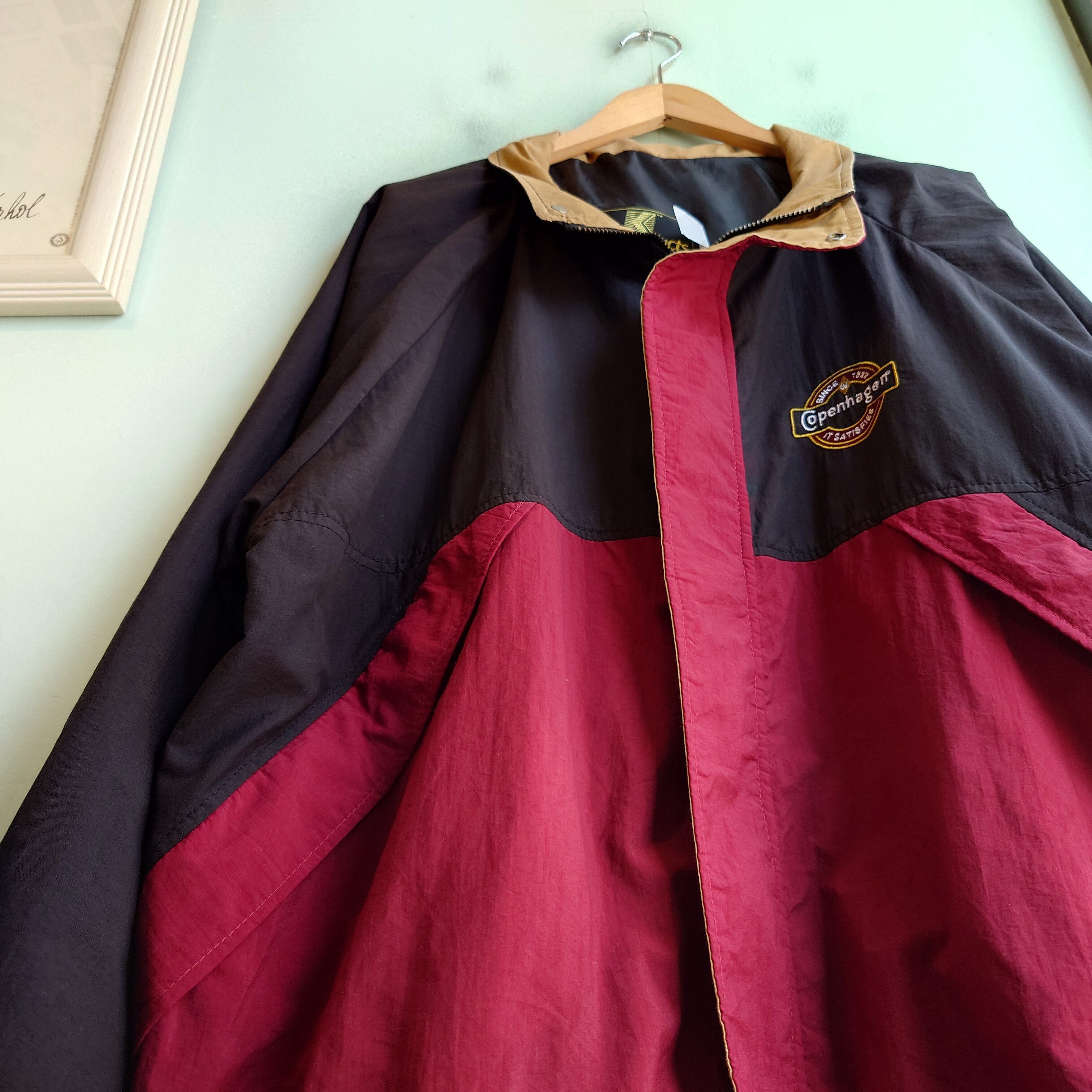 噛みタバコの有名ブランド、コペンハーゲンのオフィシャルジャケット。ブランドロゴとおそろいのマルチカラーがかっこいい。ワイド&ショートなグッドシルエットに、古い時代のシワ感あるナイロンがレトロ。スポーツブランドにはない独特な世界観に惹かれるライトアウターです。