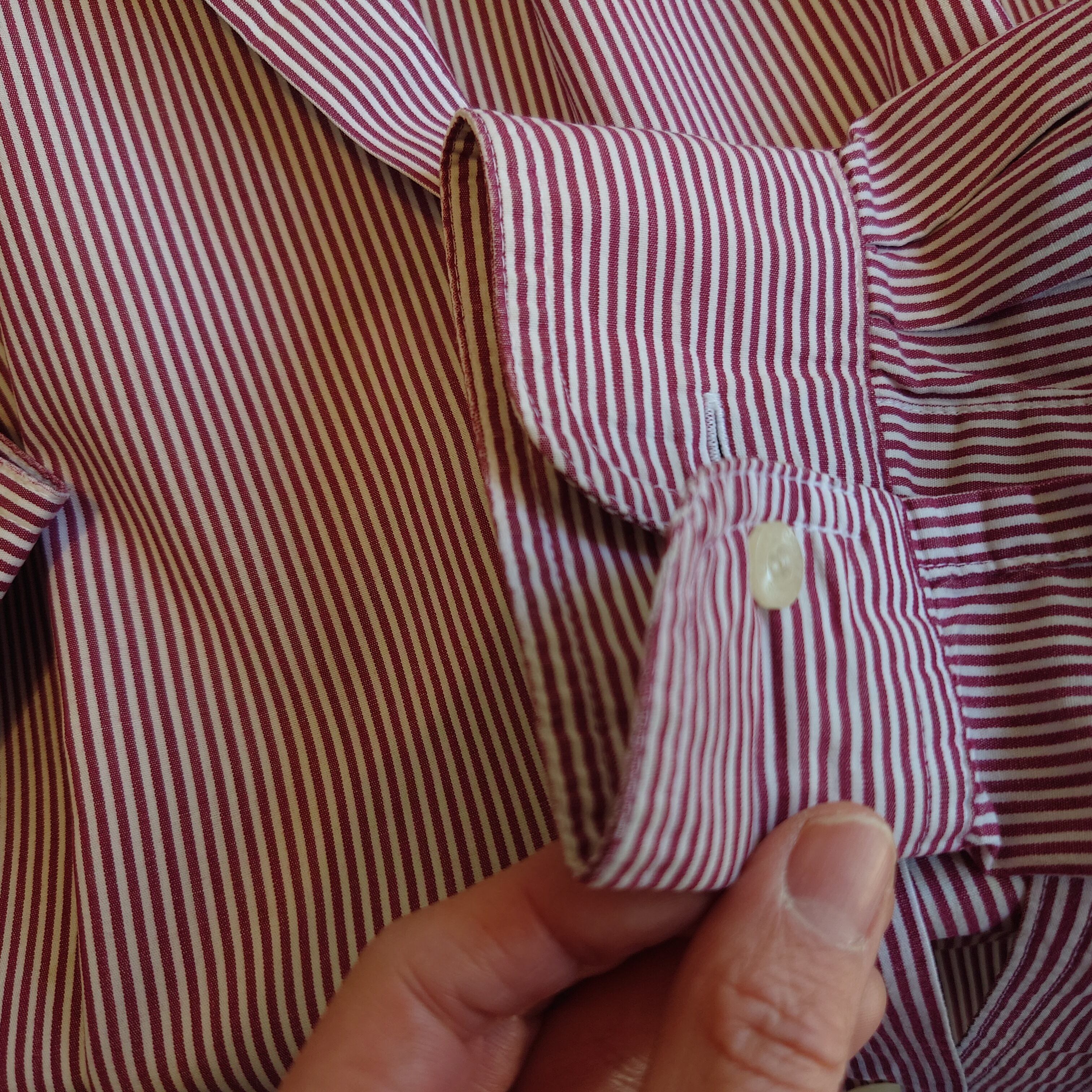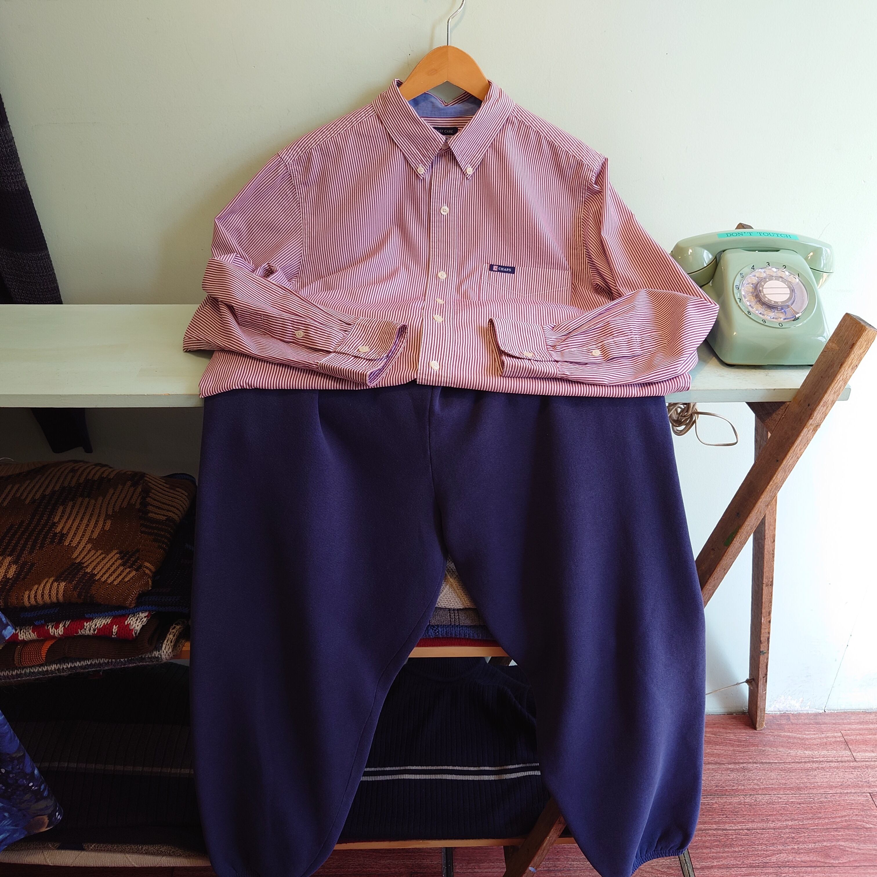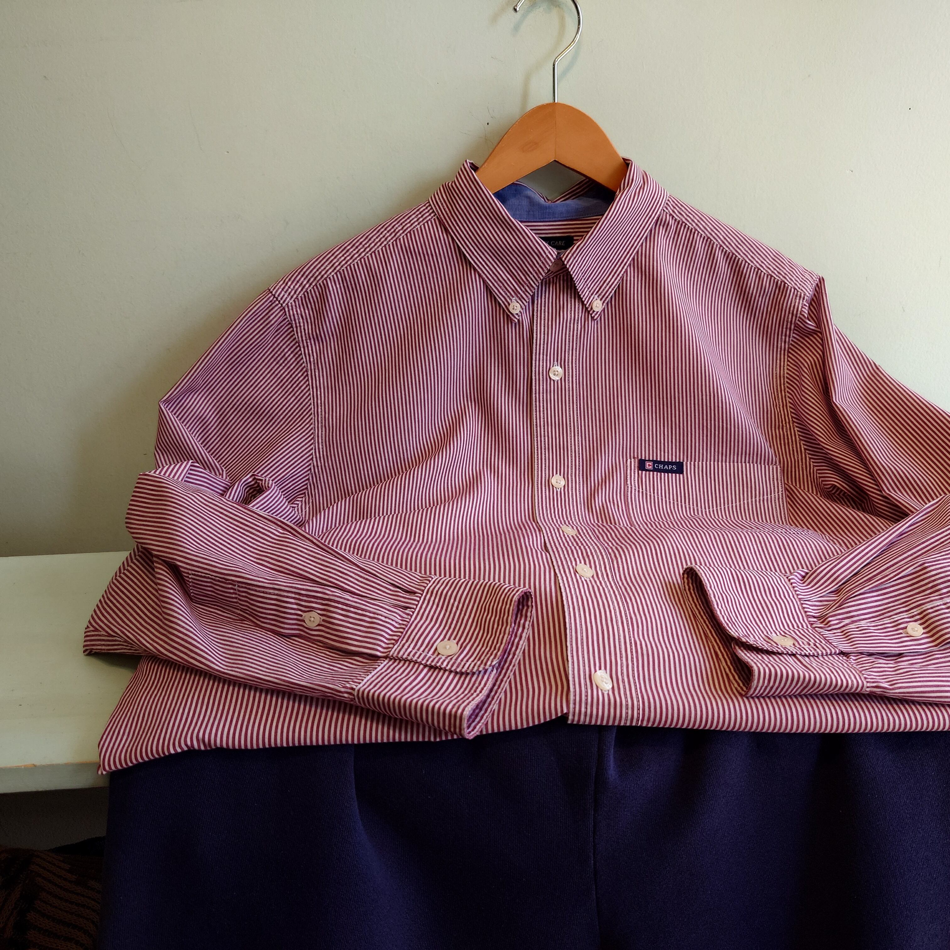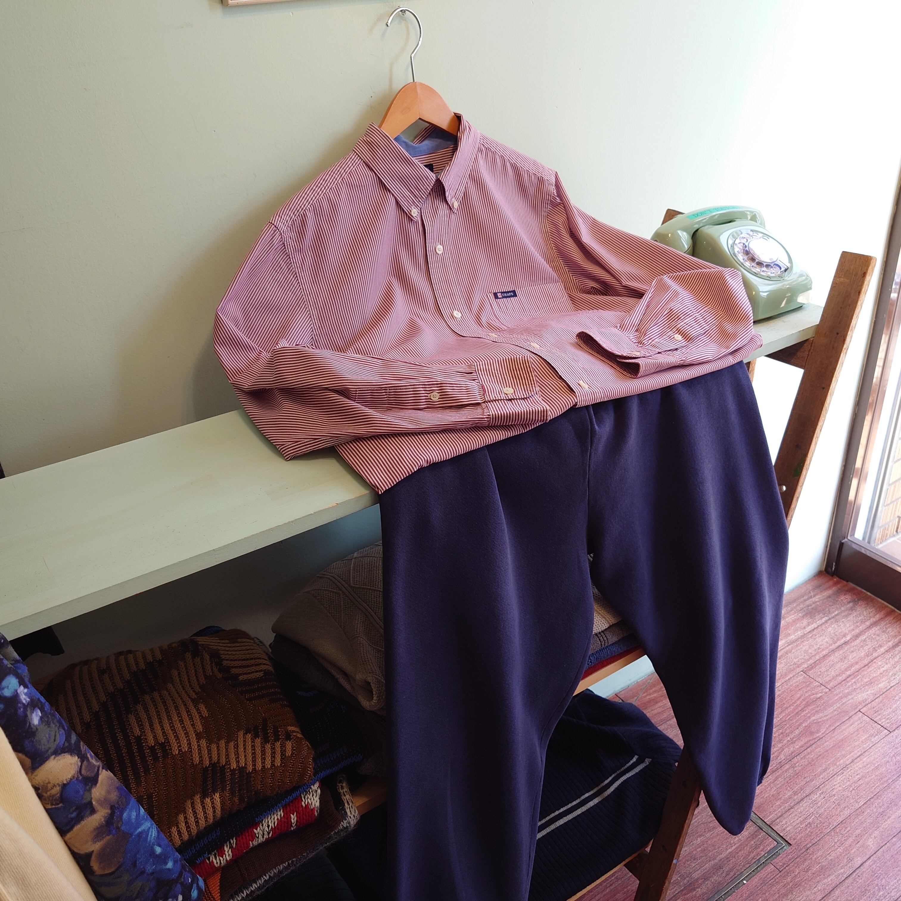 チャップスのボタンダウンシャツ。やや褪せたレッドとホワイトの定番ストライプ。アメカジらしいコットンの気持ちよさと、シワになりにくいモダン差を兼ね添えた優等生。身幅と丈感のバランスが絶妙なグッドサイズです。