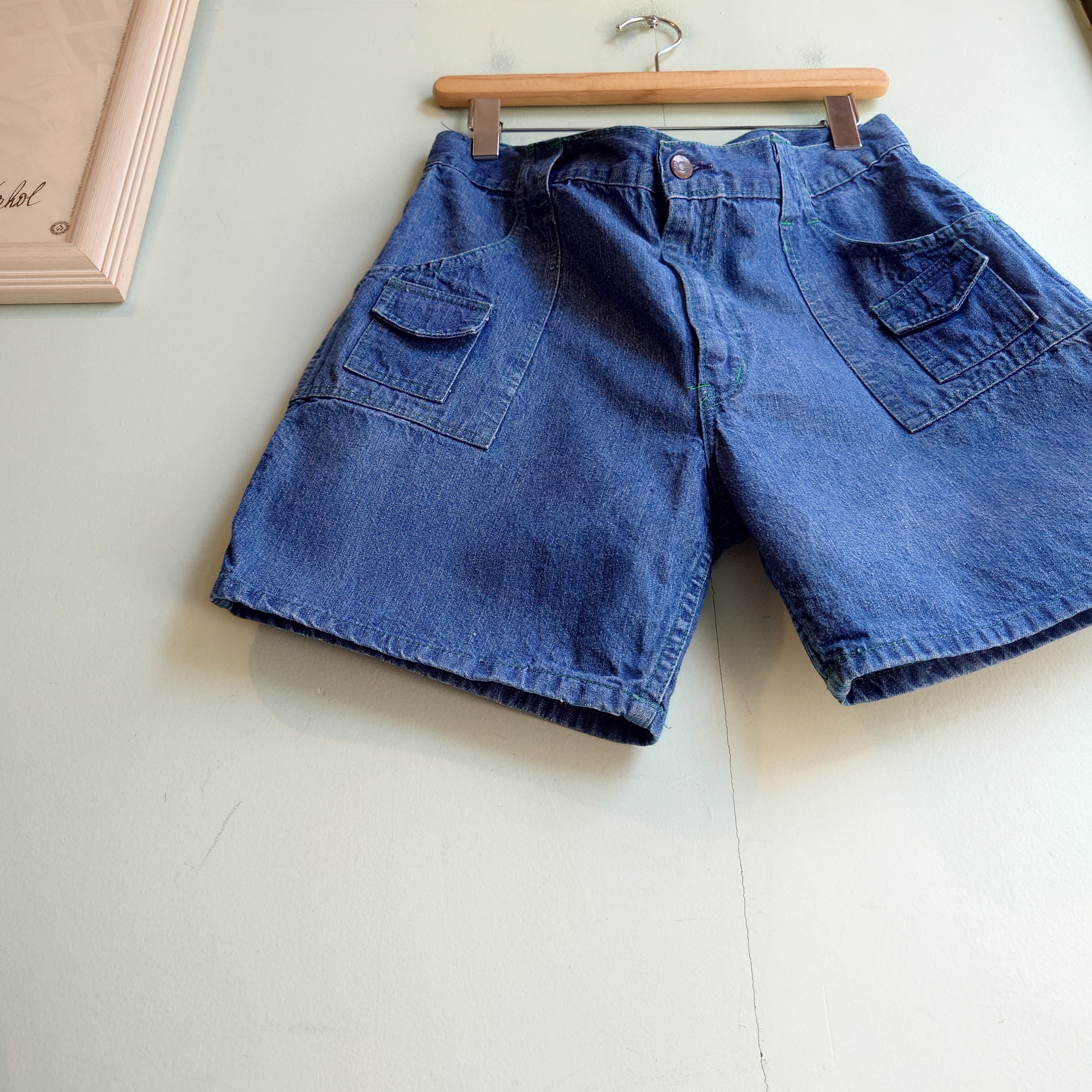 80-90s vintage、Fruit of the Loomのデニムショーツ。サファリ感のあるブッシュパンツをモチーフにしたシルエットがレアな一本。また、緑色のステッチがよりクラシックな印象に。メンズアイテムですが、サイズ感的に女子コーデにもおすすめです。