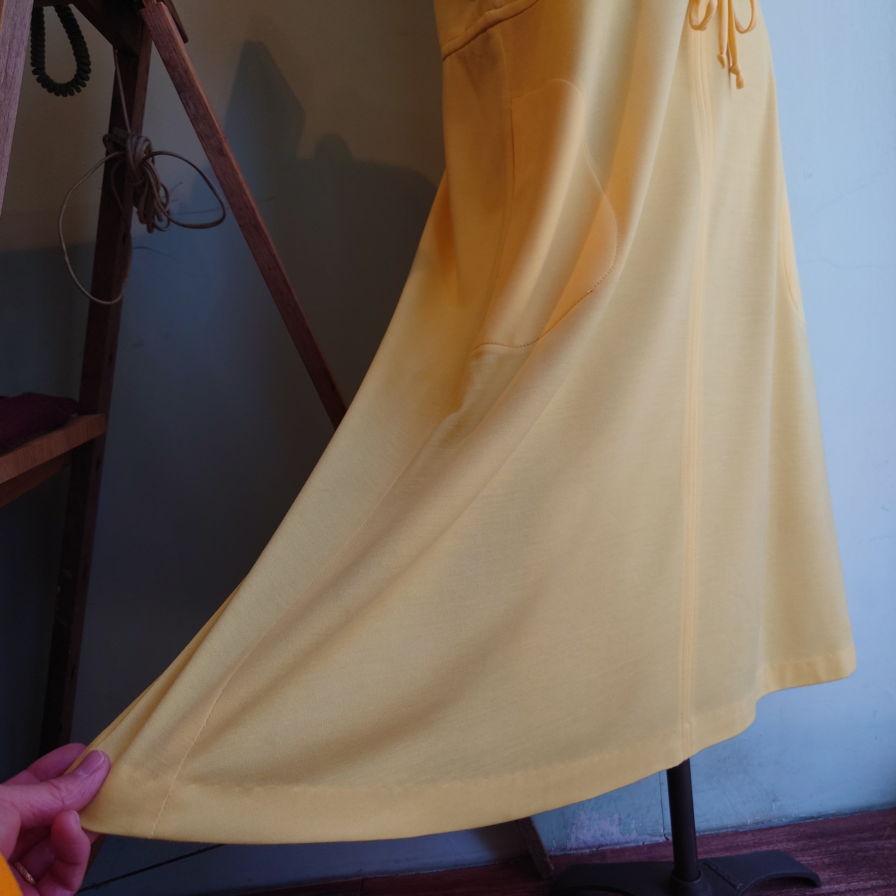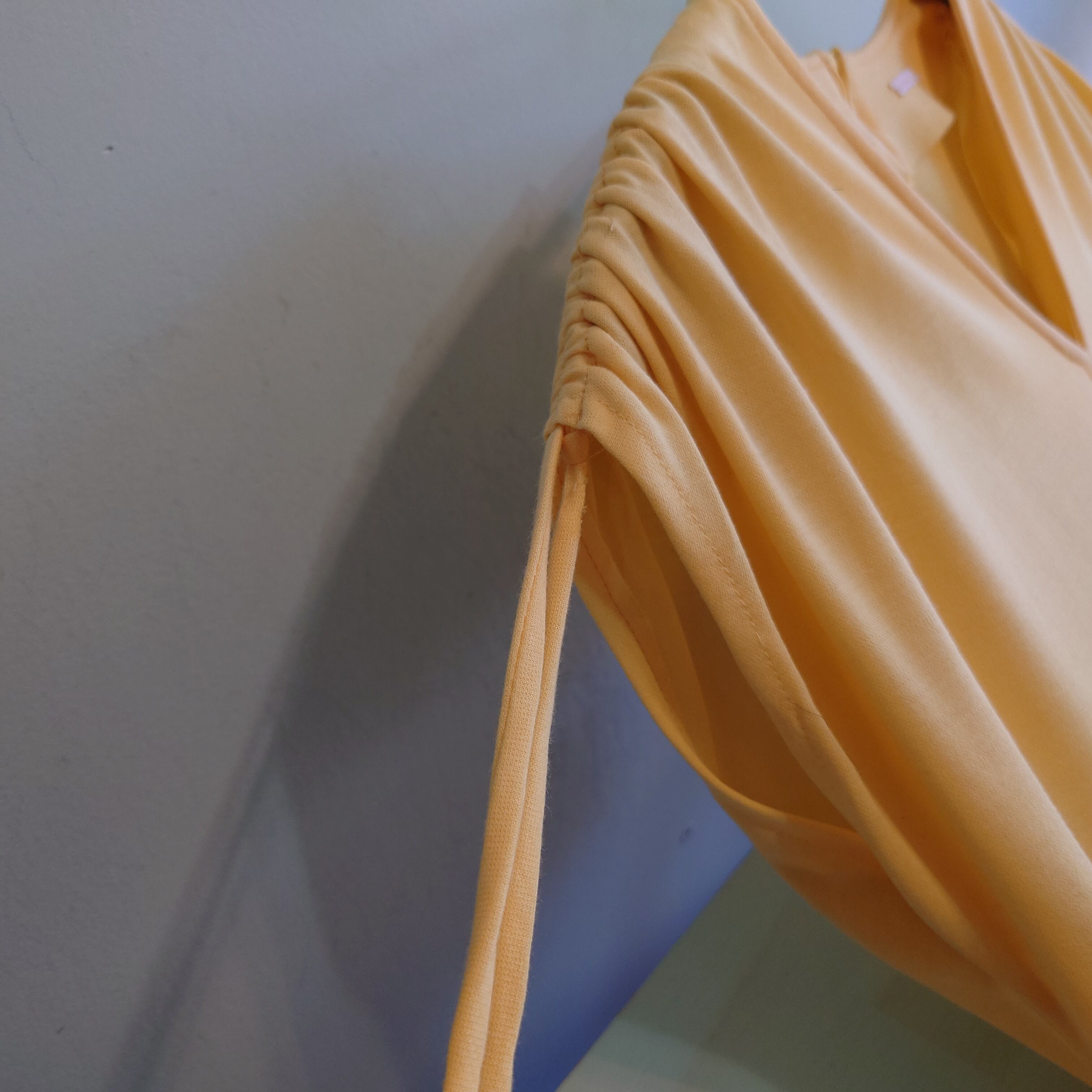 70-80s ヴィンテージのカットソーワンピース。テロっとしたカットソー系素材に、明るみのあるマスタードがフレッシュ。ストンとしたレトロフューチャーなシルエットの肩にはギャザー付き。上からプルオーバーやシャツを合わせたり、ボトムと組み合わせたり、レイヤードで化けるレトロドレスです◎