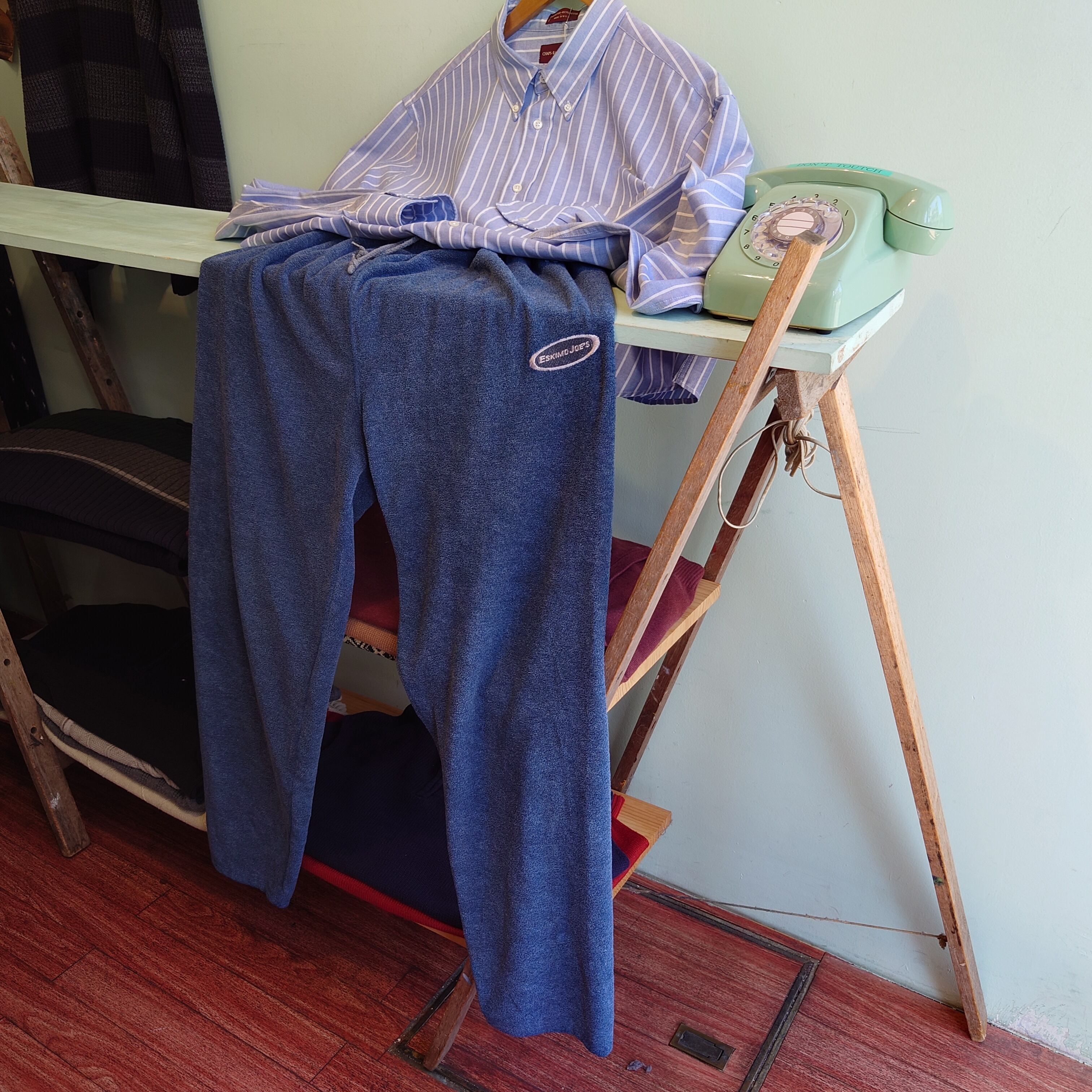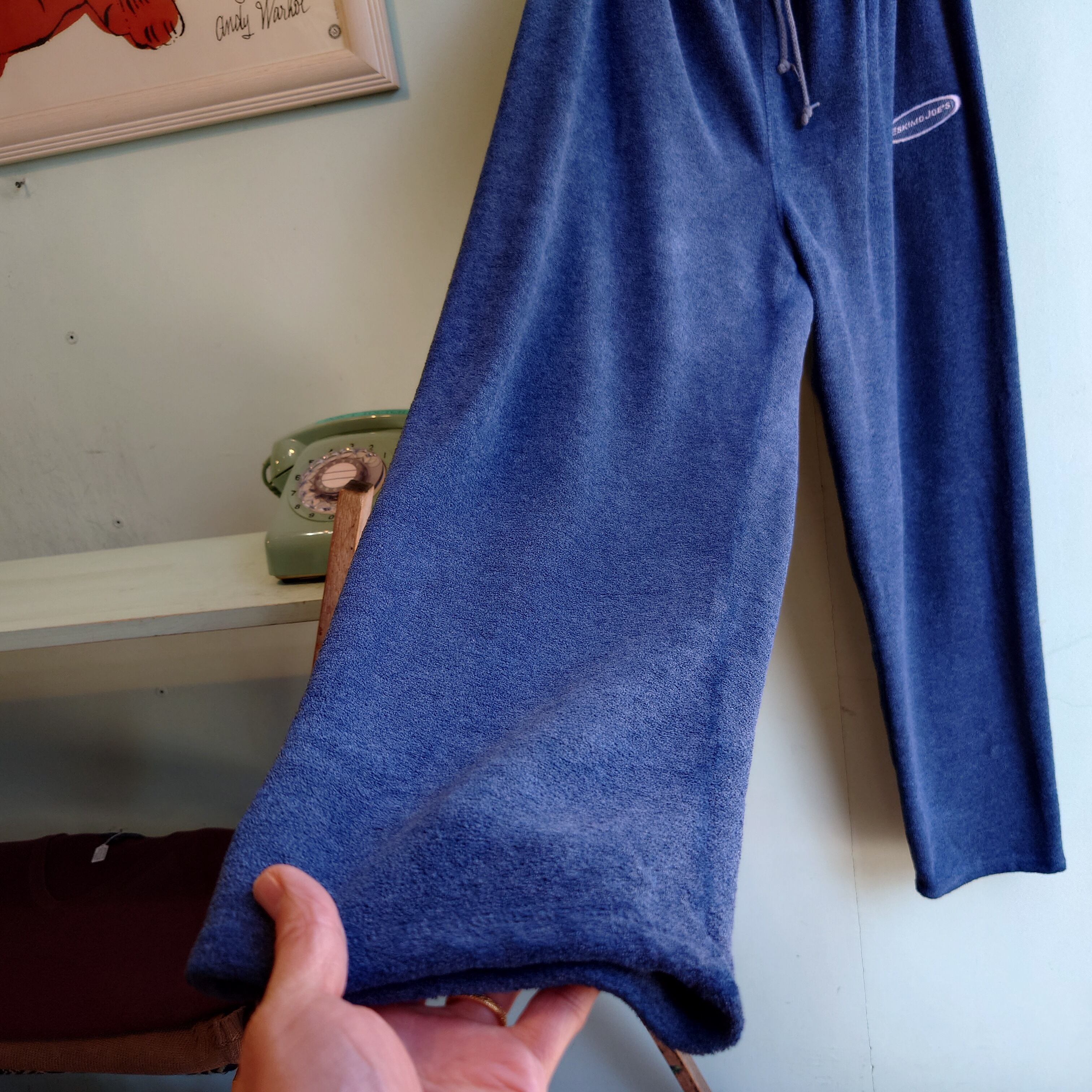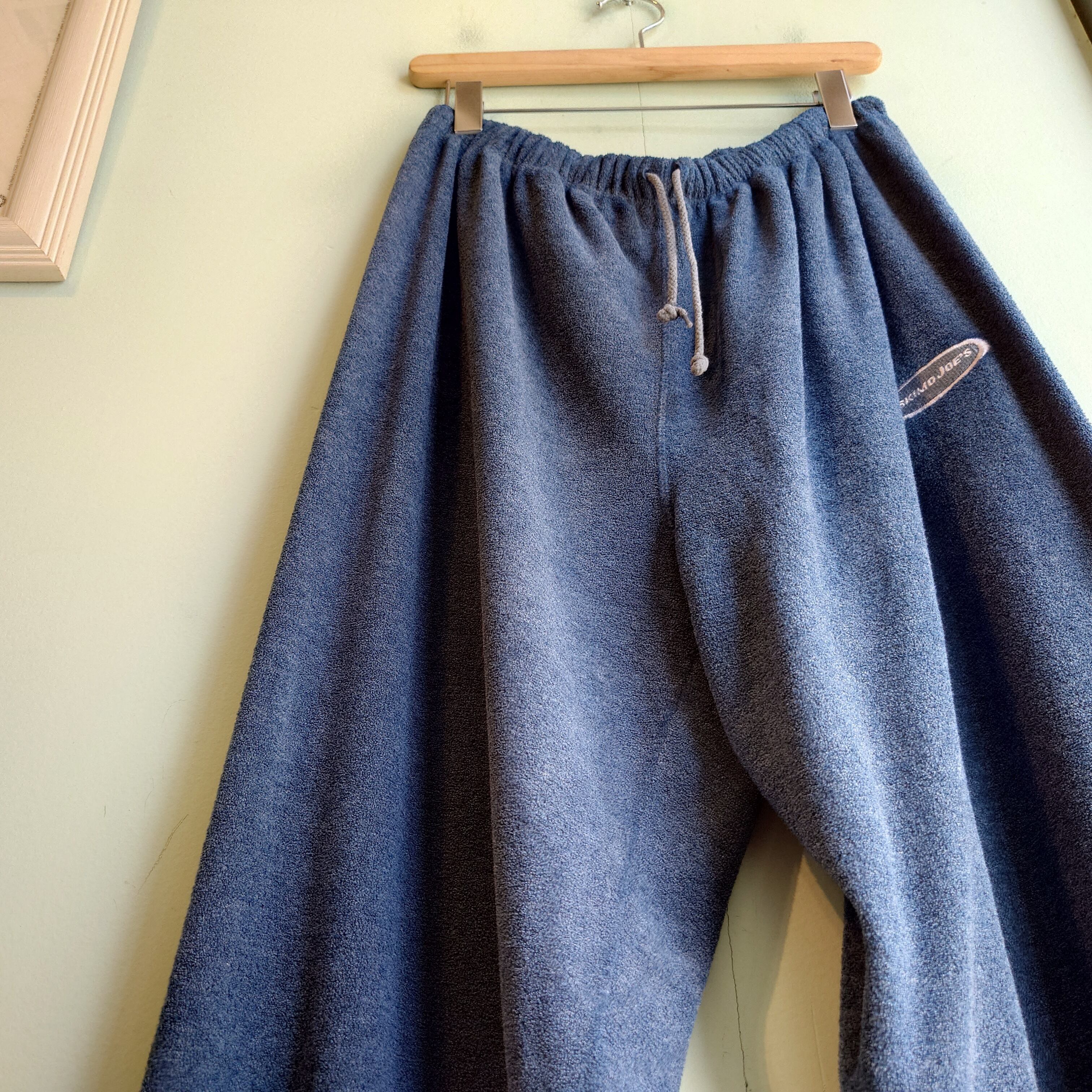 ラッセルではかなり珍しいパイル素材のイージーパンツ。ブルーグレーのくすみ感と毛羽立ち感に存在感のある企業ロゴも◎。ロゴは古着好きにはお馴染みの、有名レストラン"エスキモー・ジョー"。ダボっとしたスウェットパンツに似たシルエットで、裾がシェイプしているので裾ゴム入りのように、身長選ばず履きやすいタイプ。