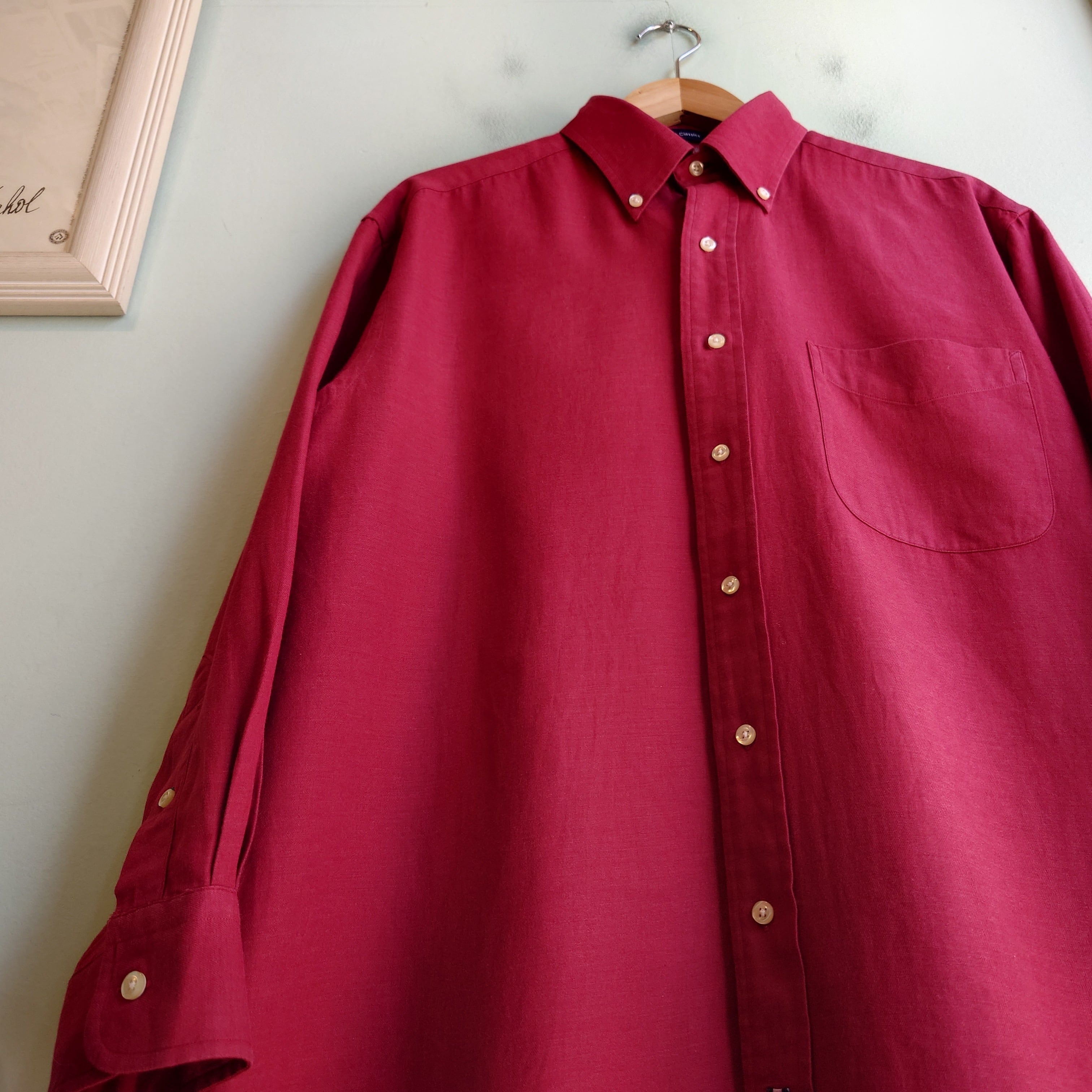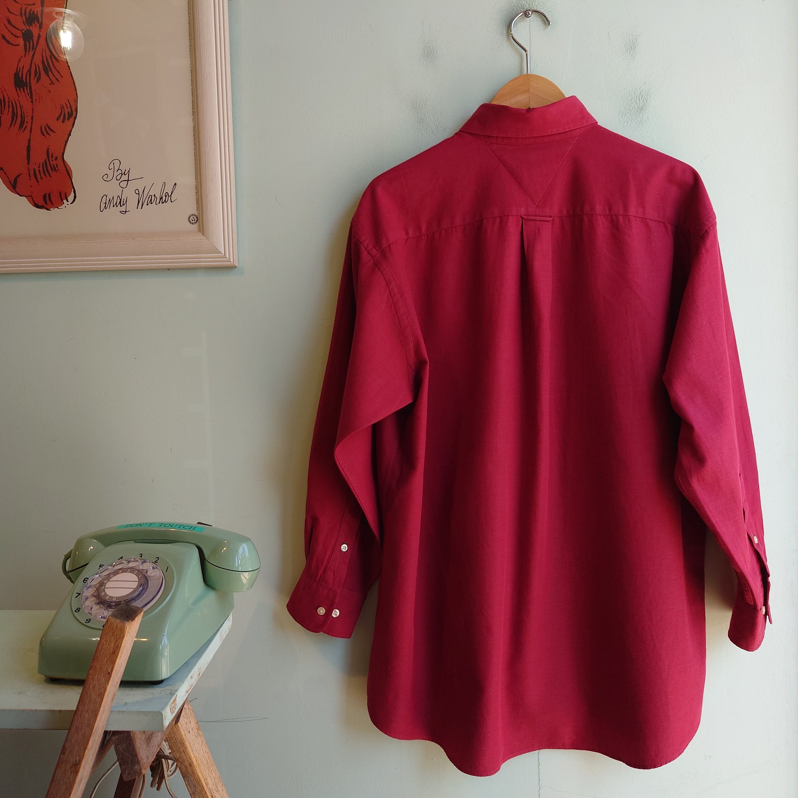 トミーヒルフィガーのボタンダウンシャツ。退色したような味わいのボルドーが可愛い。パリッとしたコットンの対局にある、ガーゼのようなふんわりコットンが春らしい。梅雨時の羽織まで活躍しそうな、心地よさMAXの1枚。