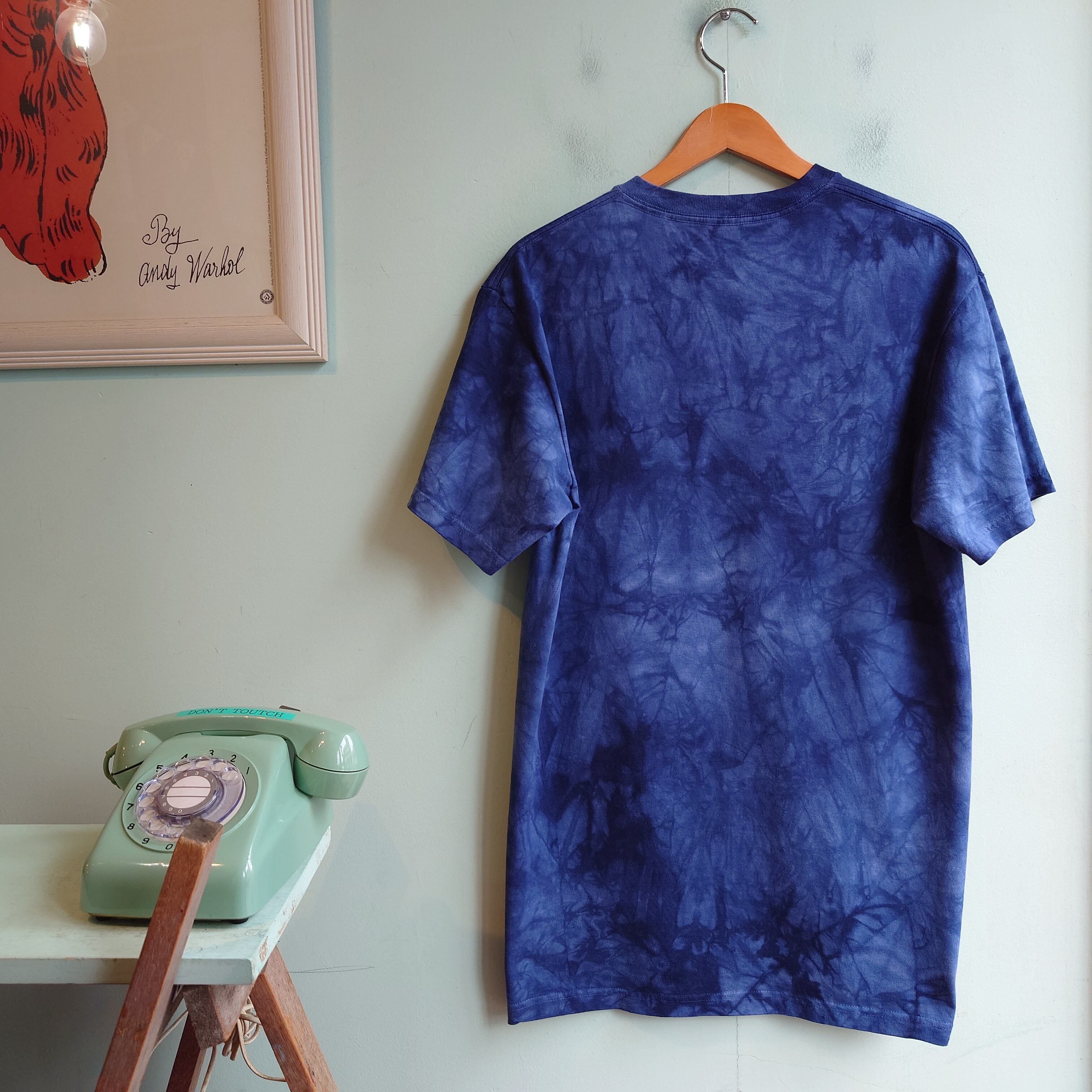 ザ・マウンテンのアニマルTシャツ。くすんだ青みのタイダイ染がドラマチック。アニマルプリントは毛並みの細い部分まで表現された、マウンテンらしい繊細さ。星条旗をインストールした有名柄、パトリオティック・ホース。