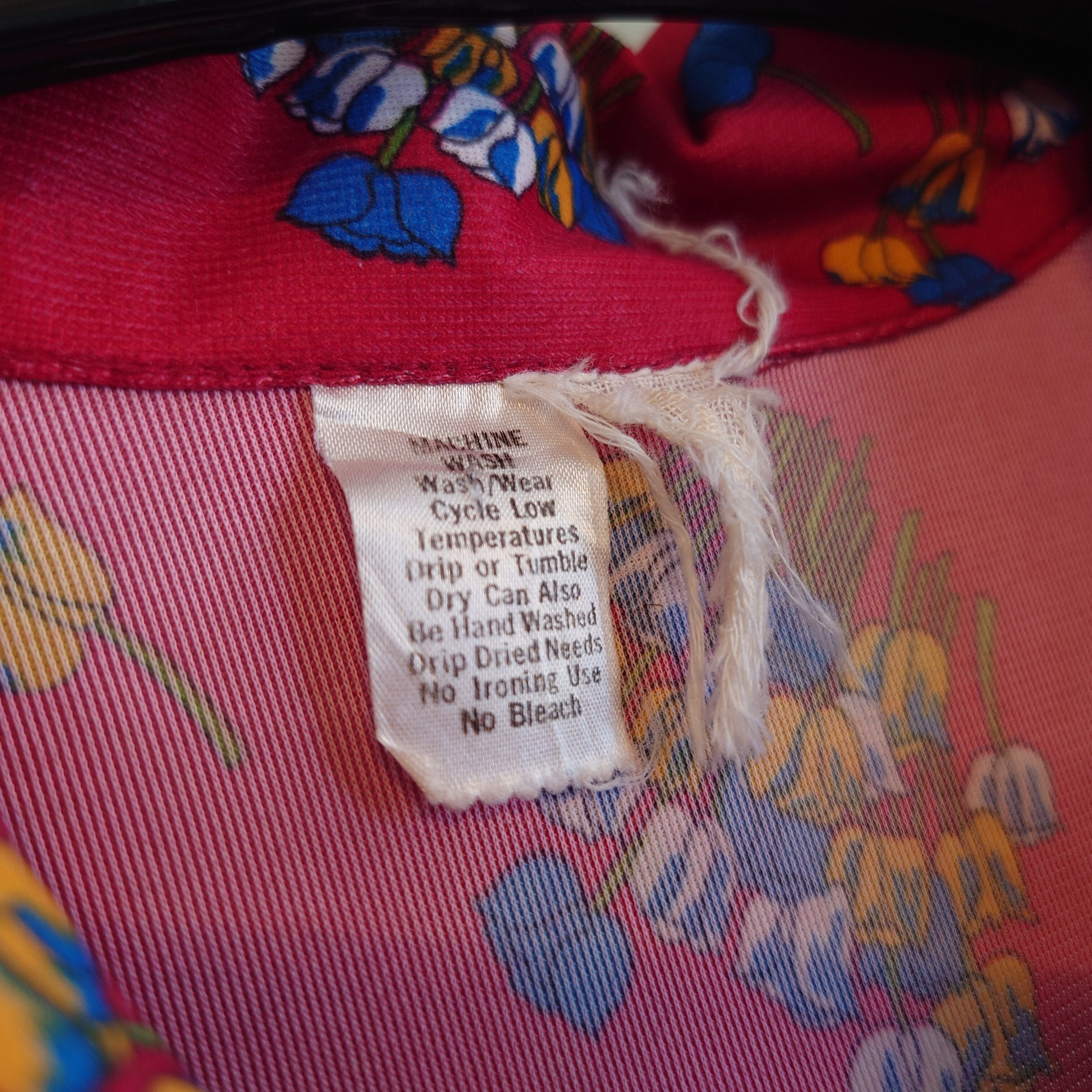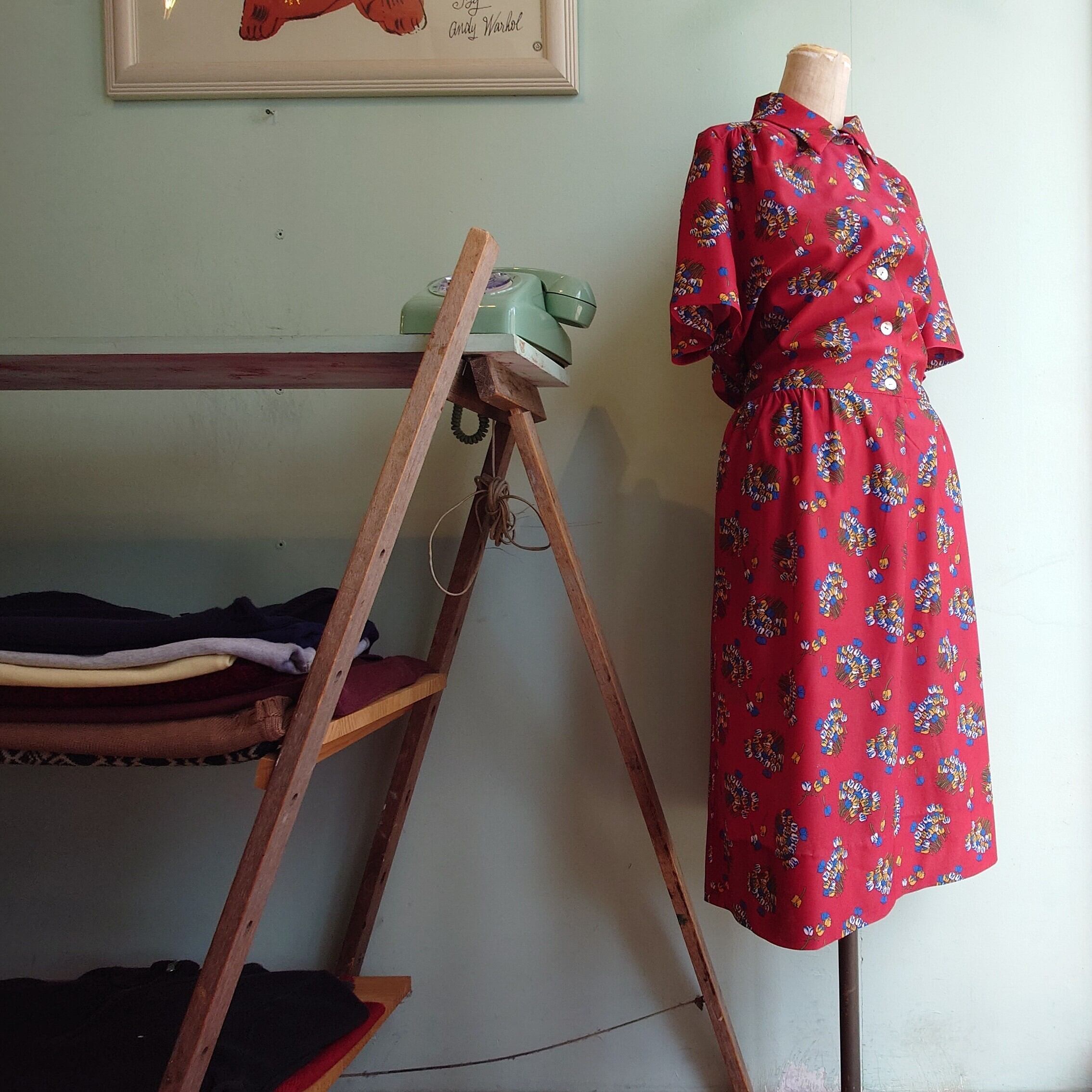 60-70年代ヴィンテージ、ウォッシュ&ウェア(スタプレ)系素材のヴィンテージドレス。ややくすみのあるレッドに、ヴィンテージの家具に描かれるようなレトロな花柄がかわいい。紐は前でも後ろでも◎、ギュッと絞るのもかわいい。ブラウスにミディアムスカートをドッキングさせたような、シンプルなシルエットもいい。