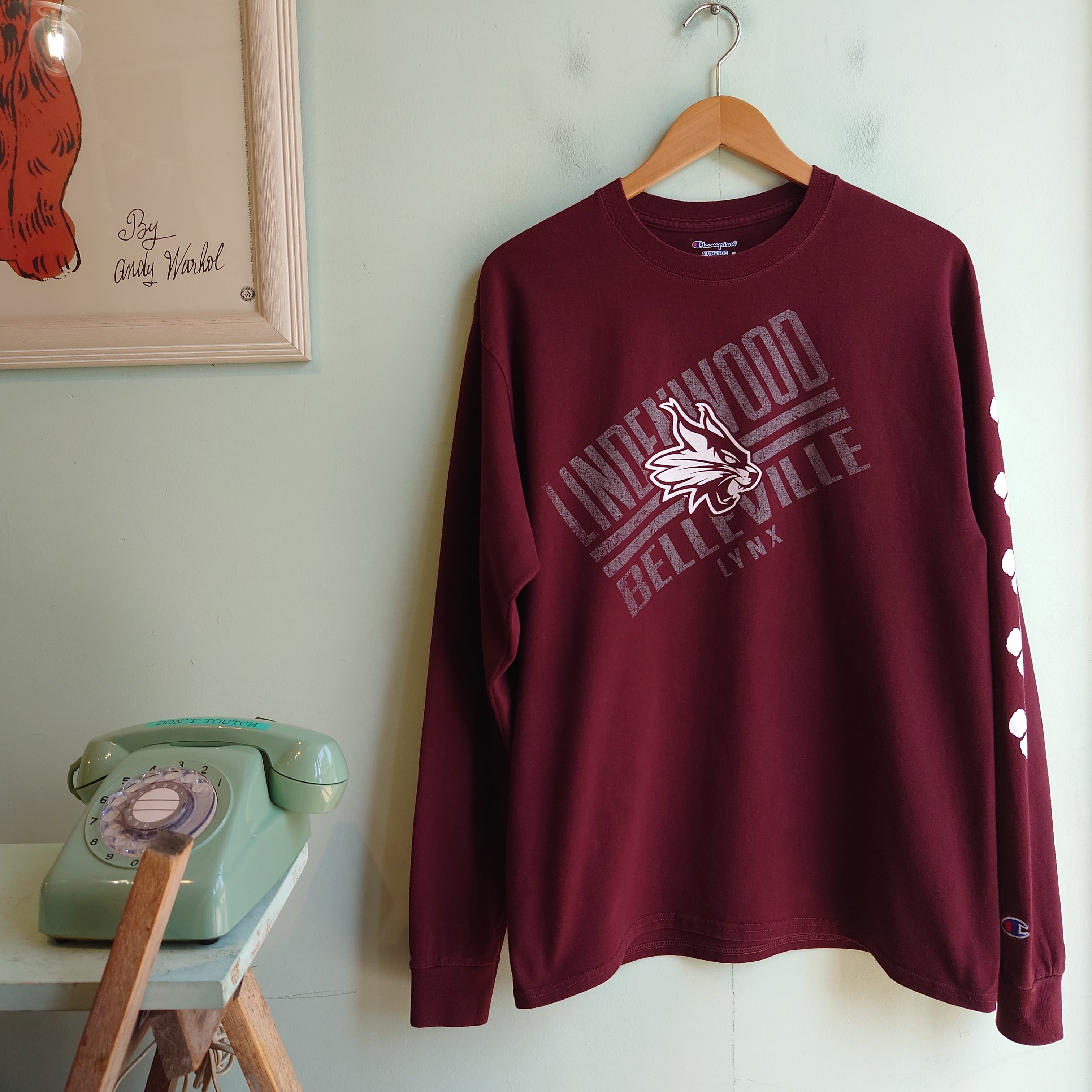 2020年閉校の、イリノイ州リンデンウッド大学のスポーツチーム、リンクス(オオヤマネコ)カレッジTシャツ。奥行き感のあるプリントや、5連の足跡がかわいいショルダープリントなど、定番より一つ進んだディテールが◎。スポーティーながら落ち着いた合わせにも使える、いいバーガンディーです。