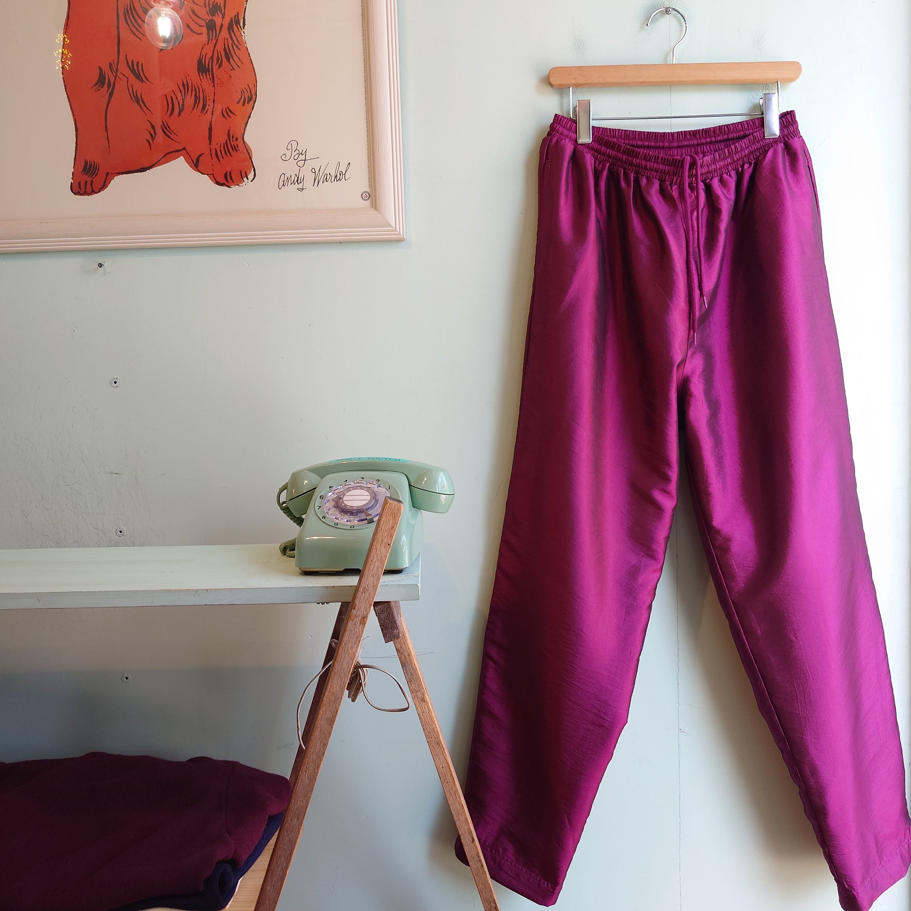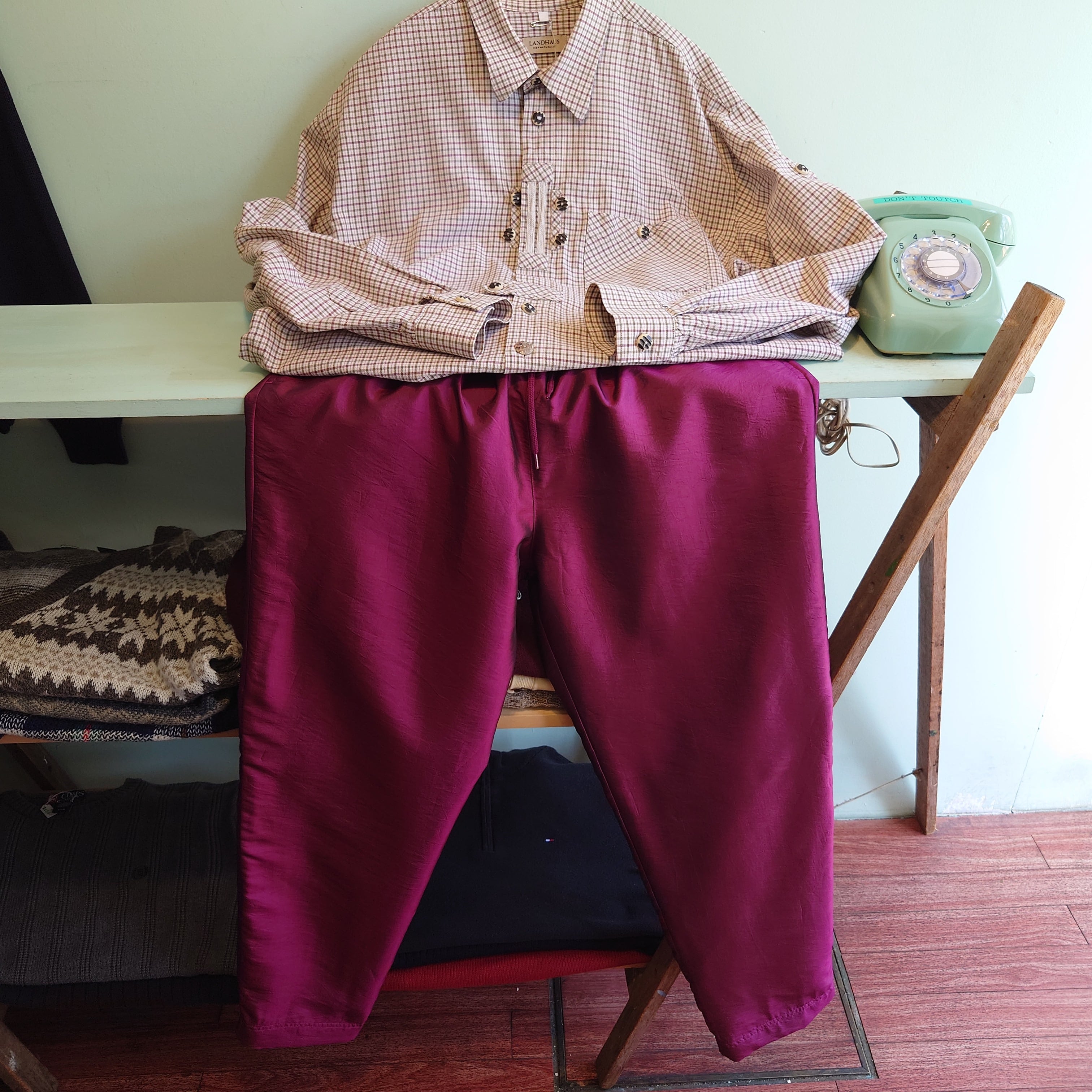 ボルドーやバーガンディーカラーに、メタリックをコーティングしたような特殊色のイージーパンツ。アルミホイルのような絞り感、ゆるっとワイドなシルエットでモードライクなテイストも。スポーツブランドのそれとは違う、個性溢れるナイロン系のイージーパンツです。