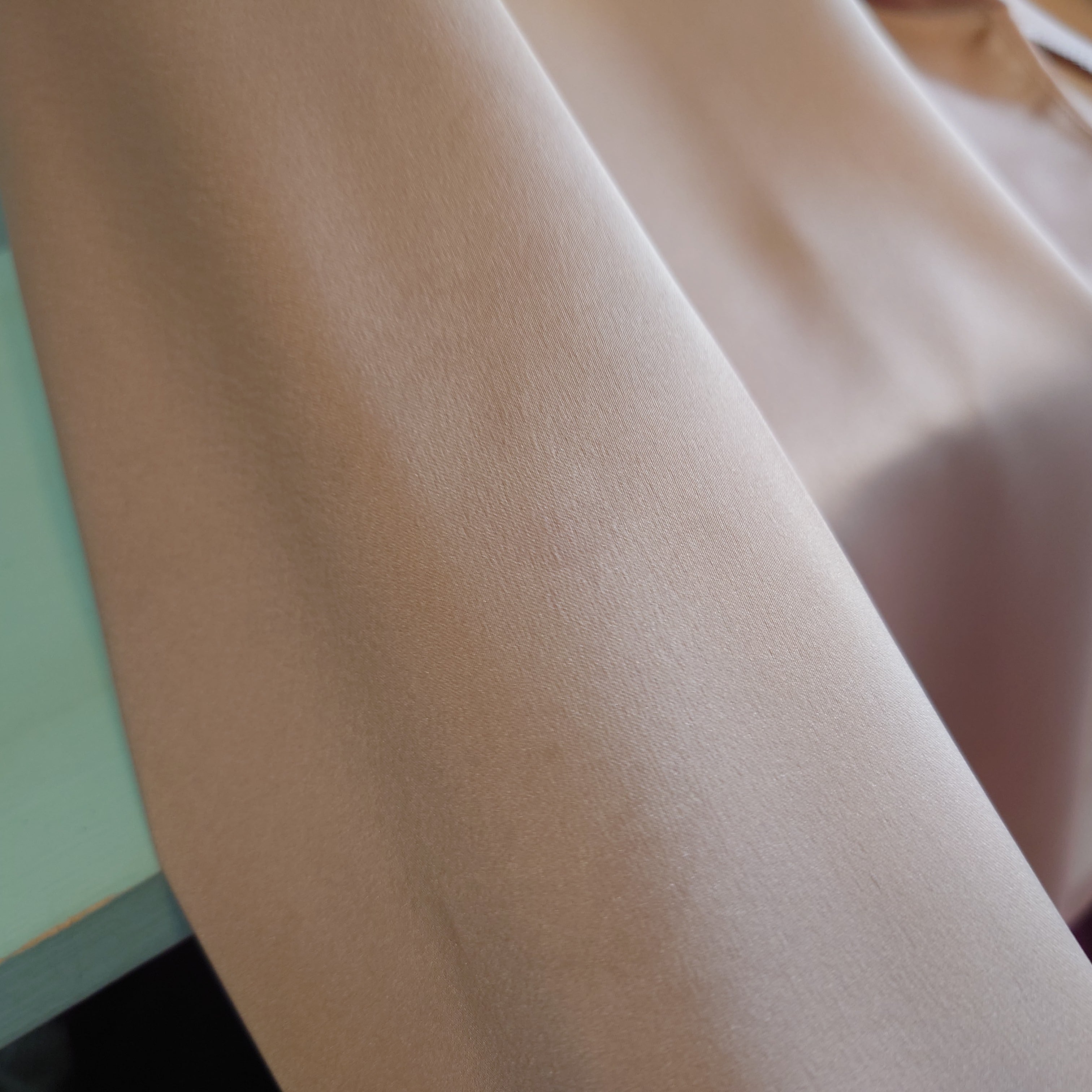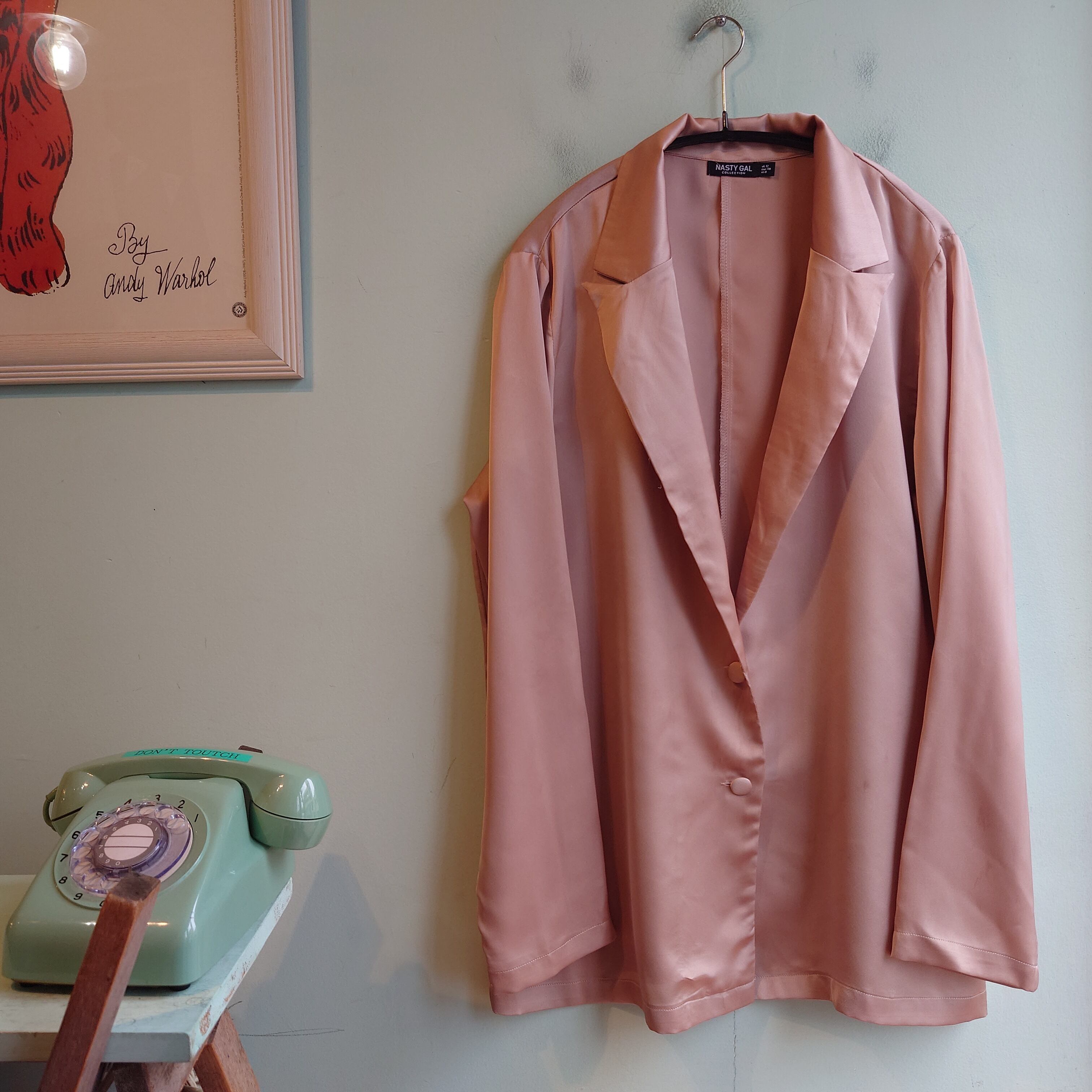 Nasty Galのサテン系変わり種ブラウス。シャンパン色が輝く、ナイトシャツのような光沢素材に、テーラードジャケット風のデザインが新鮮。カーディガンの様に軽く羽織るコーデが抜群にかわいい。あえてメンズコーデに取り入れても雰囲気あり。