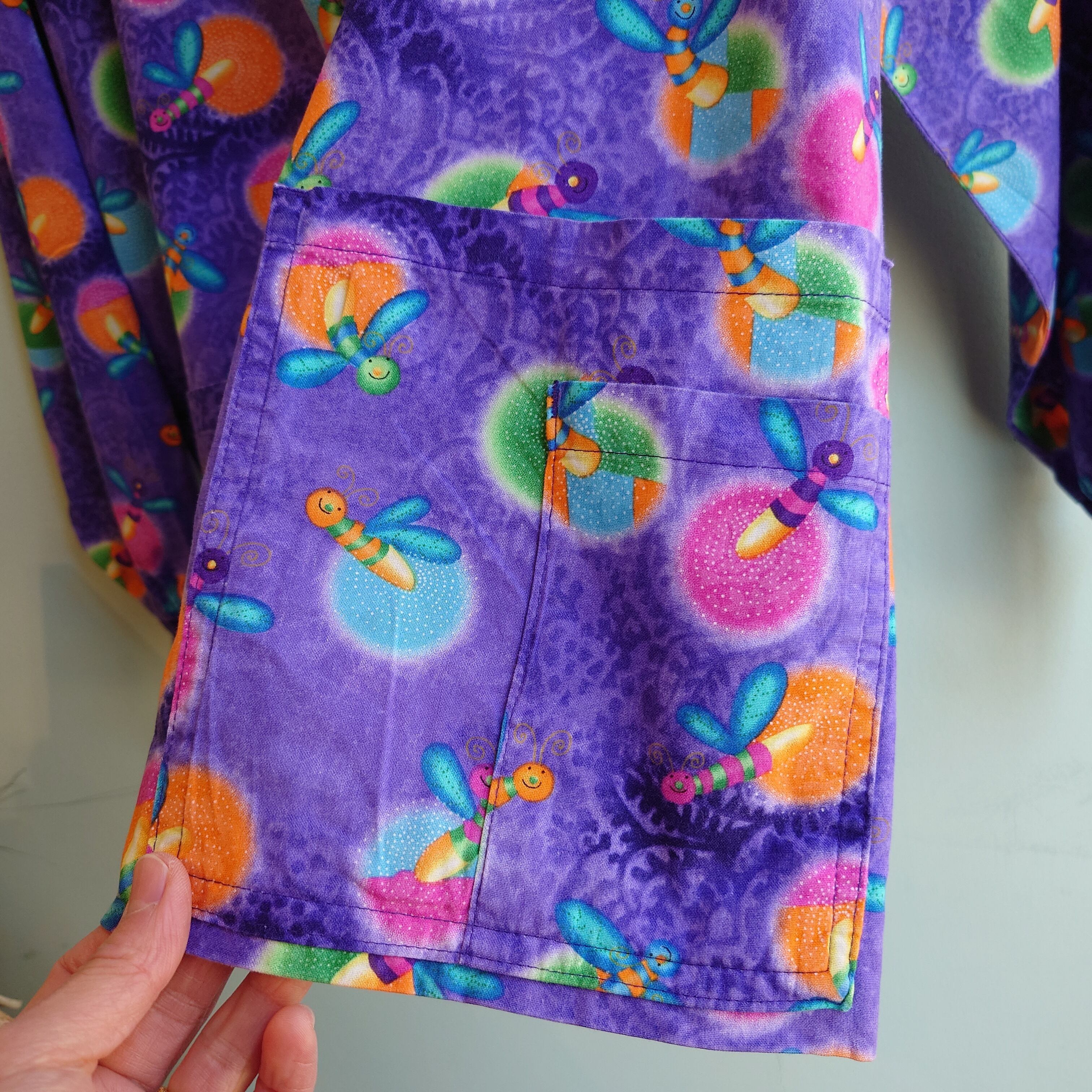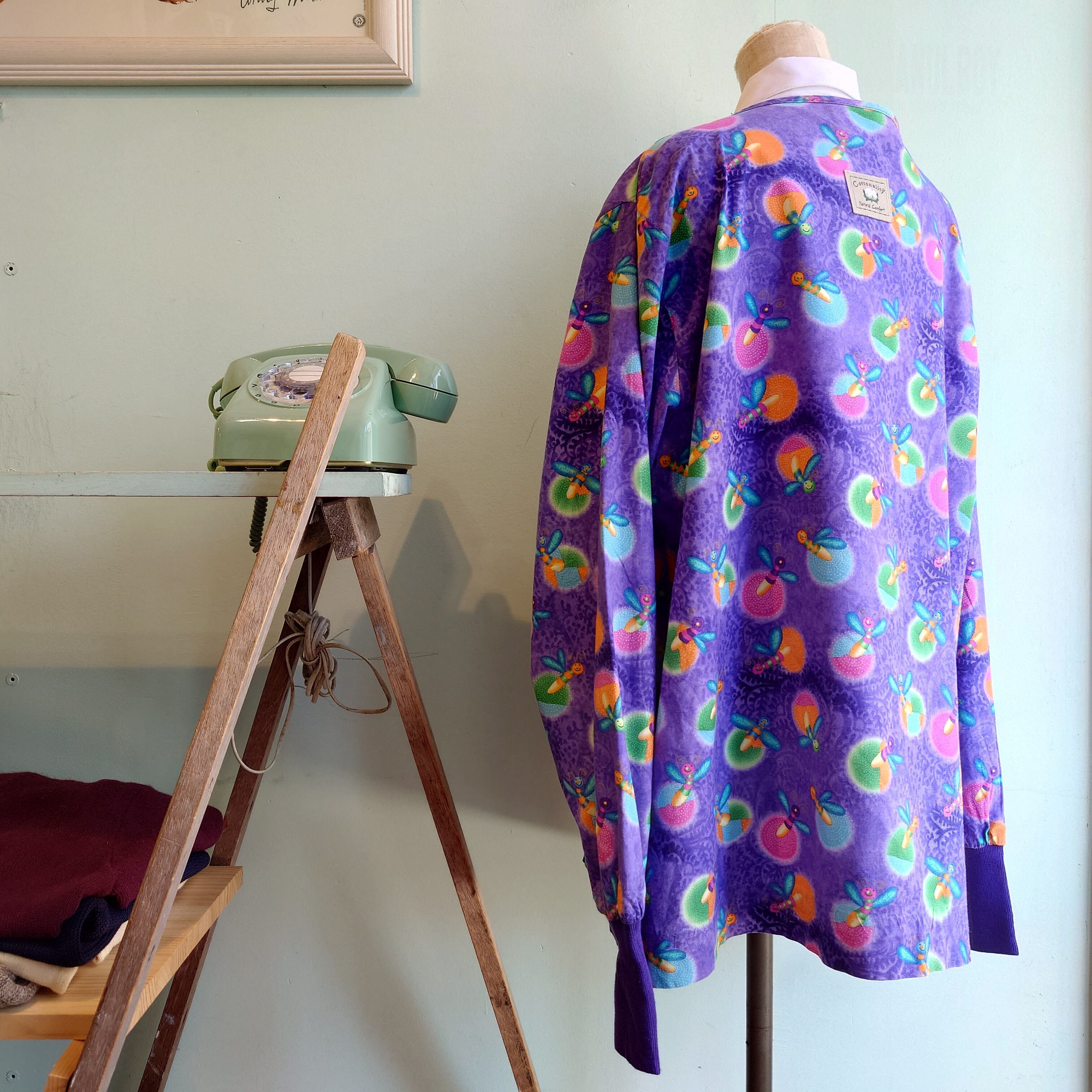 スクラブらしいパリッとした薄手素材にカーディガンシルエット、袖リブがレアなスクラブのカーディガン。小児医療系らしいポップな絵柄がキュートな一枚。ワークウエアらしいポケットの使い勝手も良し。