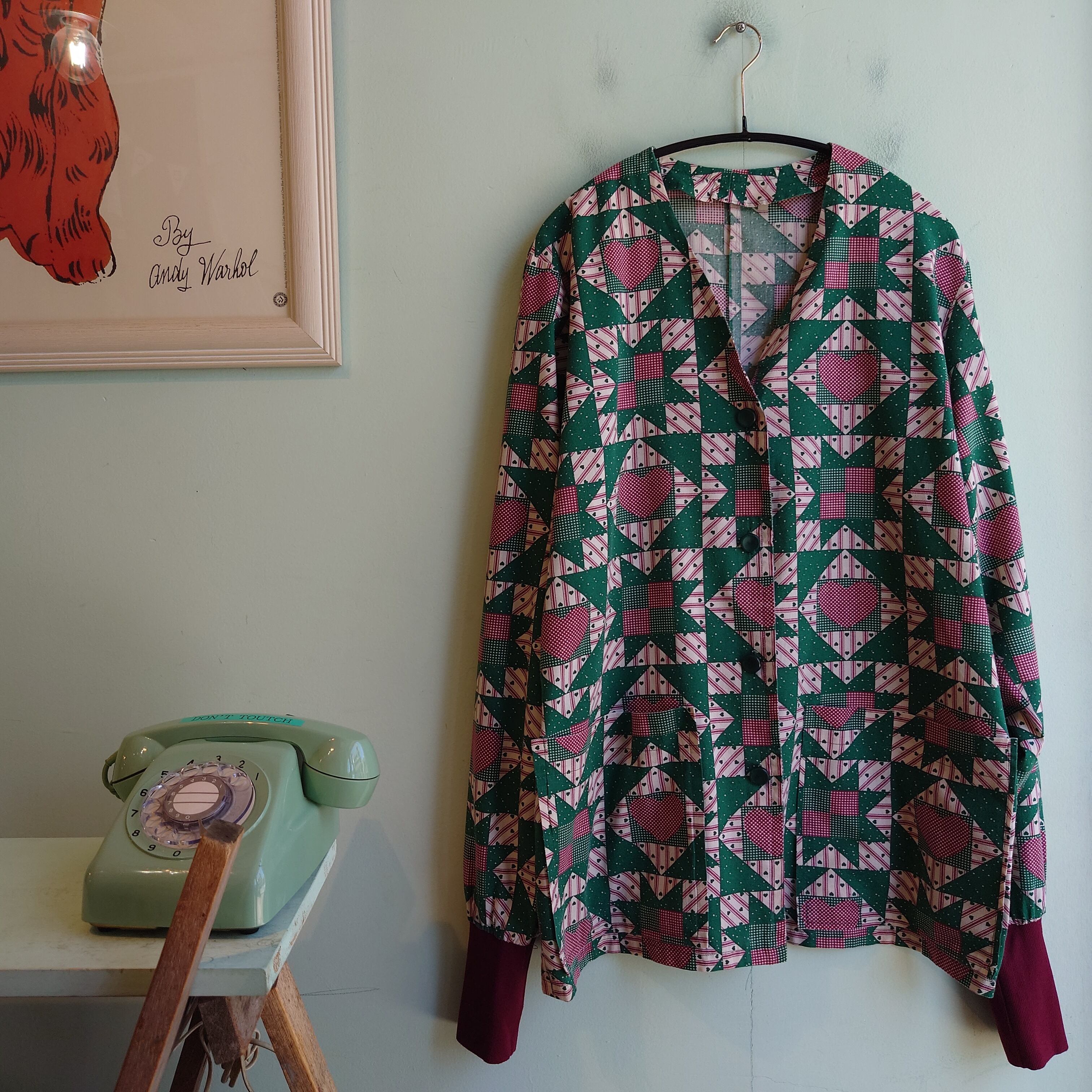 ハンドメイド系のホスピタルカーディガン。スクラブらしい薄手素材のかわいい柄の、小児医療で実際に使われていたアイテム。ワークアイテムらしい使い勝手で、カーディガンシルエットでは珍しい袖リブ、大きなポケットが機能的。古着らしい可愛さと、日本では手に入らないレアさもおすすめポイント。