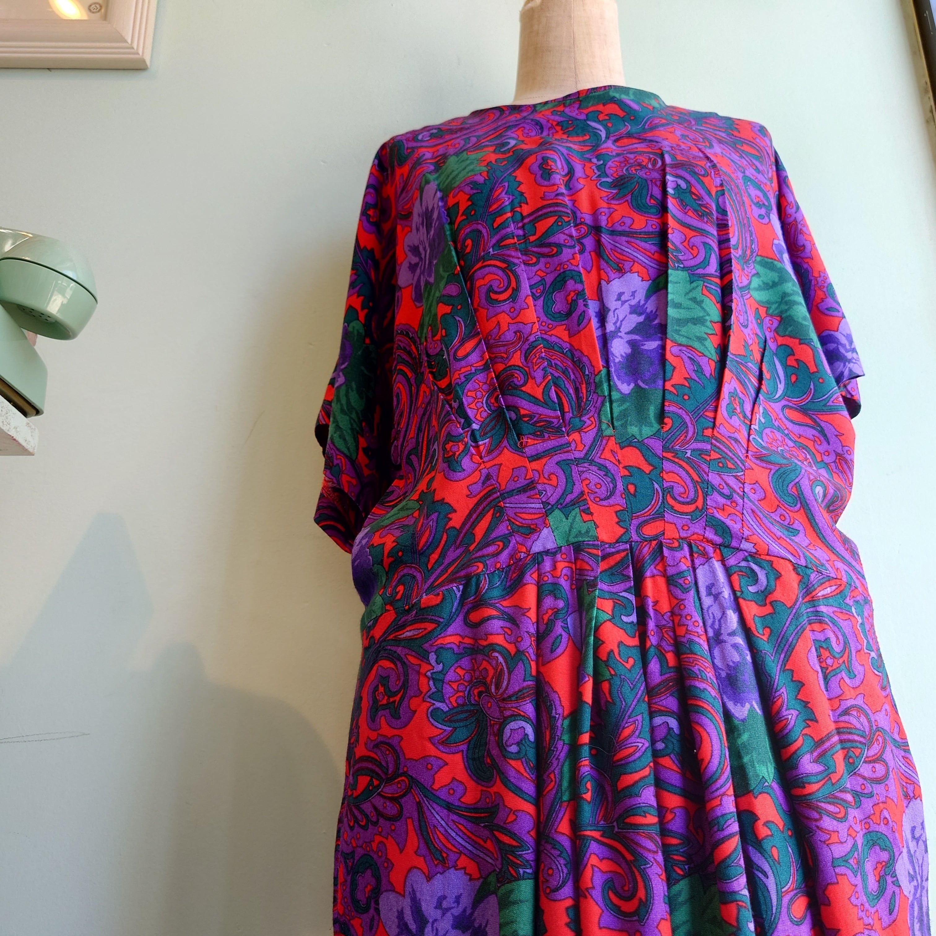 ペイズリー系の総柄のドラマチックな濃い色に惹かれる、プルオーバースタイルのヴィンテージドレス。レーヨンのテロっとした生地感と、フレア系とは一味違うレトロなコクーンが新鮮。ウエストラインを中心に、ギャザーのアクセントも素晴らしい。