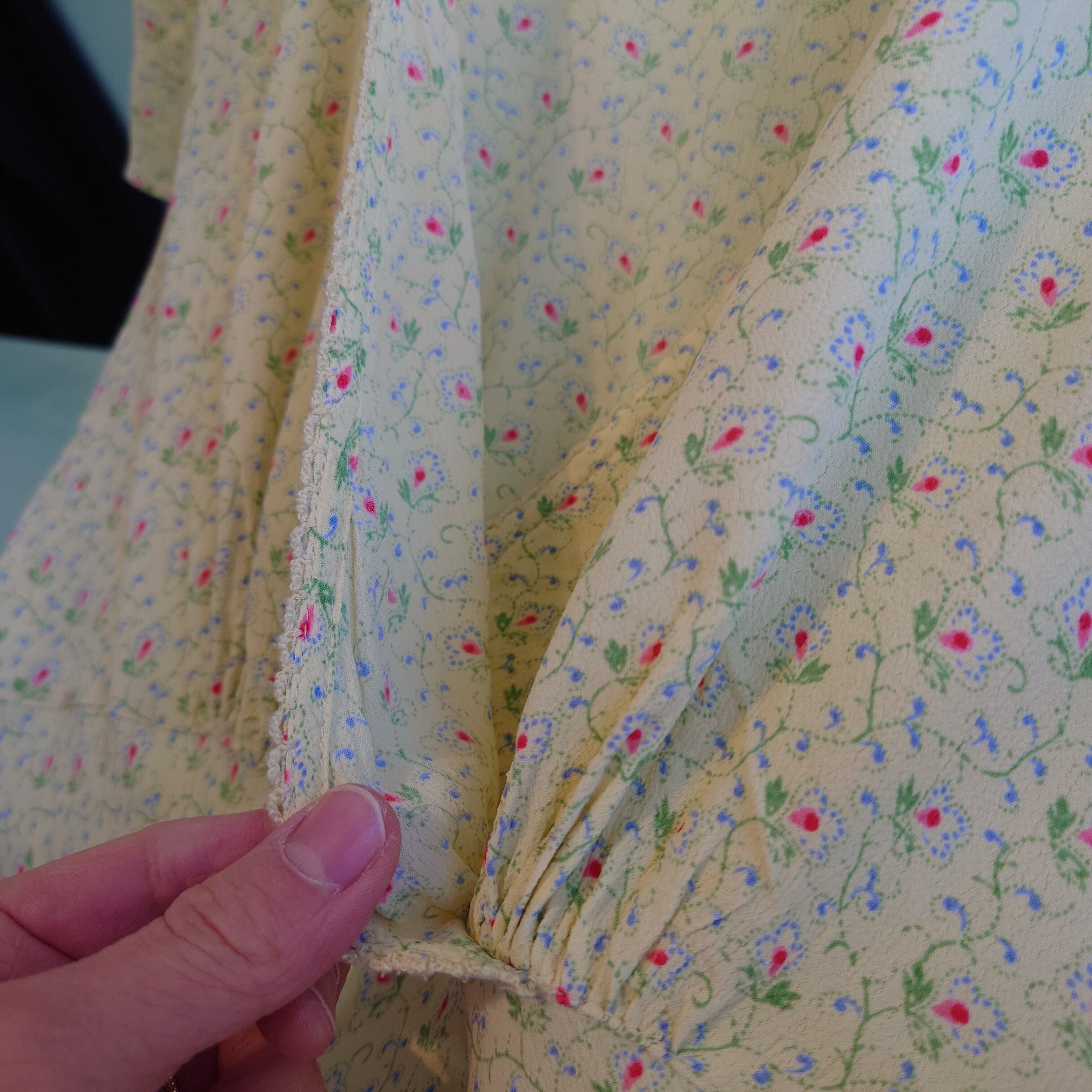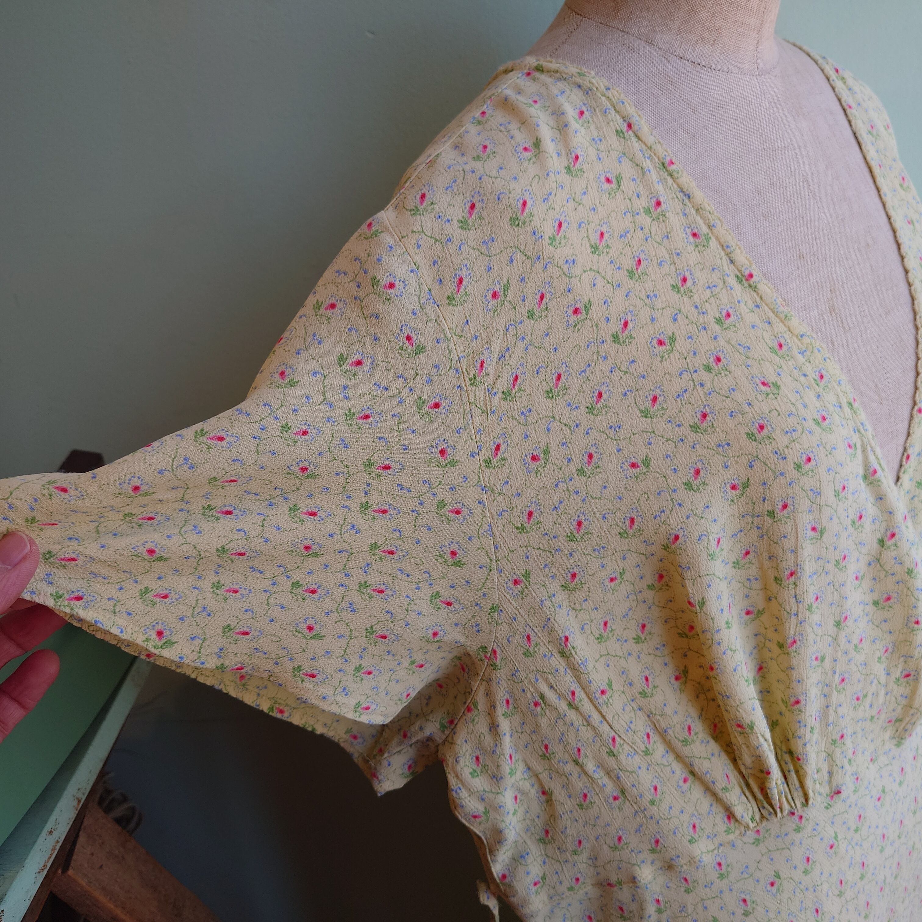 April Cornellのカシュクールワンピース。ガーゼのような絞り感のある薄手レーヨンのレモン色。カントリー風のミニマムな花柄がに、合わせのレースがフェミニン。絞りは前でも後ろでもOK、チューリップ風にフレアするグットシルエットです。