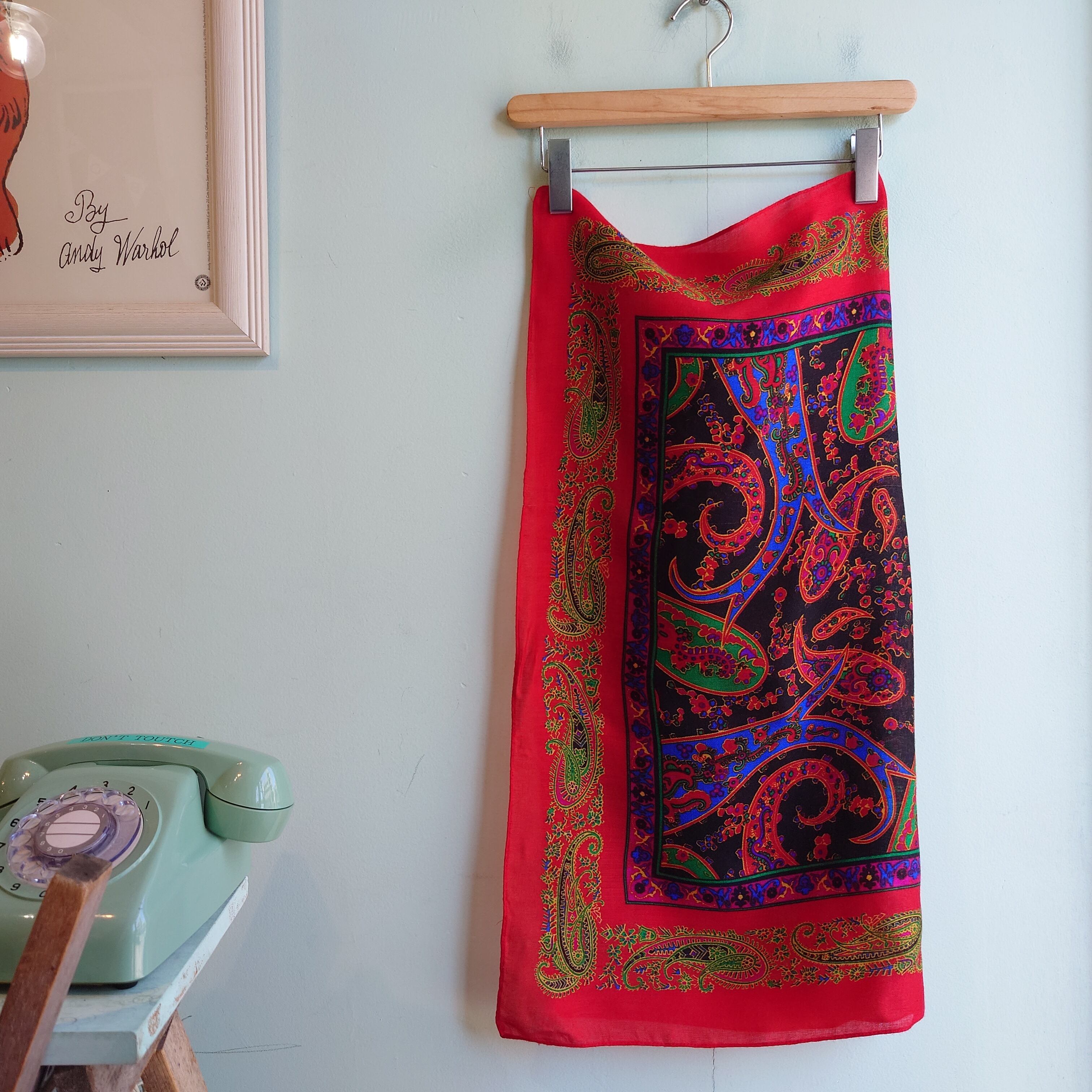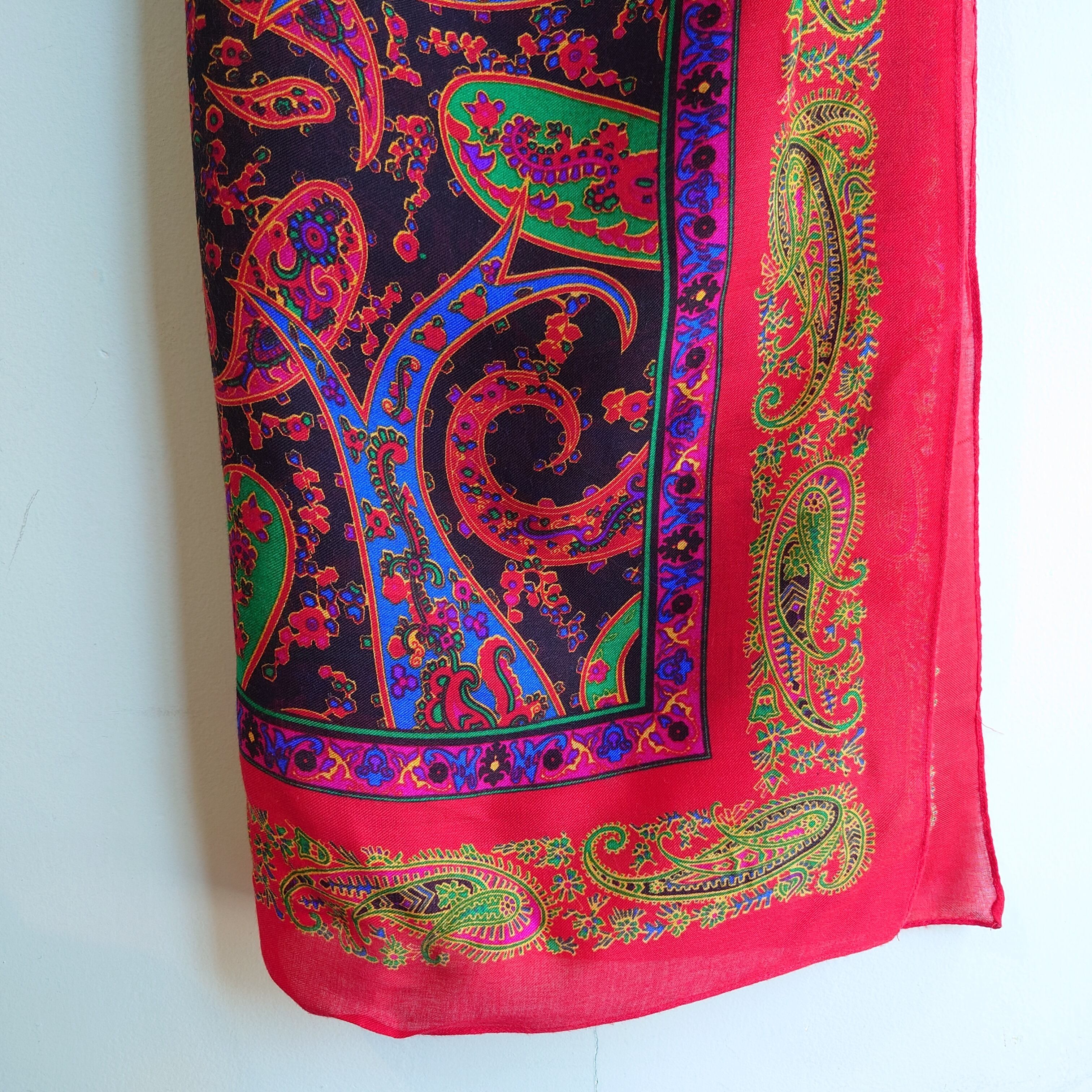 バンダナをオーバーサイズにしたような、ペイズリー柄のヴィンテージスカーフ。対立するカラフルな色合いもスカーフならあり、存在感ある1枚です。ほんのりガーゼのようなサラッとザラッとした風合いがレトロ。