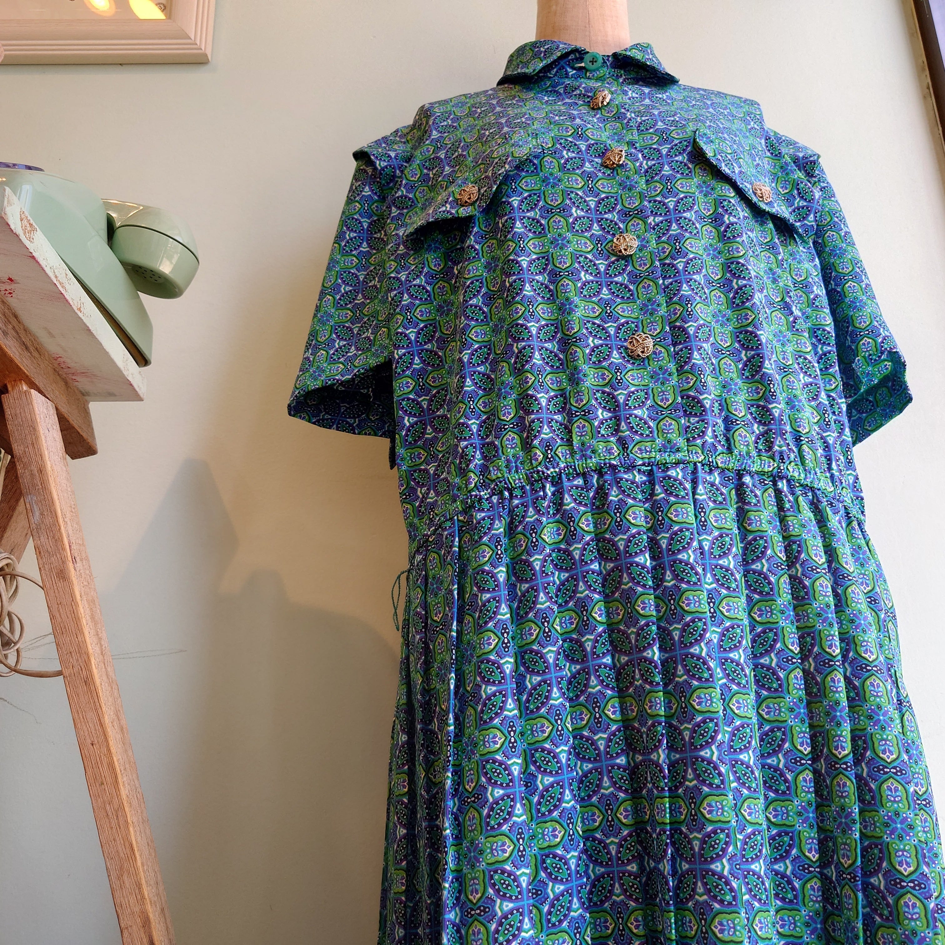 名門、レスリーフェイのヴィンテージドレス。ペイズリー系の総柄が規則正しいレイアウトで並んだ、幻想的な総柄が美しい1枚。緩めストレートのストンとしたシルエットながら、プリーツでひらひら広がる様が絶妙。肩周りのひだや飾りボタンなど、ガーリー要素もたくさん。