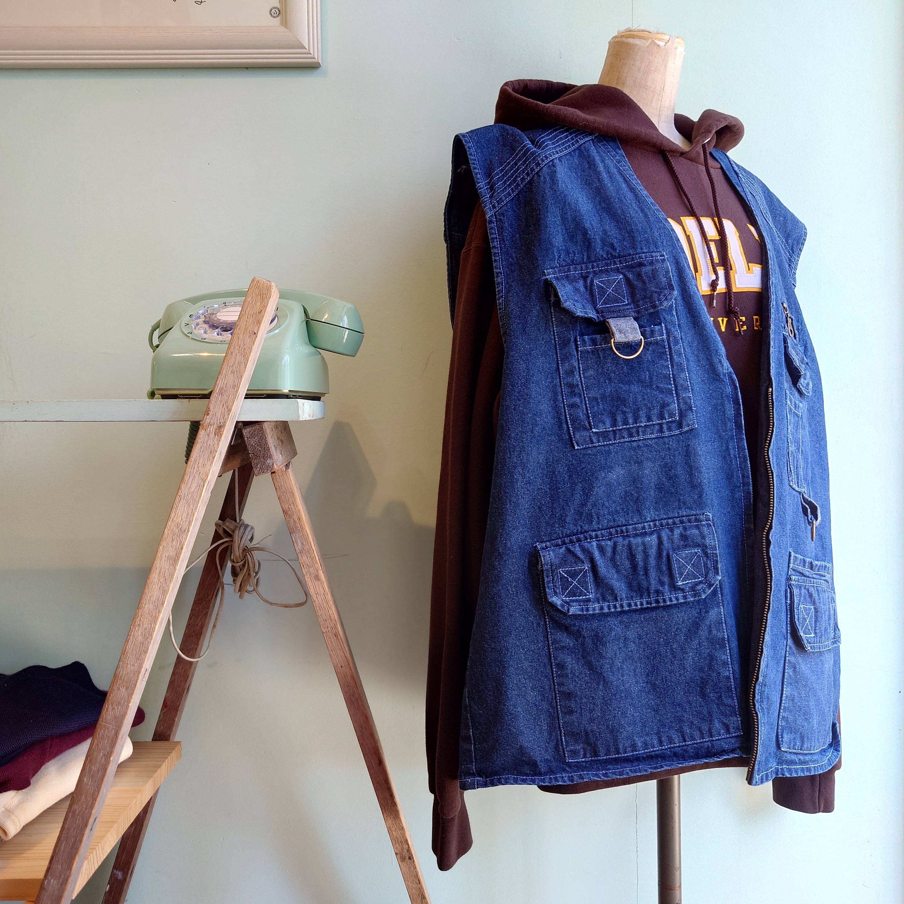 シューティングやフィッシング系のデザインのベストを、ワンウォッシュ程度のデニム素材で再構築した珍しい1枚。襟周りのドレッシーなカーブや、青いステージ、アシンメトリーなポケットなど、デザインの一つ一つにこだわりあり。合わせれば意外にきれいに収まるシルエットも絶妙。一味違うデニムアイテムです◎