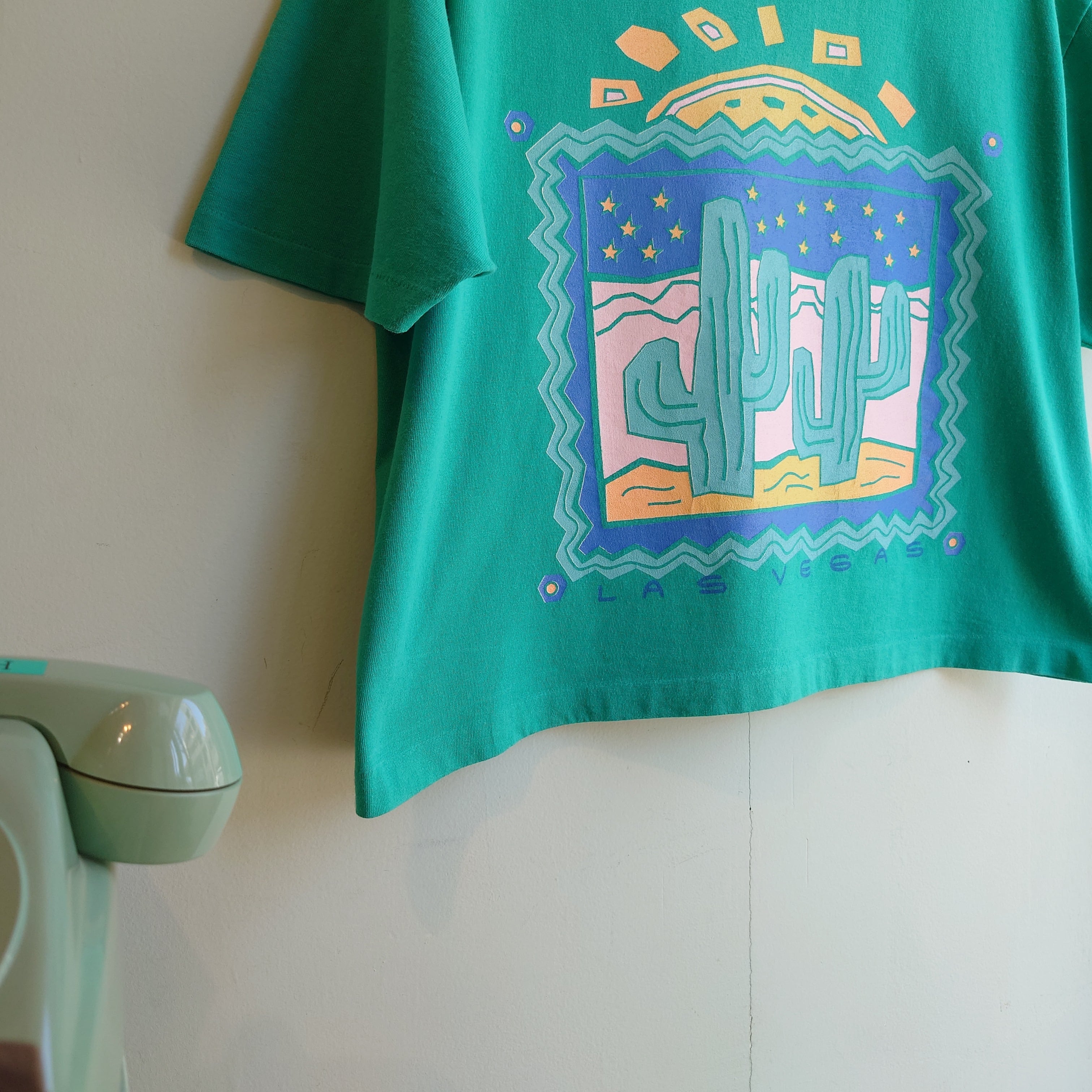 エメラルドやミントに近い中性的なグリーンに、ゆるいタッチの砂漠がレトロなラスベガスのスーベニアTシャツ。ヴィンテージでは珍しい、オリジナルでクロップド丈が可愛すぎる。ワイド&ショートな80sシルエットです◎。風合いの良いシグナルのコットン素材もおすすめポイント。