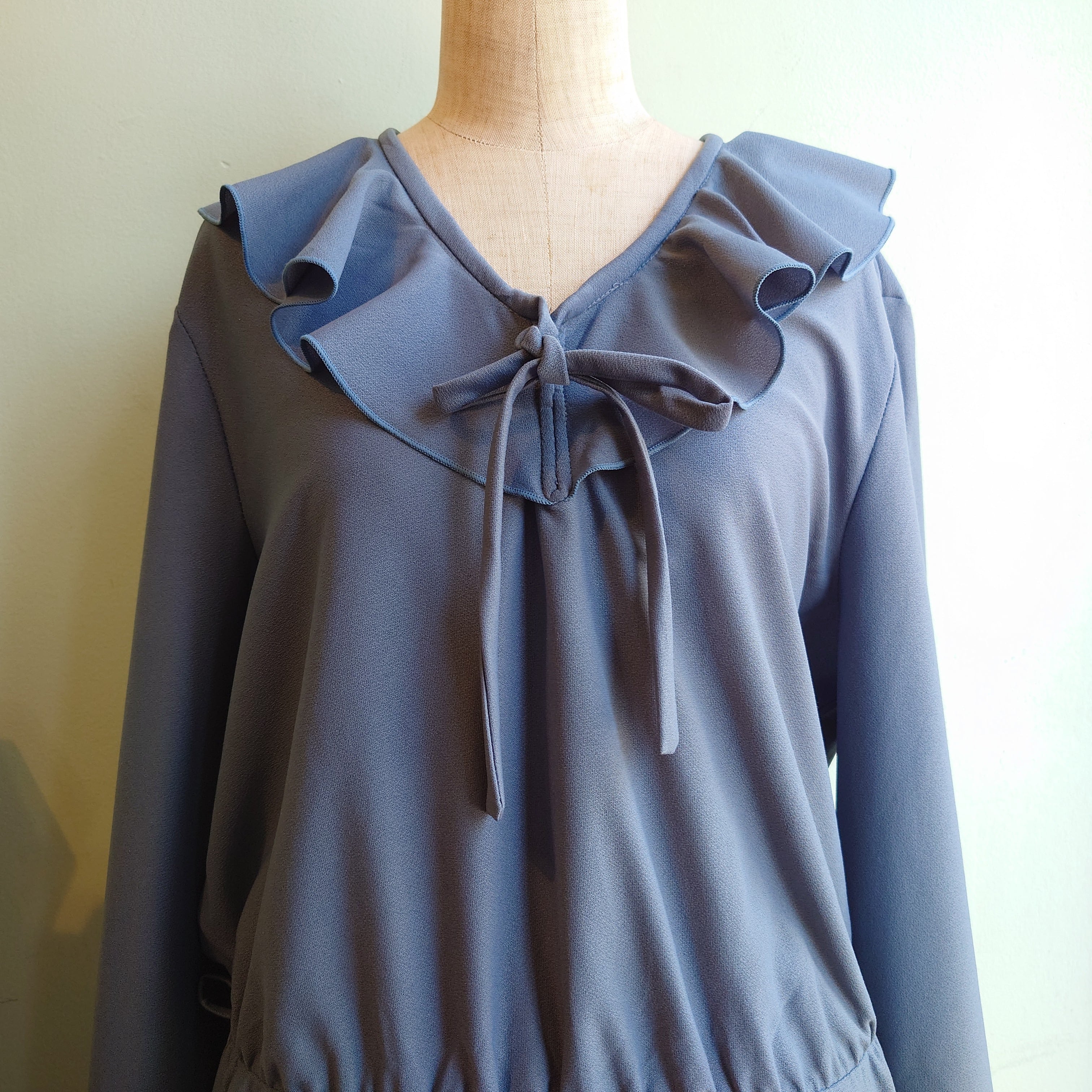 ラッフルカラーに胸元のリボンタイが付いた英国製のヴィンテージドレス。ゆったりと広がるフレアシルエットと、くすみブルーのアンニュイさがいい。ザラッとしたタッチのポリ系素材で、オールシーズン寒色が生きるドライな雰囲気も。