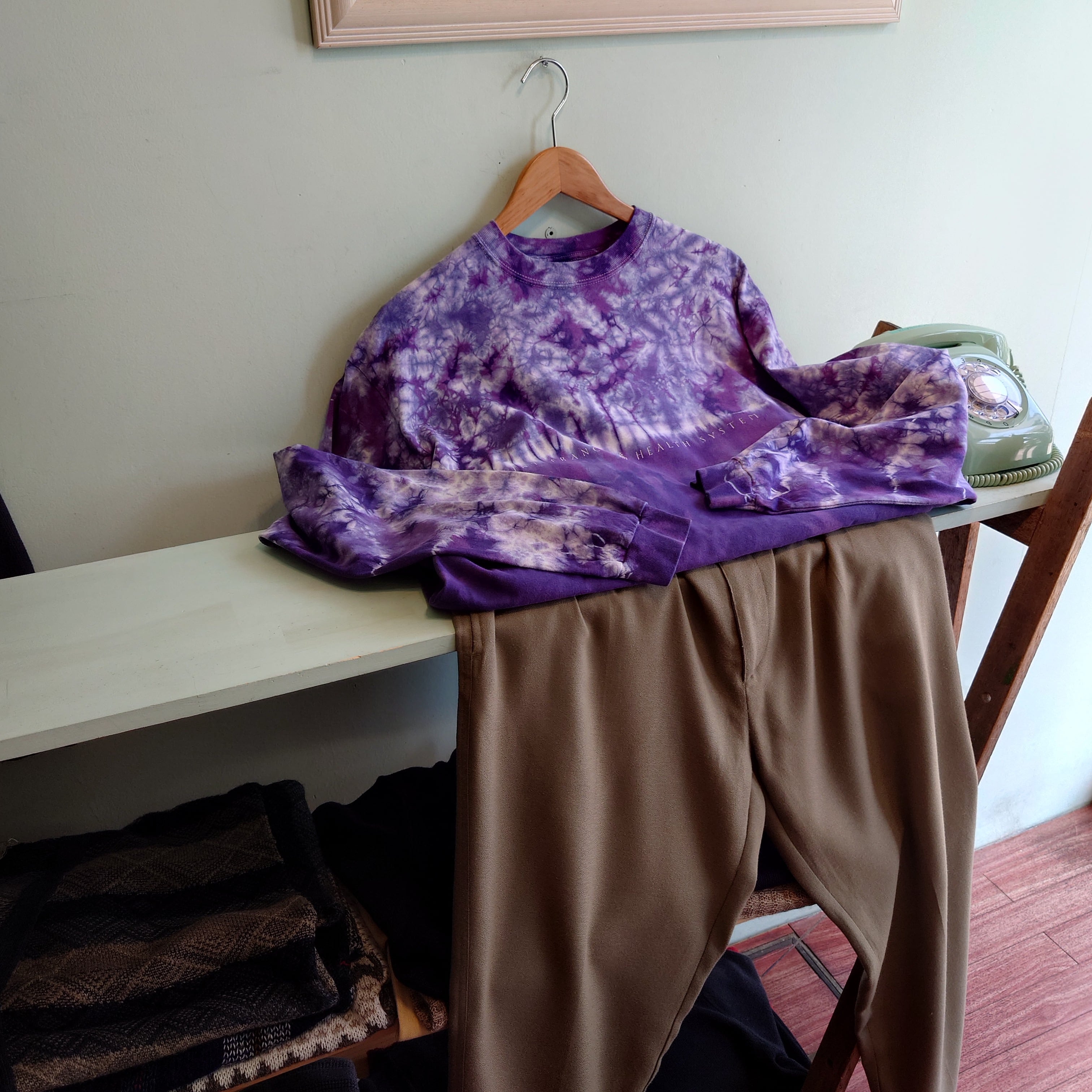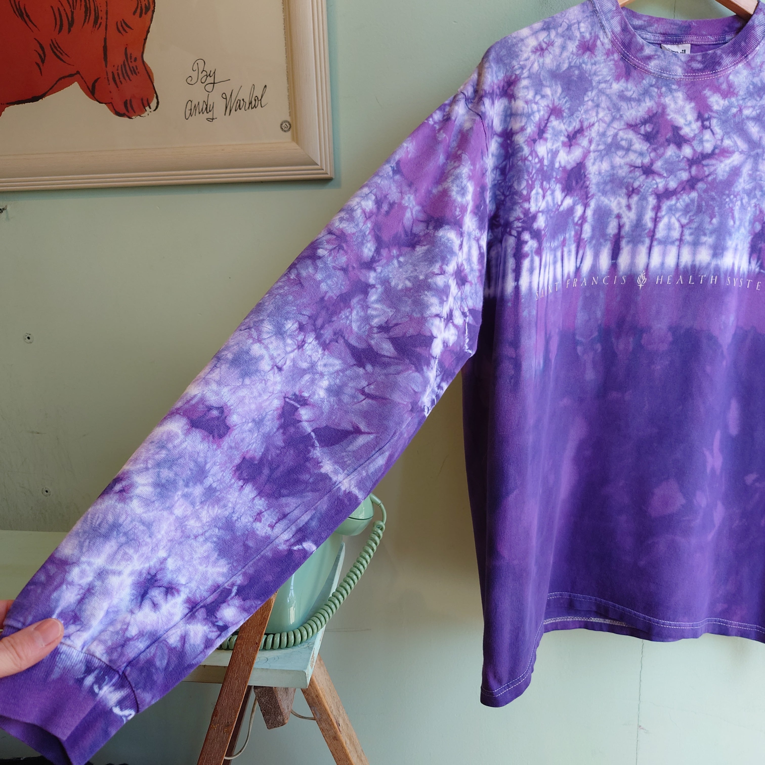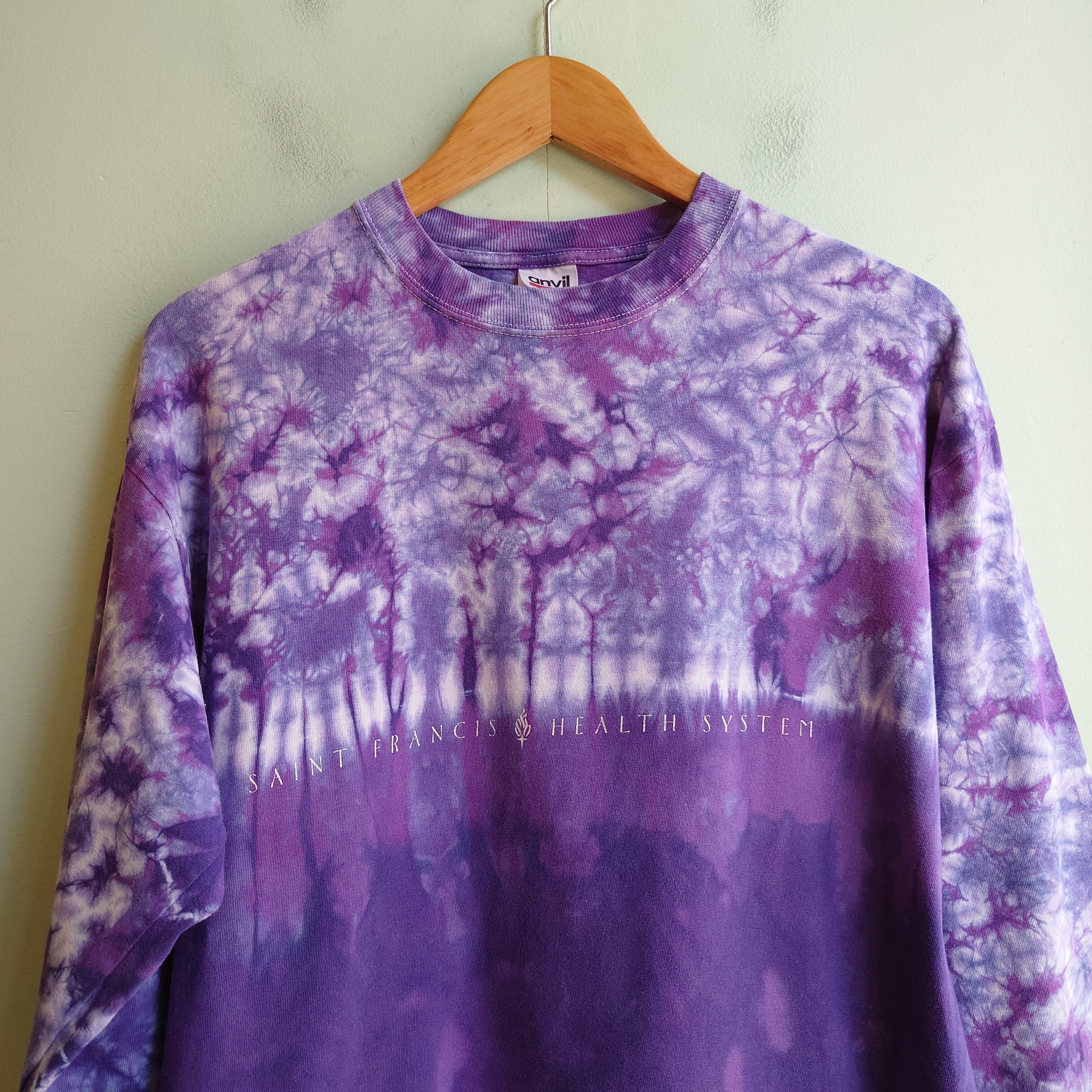 トップと袖周りは明るめに、ボディーしたは濃い目に、パープルのタイダイがグラデーションする芸術的なタイダイTシャツ。ロゴはオクラホマ州をのカトリック系の医療団体のもの。アートライクなタイダイと、シンプルなロゴのコントラストが珍しい1枚。