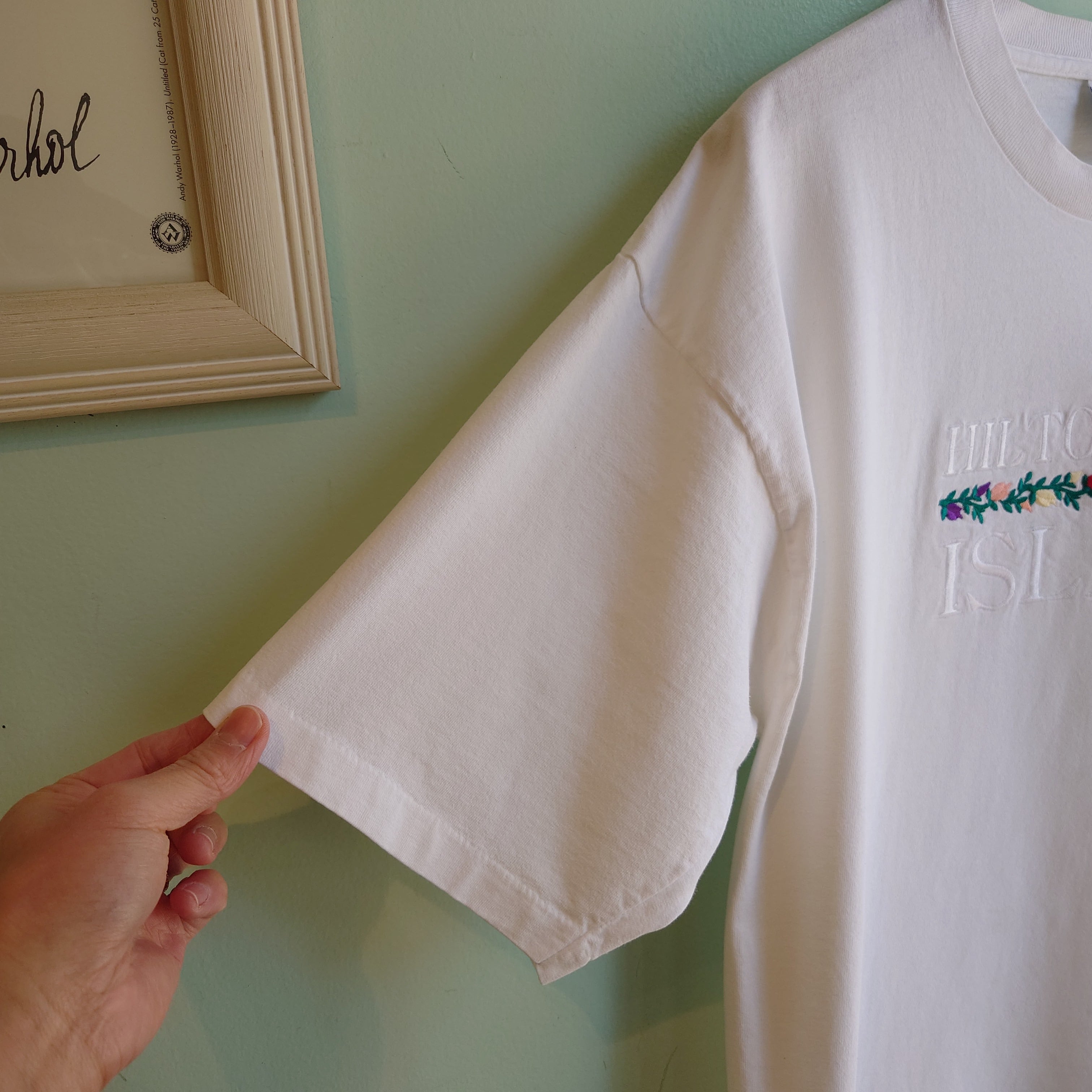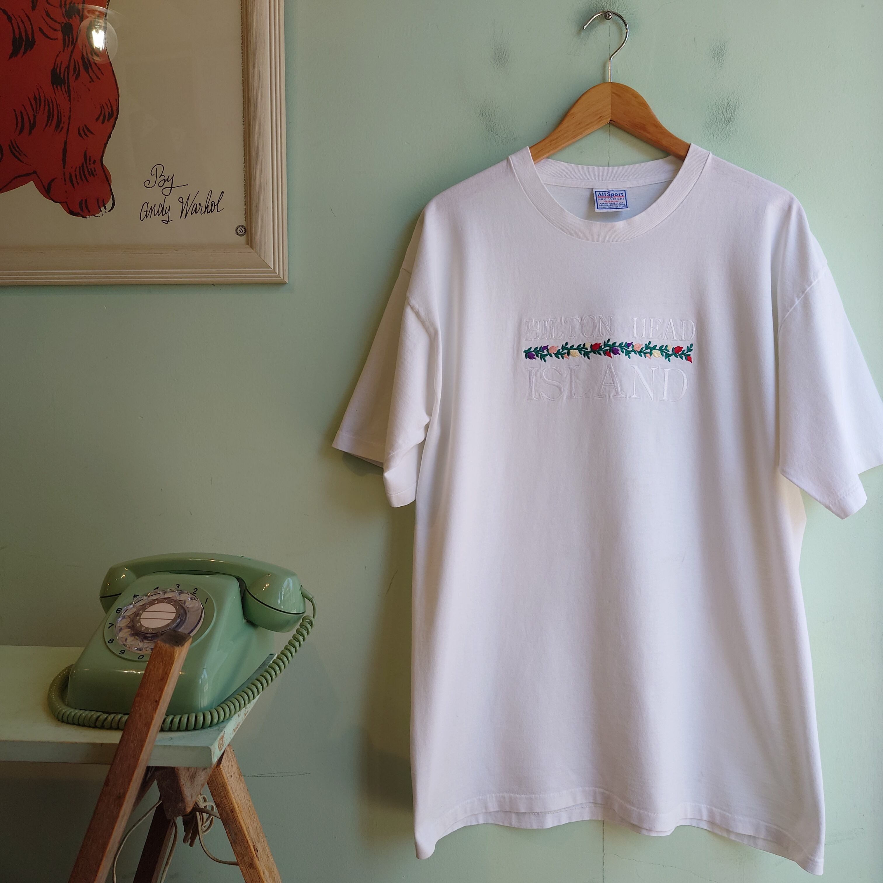 サウスカロライナ州のリゾート、ヒルトンヘッドアイランドのヴィンテージスーベニアT。ホワイトに純白の糸目のロゴ、カラフルなリースをモチーフにした刺繍がガーリー。白Tながらガッシリとしたヘヴィー素材なので、1枚で着たいお客様にもおすすめです。