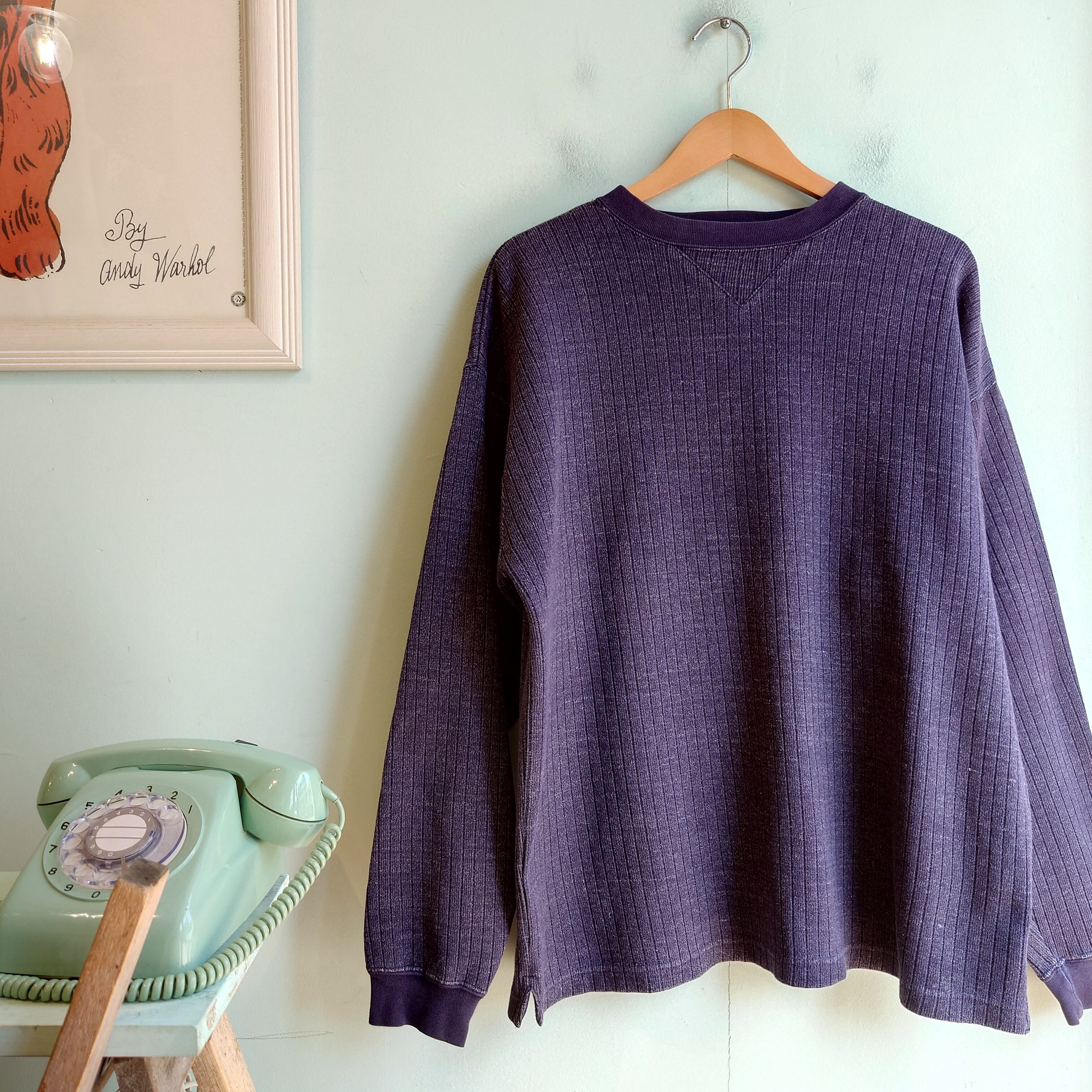 ロンT以上、コットンニット未満、裏地なしの絶妙な暑さが使える、リブ編みのカットソー。ネイビーに白の杢が入ったくすみ感に、ガゼットの存在感がかわいい。サーマルよりざっくり着られて軽さもある独特な世界観で、ユニセックスな雰囲気も癖になりそう。
