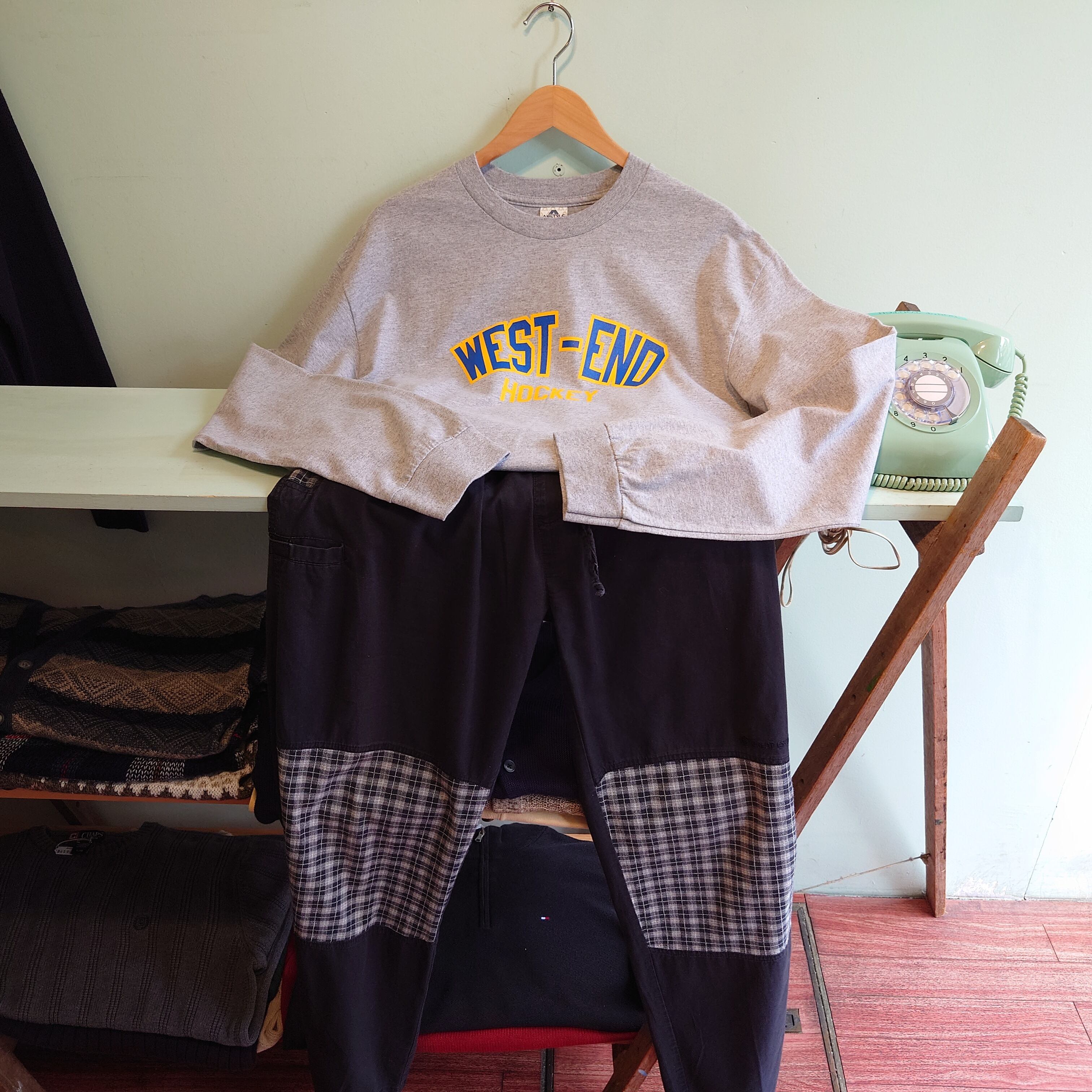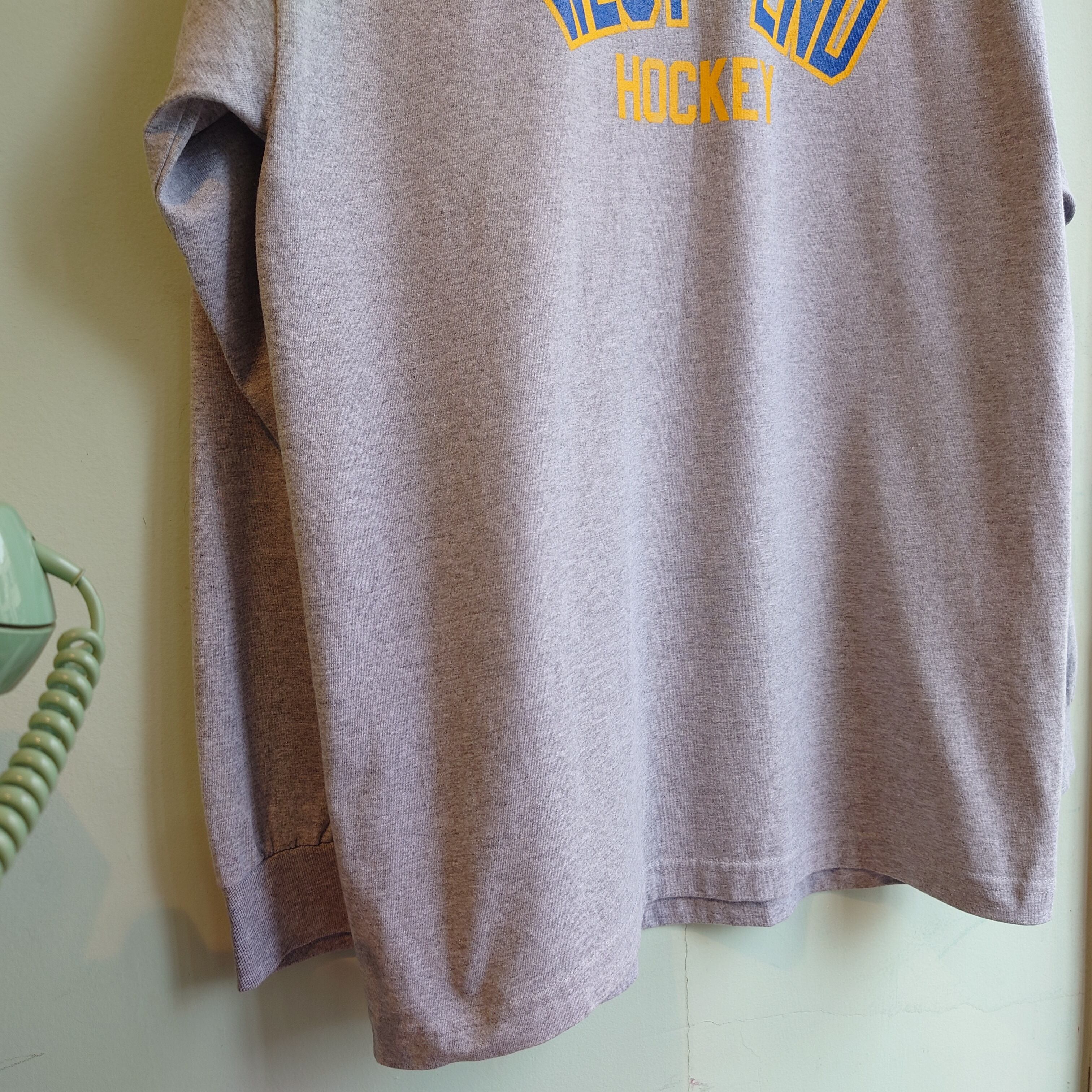 カレッジ系、ホッケーチームのロングスリーブTシャツ。杢グレーにポップなロゴ、バックプリントはジョーク入り。ボディーはalstyleのしなやかだけどしっかりした生地にざっくり感の、これぞ古着のロンT的なかっこよさ。スタンダードでシーンを選ばないプリントロンTです。
