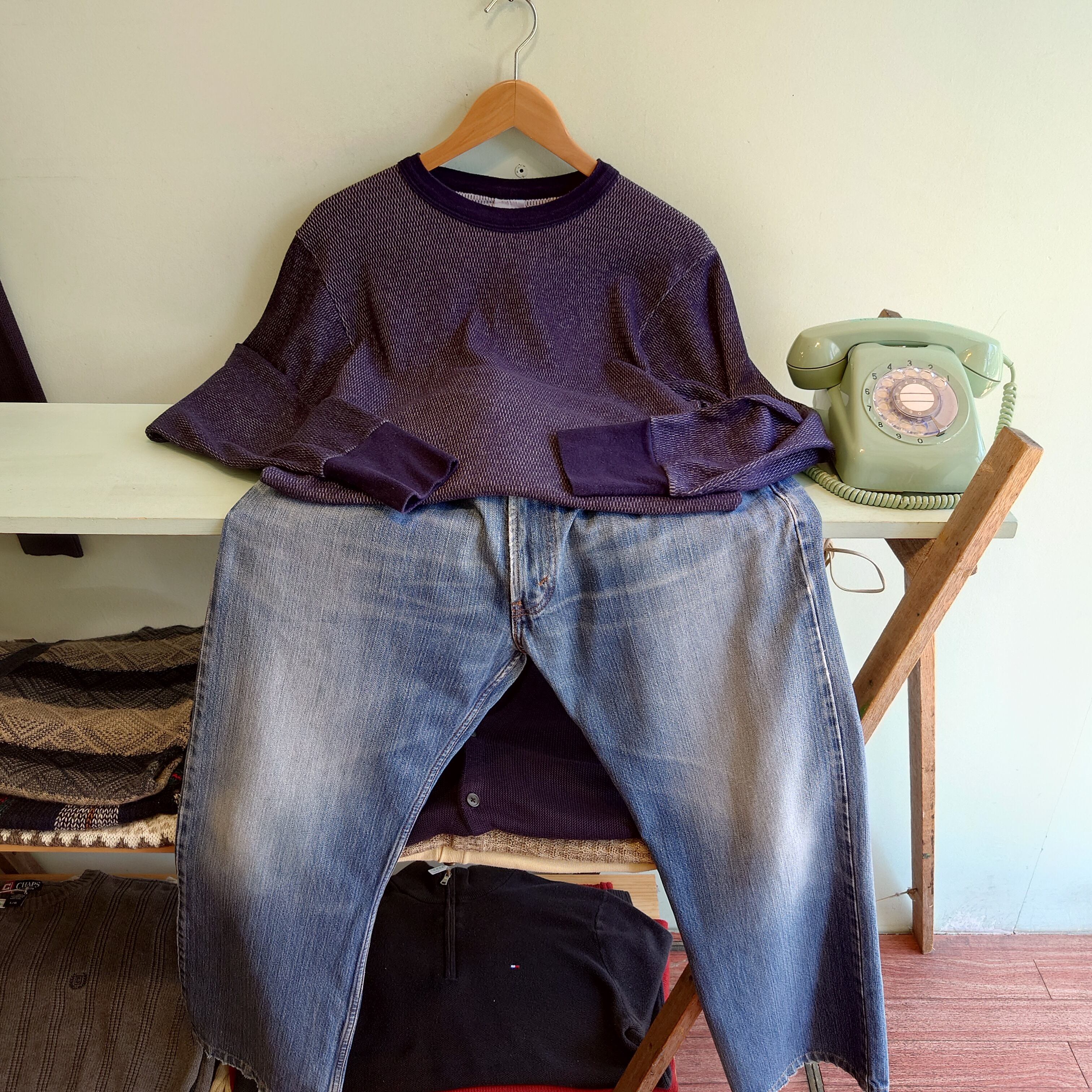 白地にハニカム状のネイビーが交差する、オールドタイプのサーマルカットソー。不思議な立体感がインナーに、一枚でも存在感あり。ジャンル的にモーガンやヘインズ様なタイト系ですが、それよりもタイトすぎない絶妙な所◎。またユニセックスな雰囲気でレディースコーデにもおすすめ。