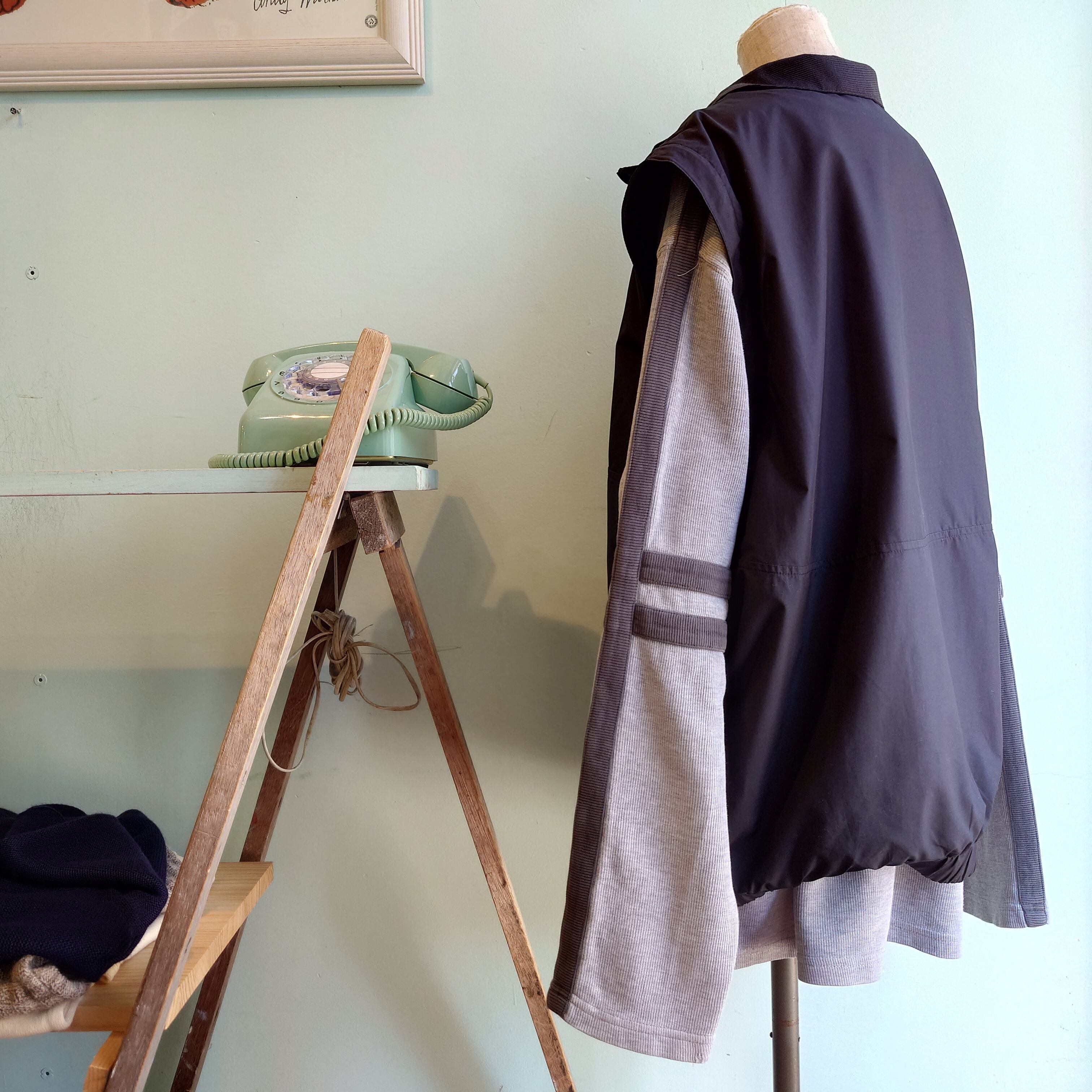 冬場の風よけから、半袖とのレイヤードまで、オールシーズン使えるプルオーバータイプのベスト。こちらはハーフジップ周りが凝ったデザインで、ポケットの配置や素材の切り替えがアウトドアライク。オールブラックならではのスタイリッシュさも魅力。