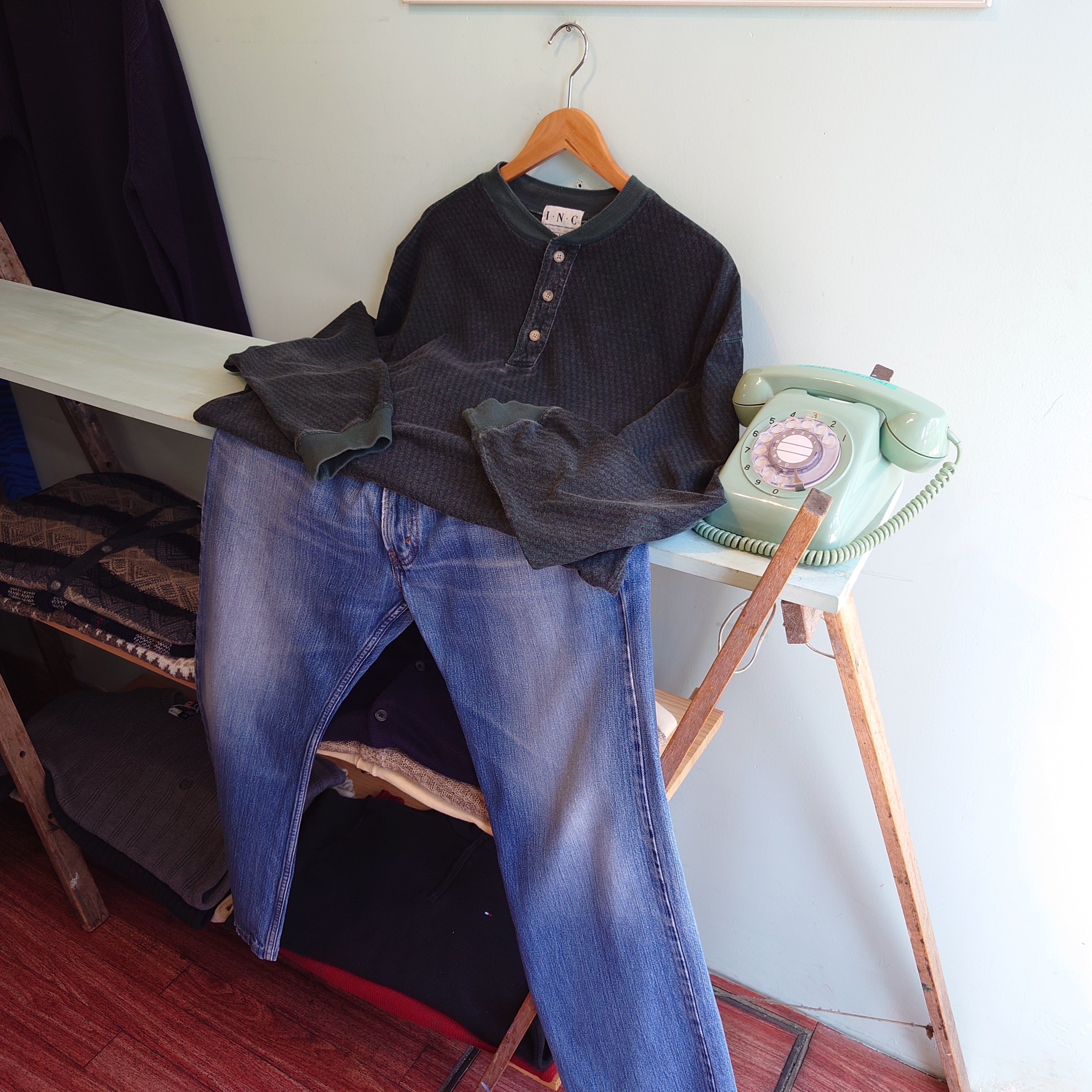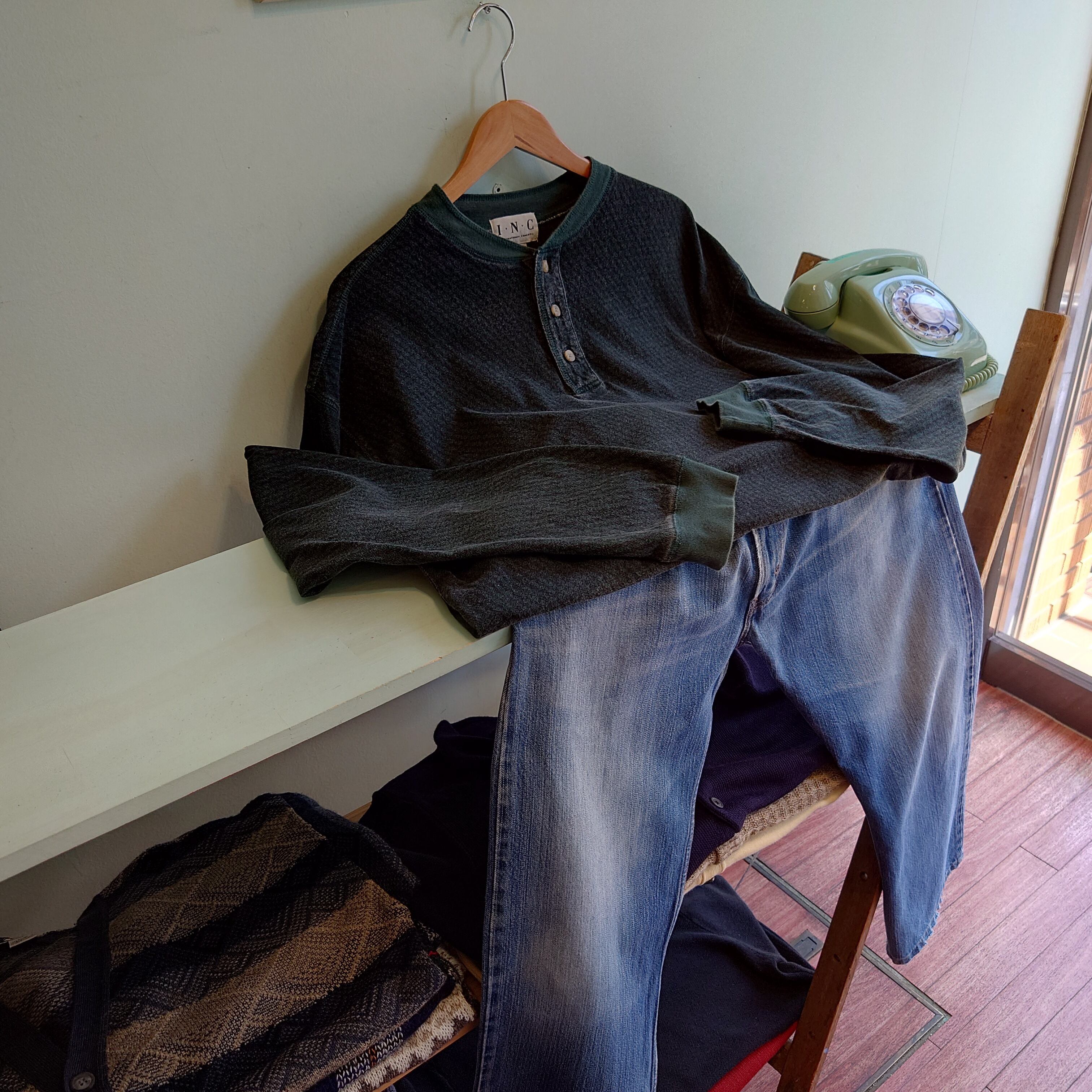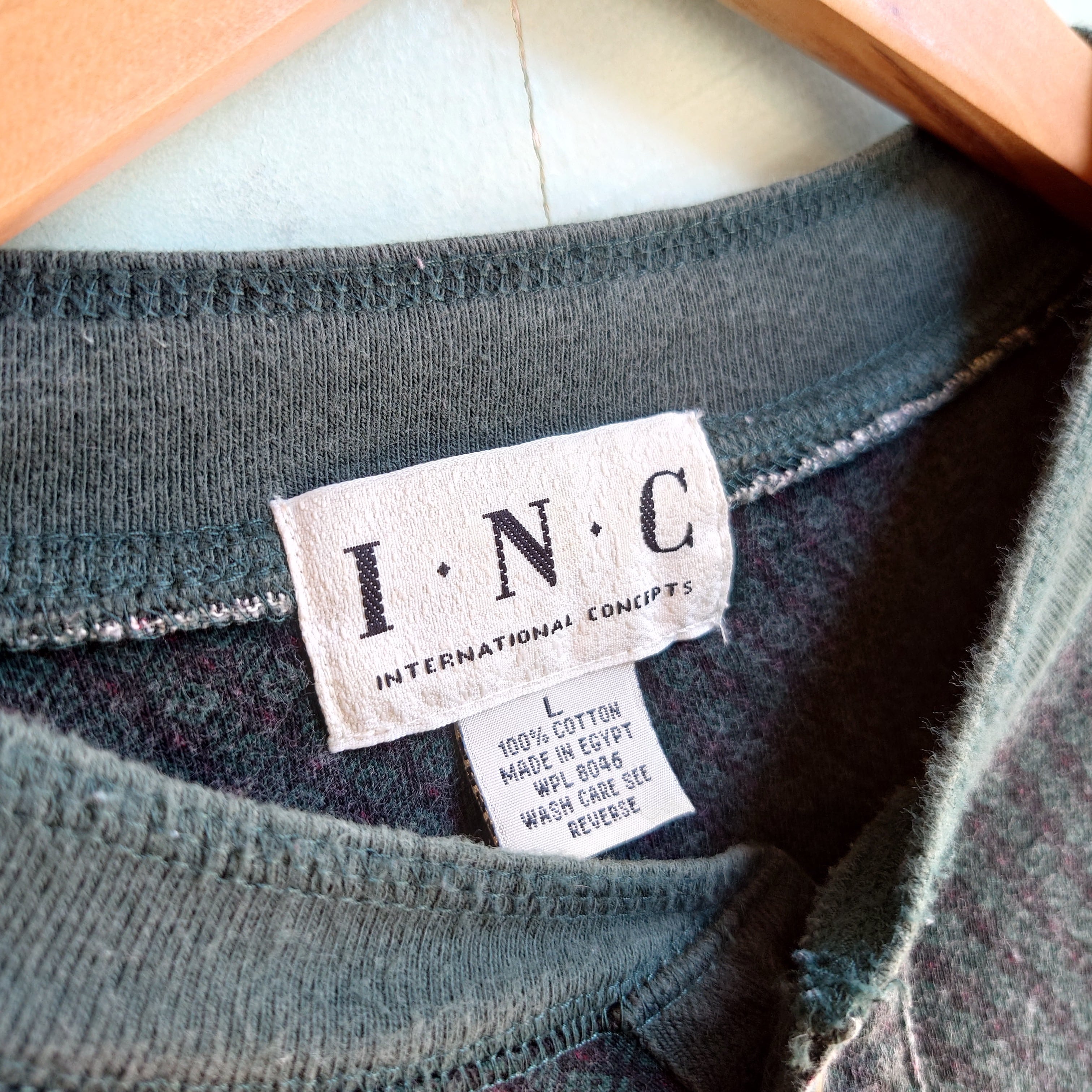 米大手百貨店Macy'sのストアブランド、I.N.Cのヘンリーネックカットソー。ダークグリーン×ブラックに、レッドが印象的。ドレッシーな柄シャツ的な総柄なのに、味わい深いコットン素材なのも面白い。ドレッシーで真逆のナチュラルさを感じられる変わり種アイテムです。