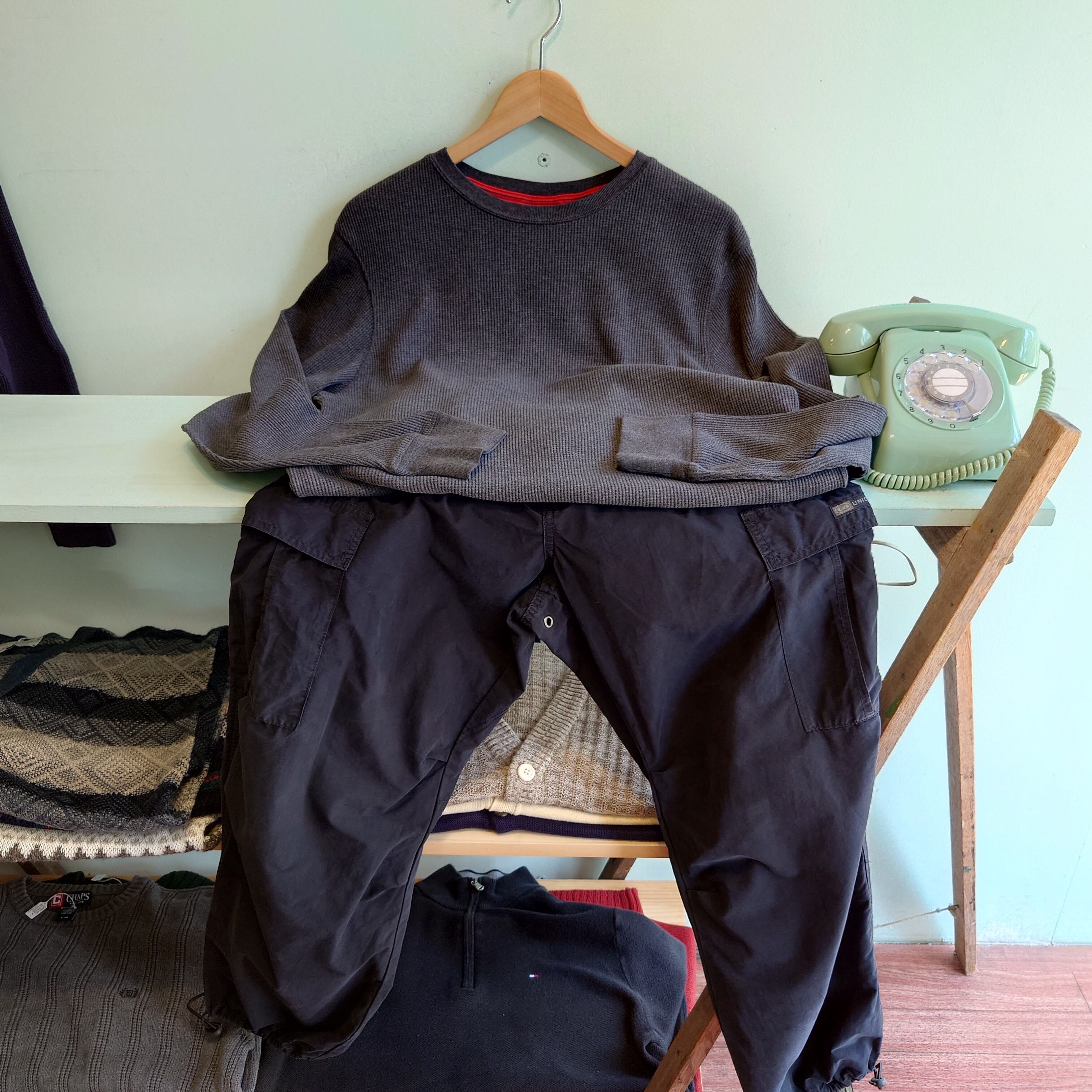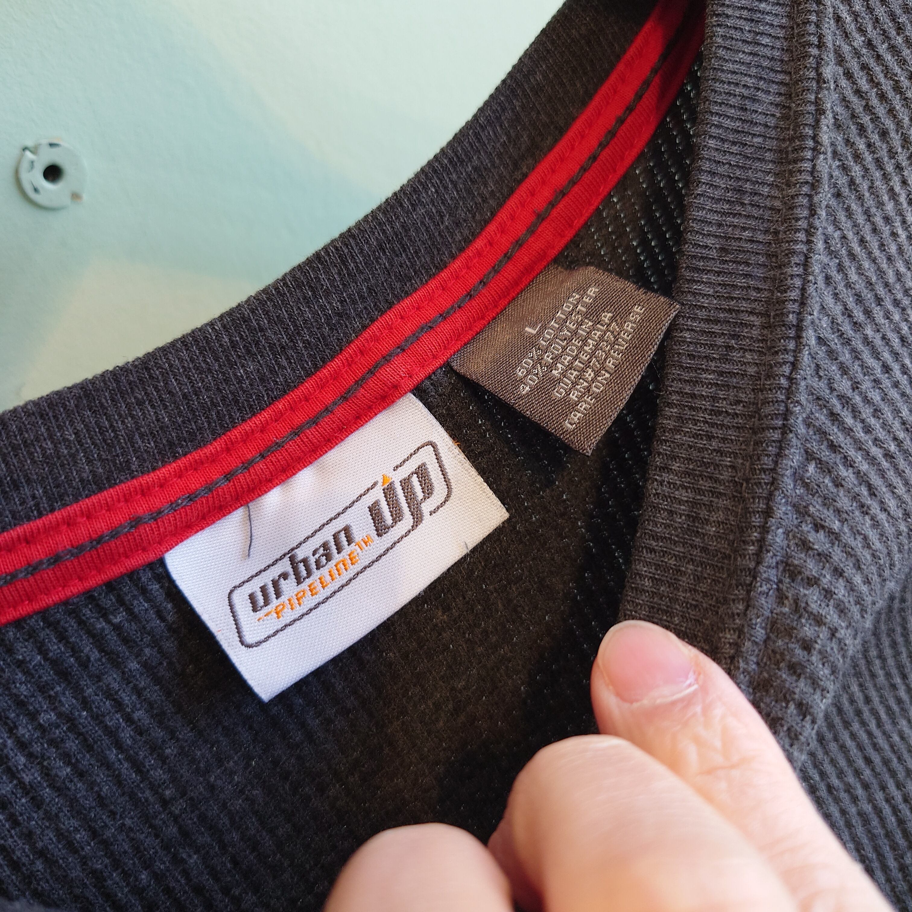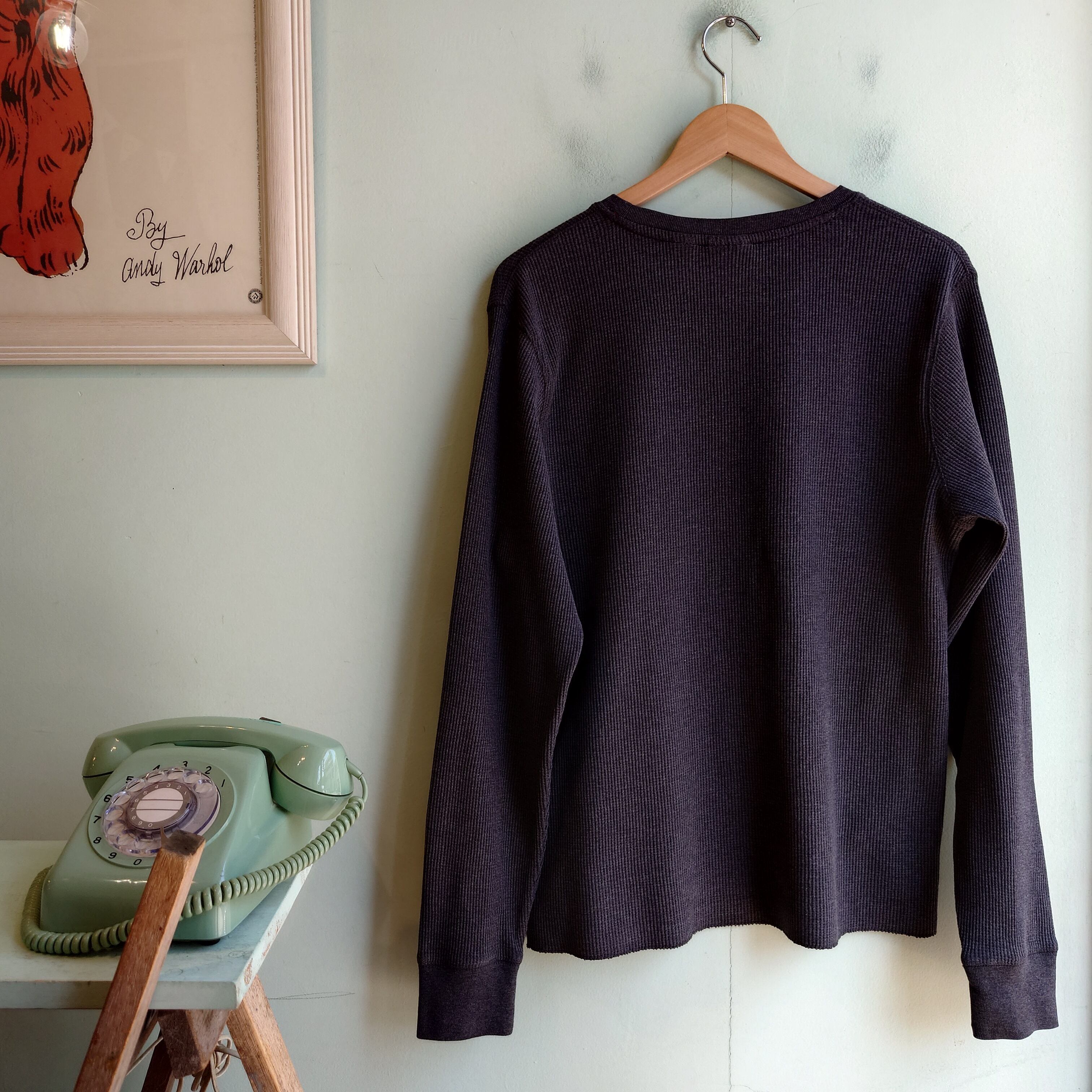 米国チェーンストア、コールズのプライベートブランド:Urban Pipelineのサーマルカットソー。襟裏に付けられた赤が効いた一枚で、裾下のロゴもかっこいい。シンプルに見せかけて一筋縄では行かないダークグレーです。