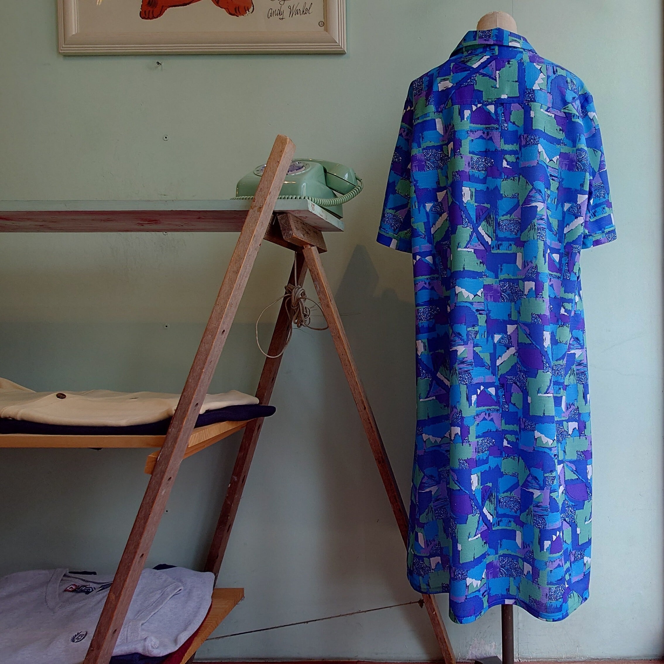 70s スタプレ系のプルオーバードレス。ペイズリー柄を刷毛で塗りつぶしたような独特な幾何学柄と、独特な青系も素晴らしい。オープンカラーにストンとしつつフレアするレトロなシルエットも◎。ボトム合わせもおすすめなタイプです。