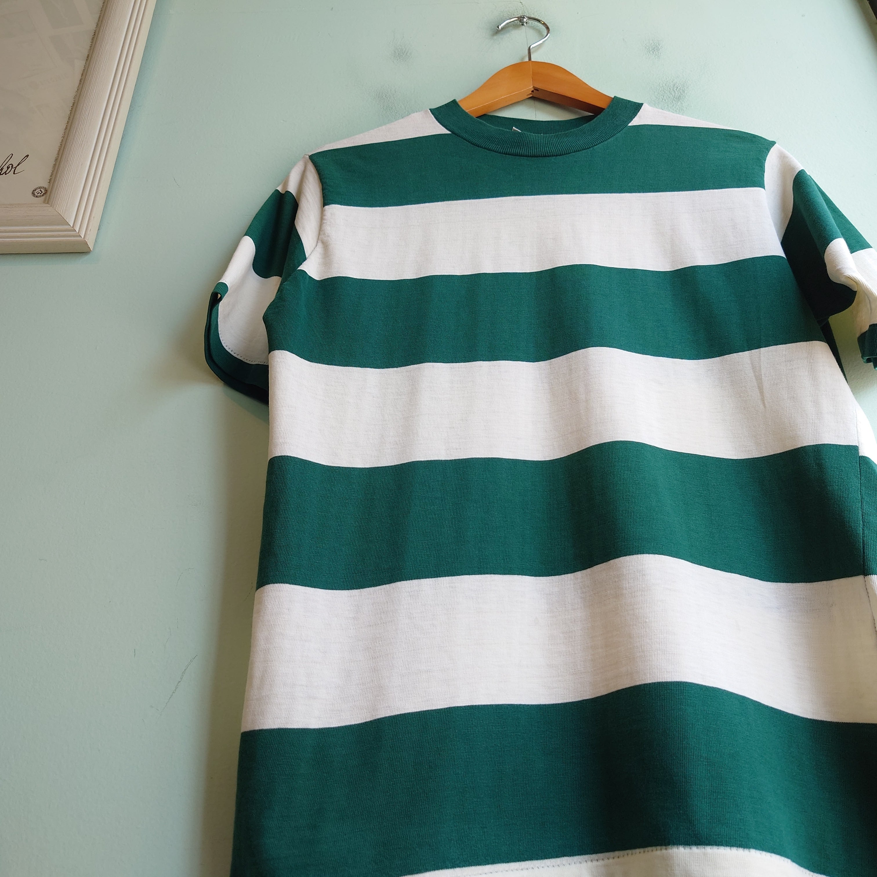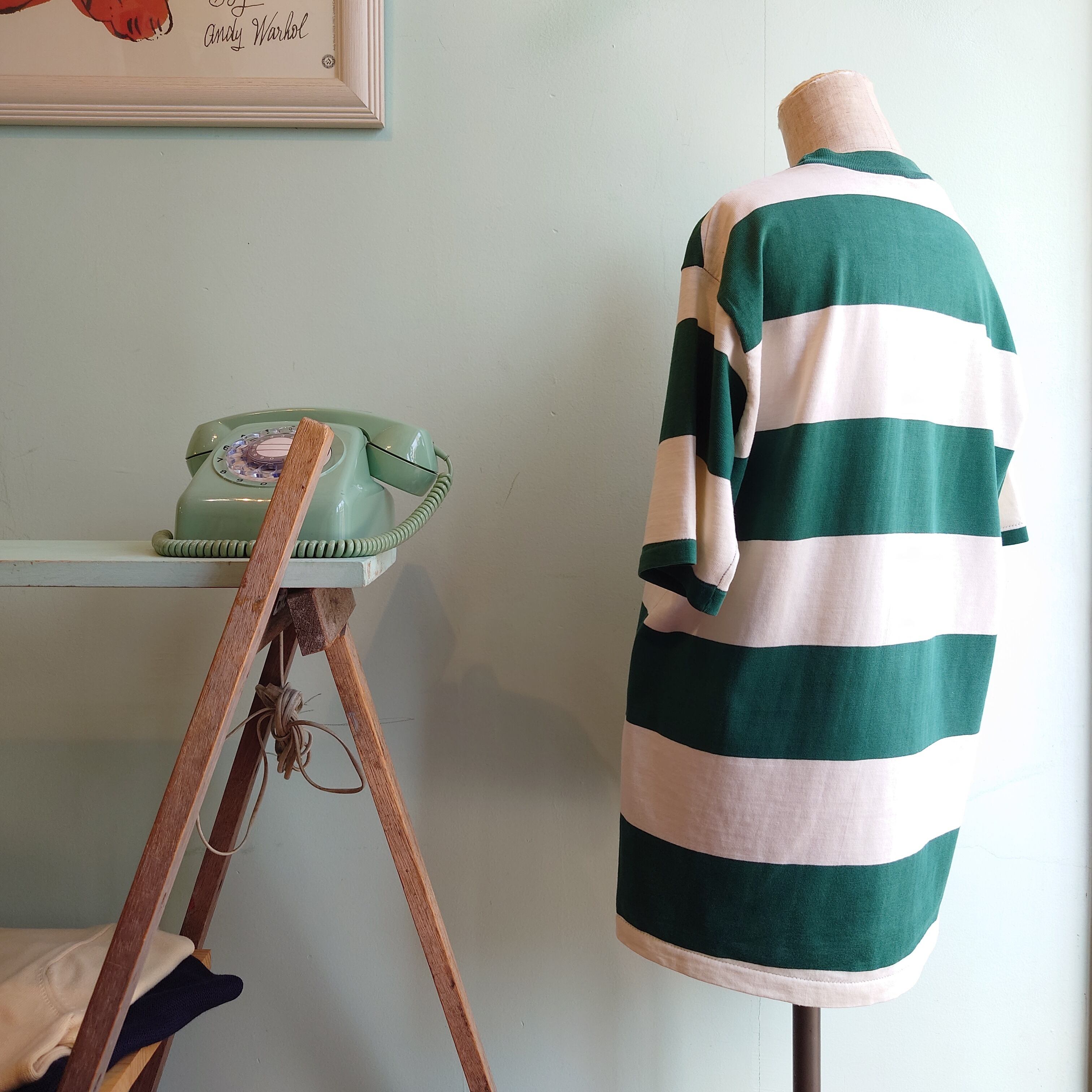 76年に廃業した米小売チェーン、W. T. Grant Companyのストアブランド、GrantsのボーダーTシャツ。USA古着では珍しいヴィンテージのボーダーのうちでもかなり希少な生成り×緑。袖のやボディーのシルエットも70s らしく、シュッとした仕上がりで女子コーデにも◎。