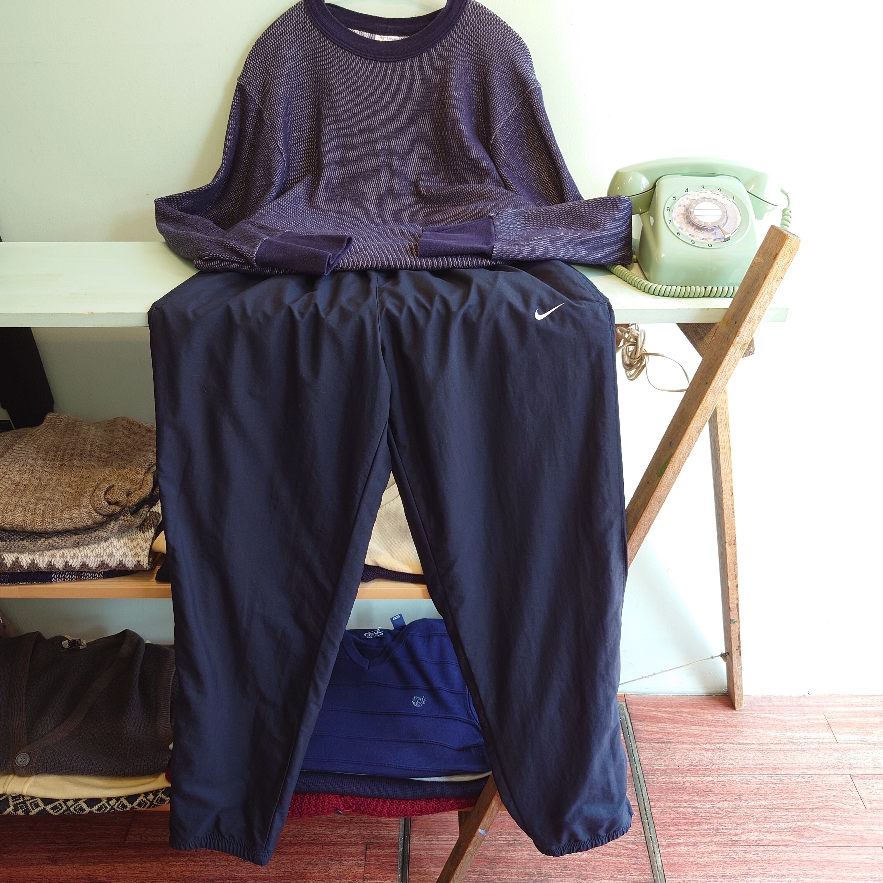 ナイキのソフトシェル系のトラックパンツ。限りなく黒に近いネイビーに、ウォータープルーフ素材、ミリタリーのトレーニングパンツを都会的に再構築したようなプレーンな雰囲気が◎。スポーツミックスというよりも、このボトム自体にきれいめなニュアンスあり、ダークトーンで合わせスタイルもおすすめ。