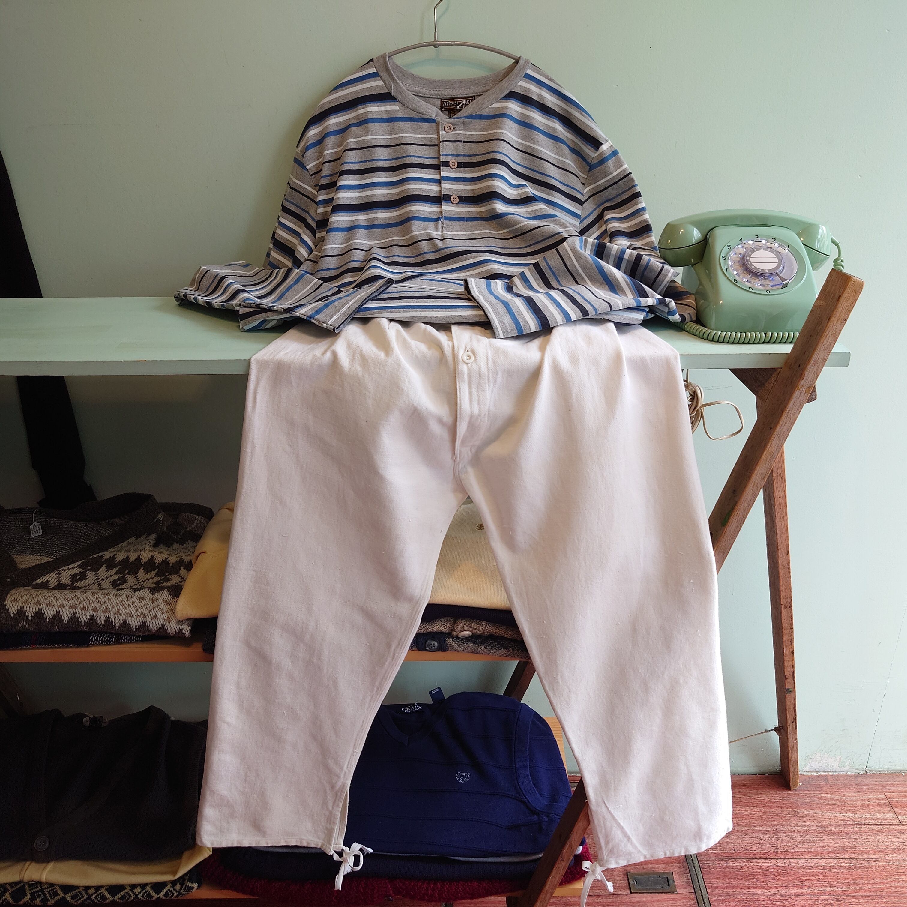 ヴィンテージミリタリーのスリーピングパンツ、40sのNAVYのモデルや、旧ソ連のパジャマパンツに近いデザインのナイトパンツ。帆布のようなナチュラルなコットン、ウエスト後ろと裾には紐のアジャスターも。履けばレトロなチノを思わせるテーパードに、裾のスリットが効いたグッドシルエット。大人っぽさや、リゾート感も感じる技あり白ボトムです。