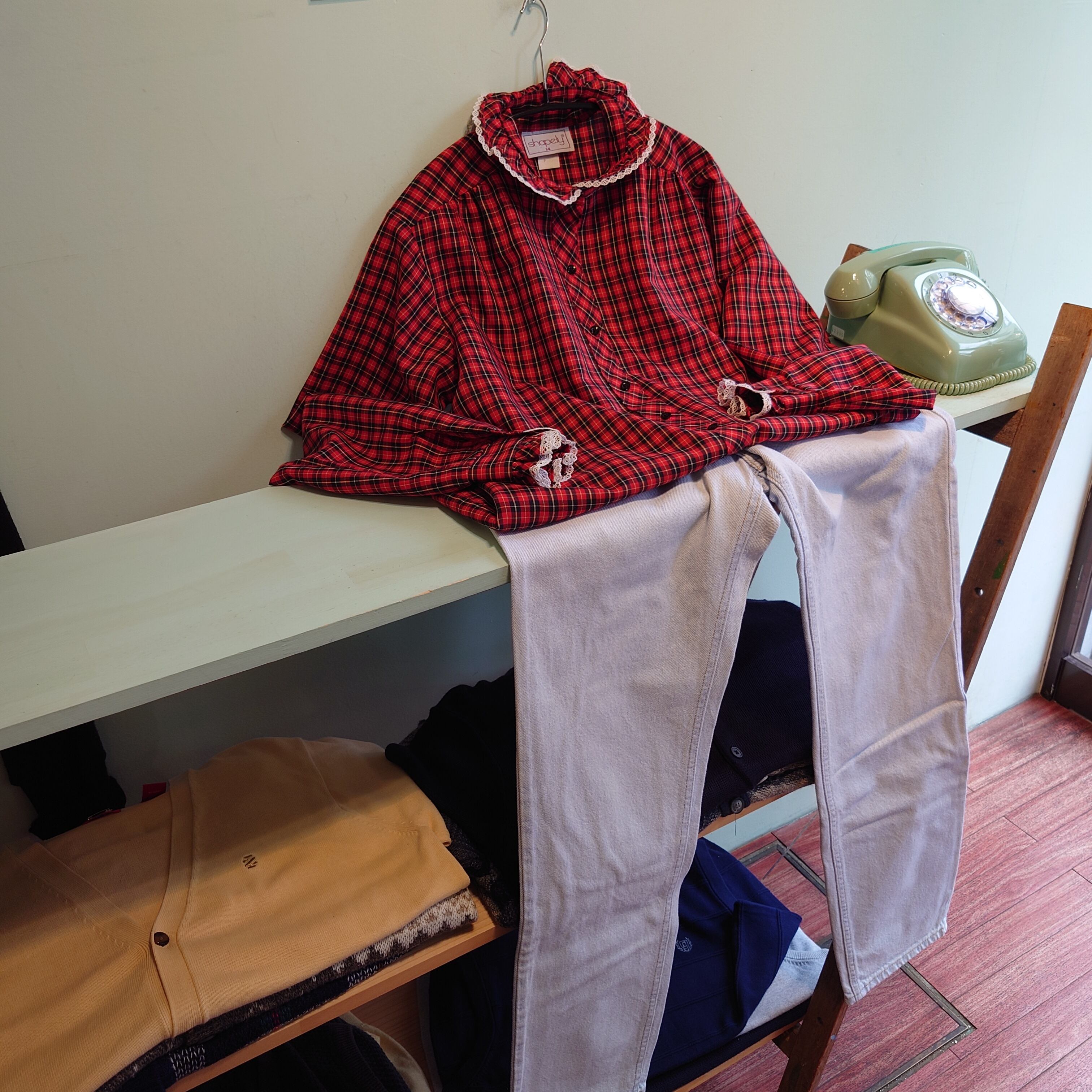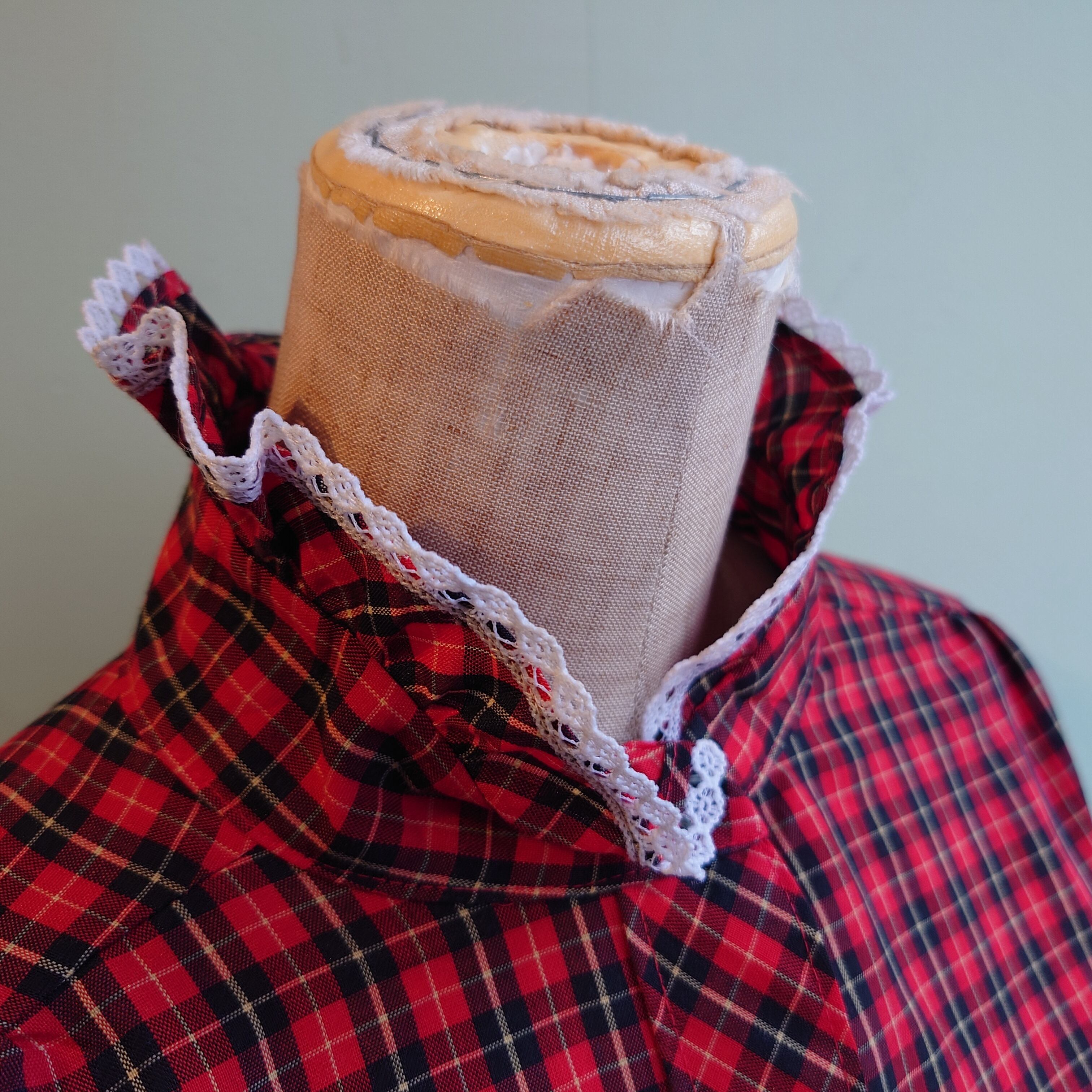 70svintage、Shapelyのフリルブラウス。サラッとした薄手素材に、タータン系チェック、フリルトレースがガーリーで、カントリー風のコスチュームのような可愛さ。レディースらしい丸みと、シュッと落ちる綺麗さを兼ね備えたシルエットも◎。アメリカンヴィンテージ、そのもののような可愛さのシャツです◎