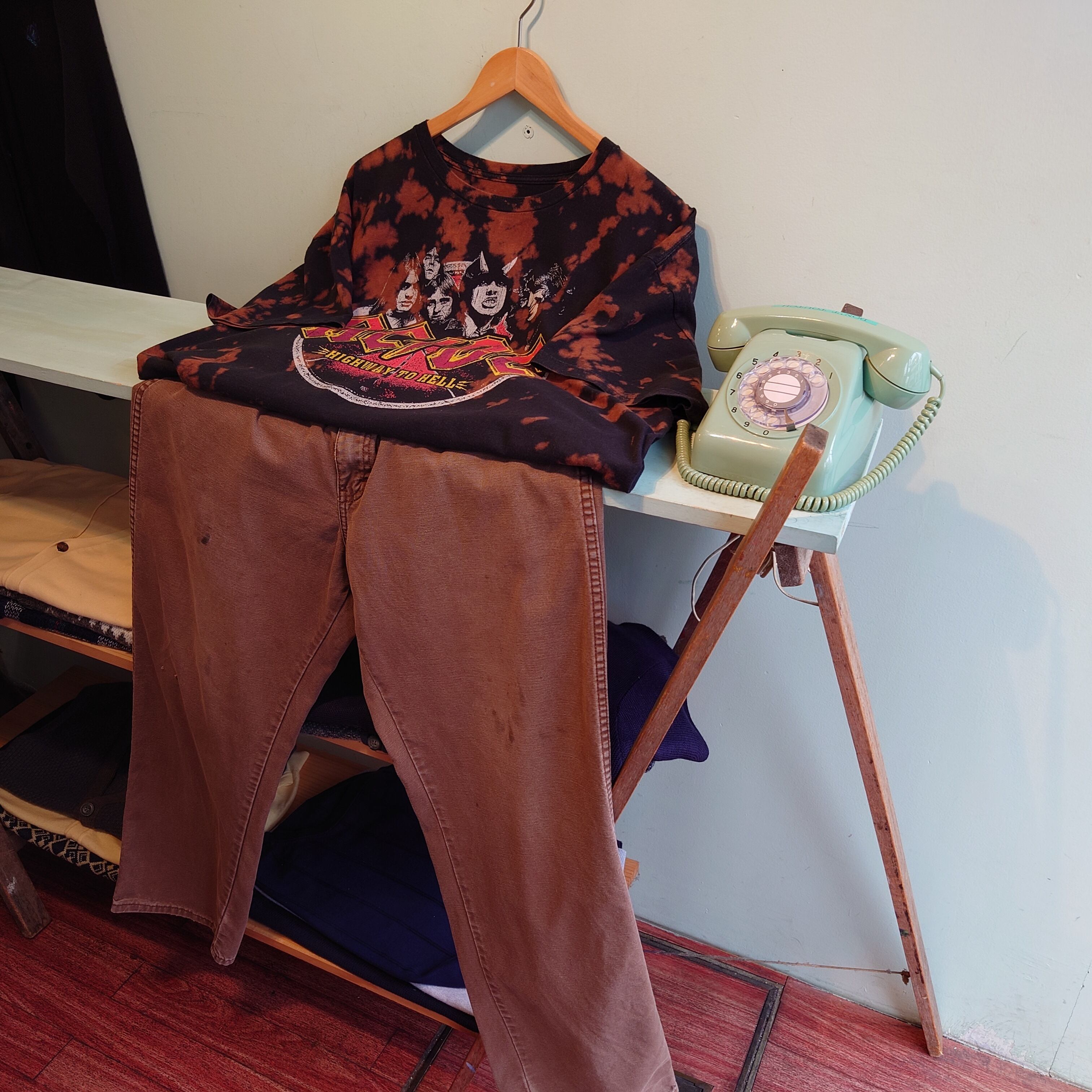 オーストラリア初のロックモンスター、AC/DCのバンドTシャツ。ボンスコット在籍時の名盤中の名盤、Highway to Hellをモチーフにた一枚。カラーで乗ったグラフィックをブリーチで仕上げたダイナミックなかっこよさが◎。定番とは違う個性あふれるロックアイテムです。また、ワイドでショートなシルエットも魅力的。