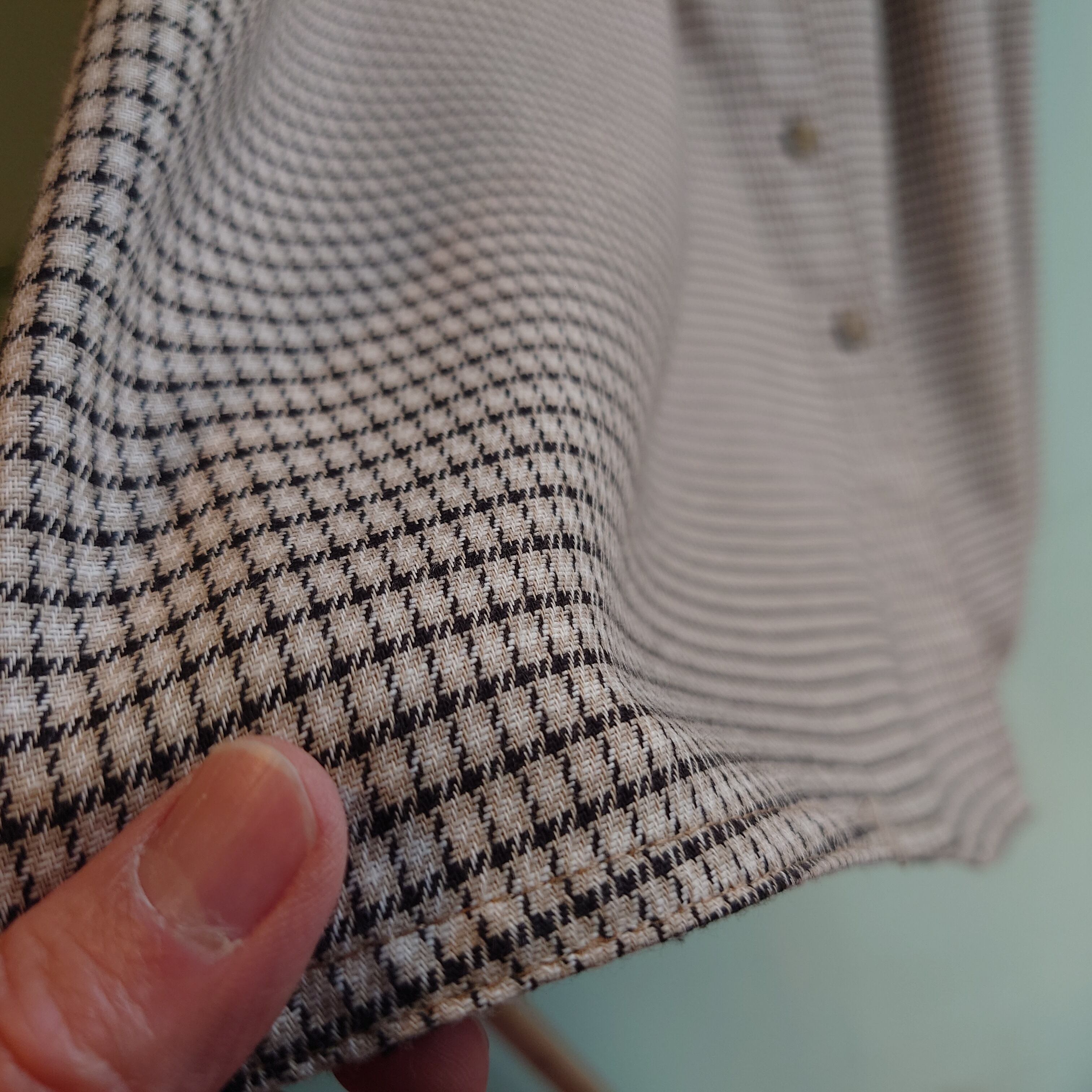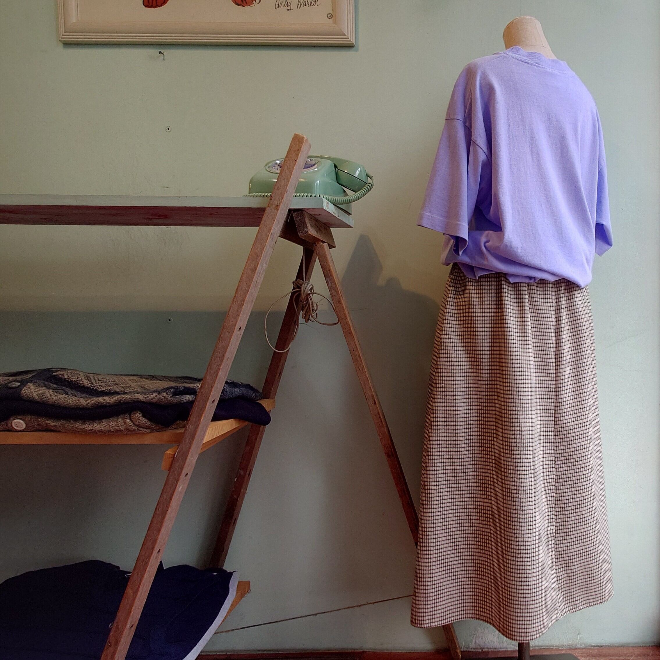 名門JANZENのヴィンテージスカート。ピンチェックと千鳥格子を混ぜたような、ナチュラルなベージュ系チェックがトラッド。タック付きでフレア感強め、ベルトループ付きで小柄なお客様もゆるっと履けます◎