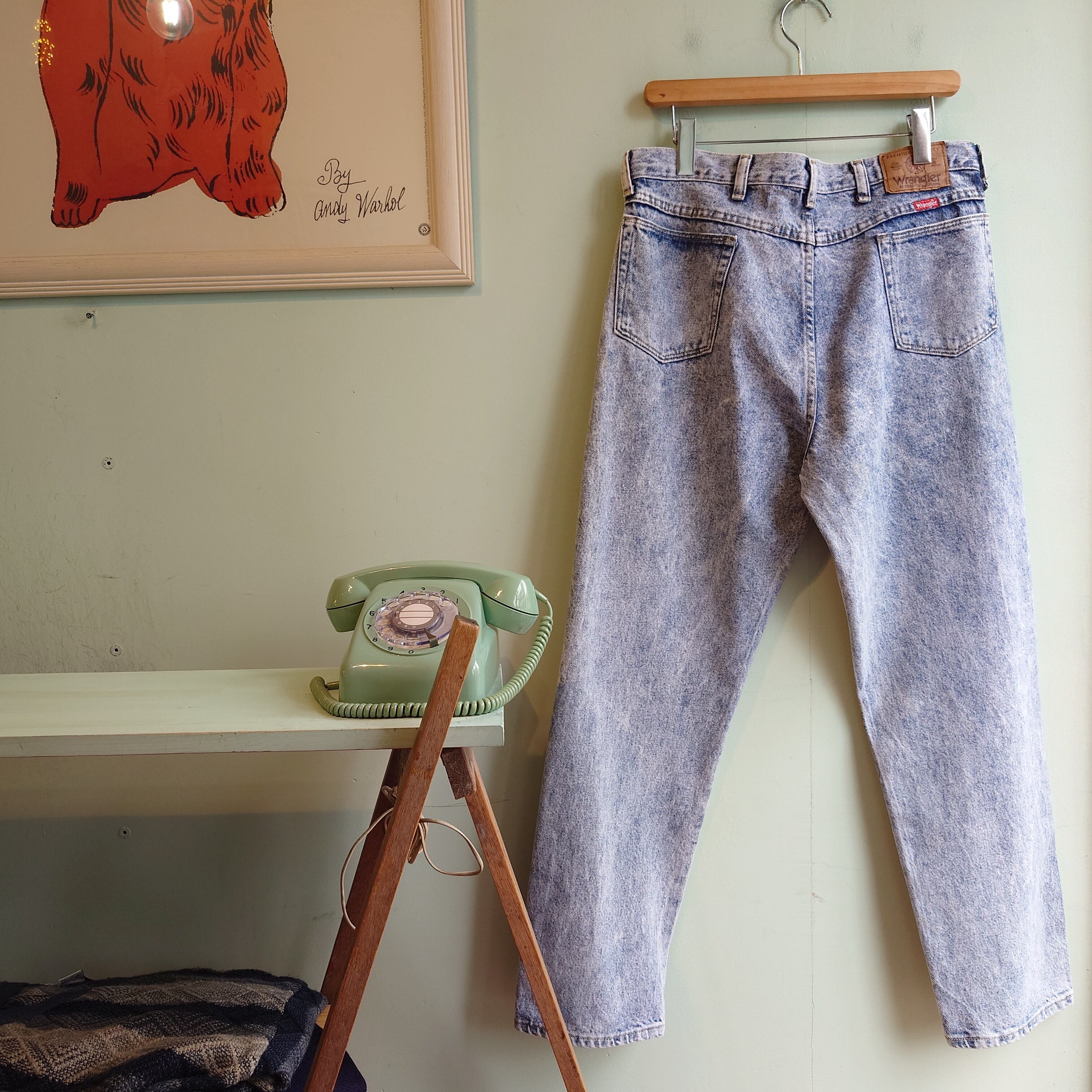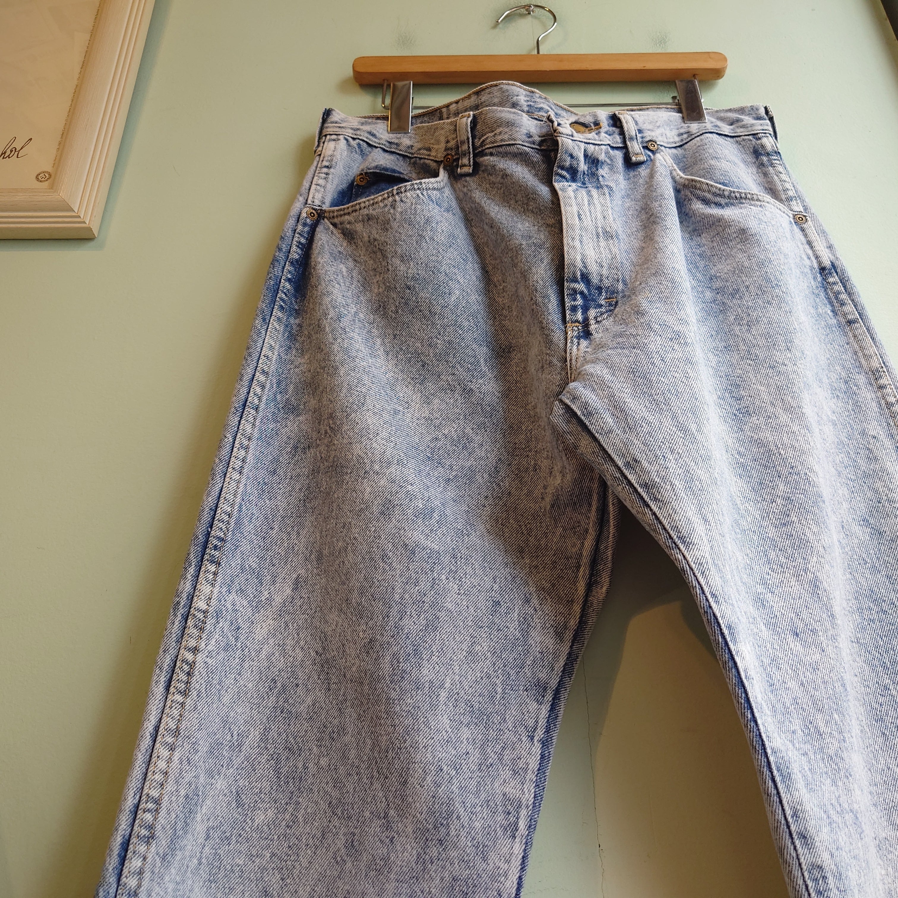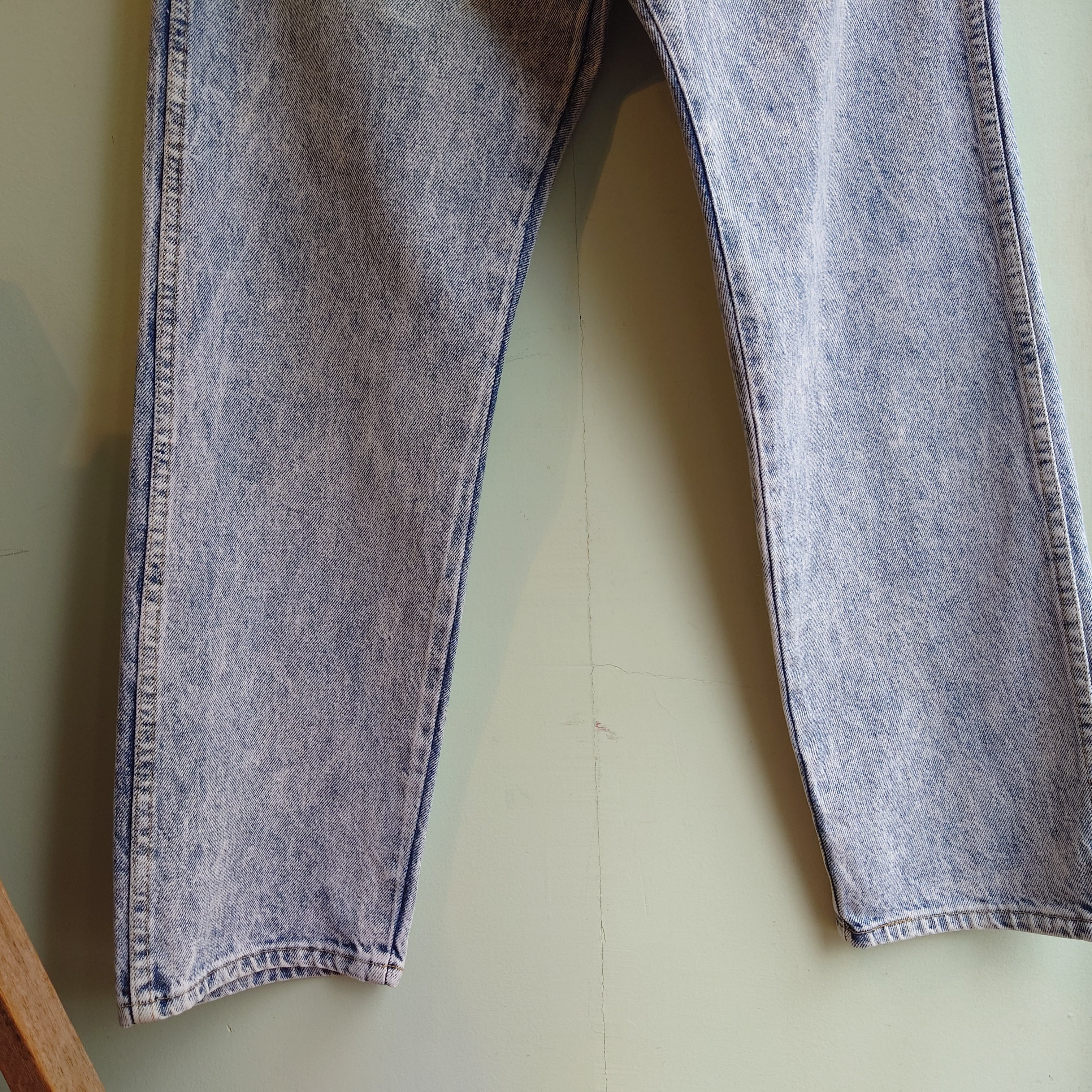 1991年製造と思われるラングラーのケミカルウォッシュジーンズ。インディゴと白の濃淡のバランスも良し、ボリューミーなテーパード/バギーシルエットも雰囲気にマッチした一本。ラングラーの中でもかなり希少な部類のオールドアイテムです。ウエストに対してレングスが日本人に合いやすいグッドサイズ◎。