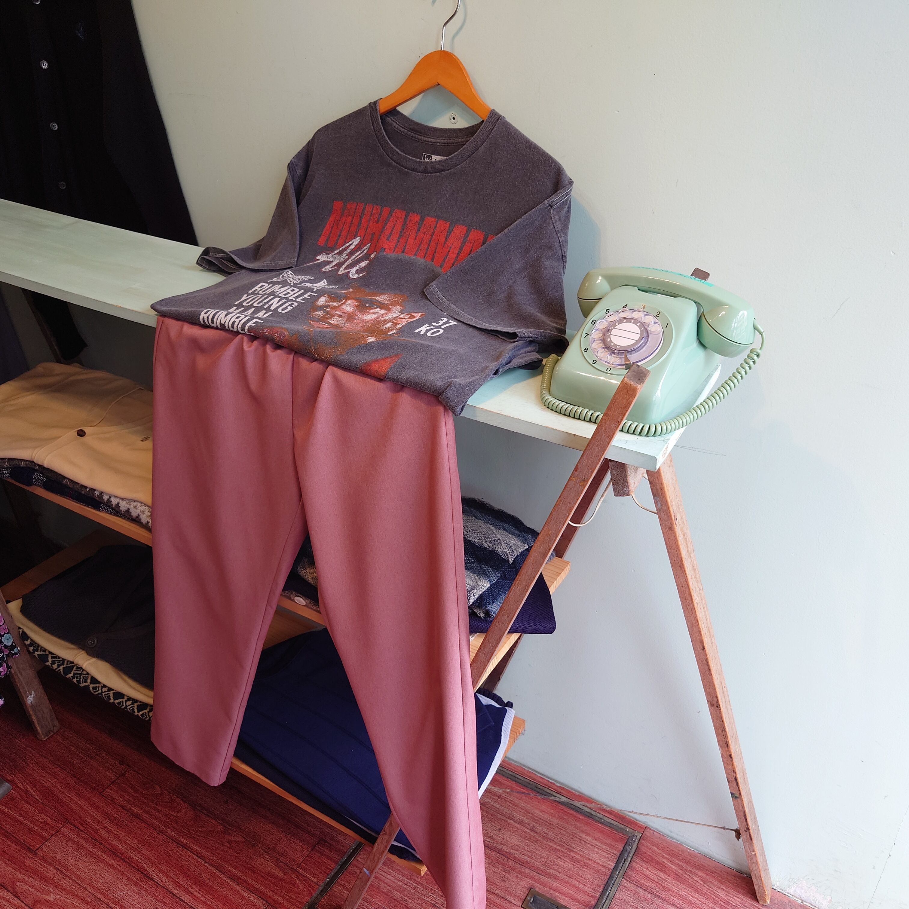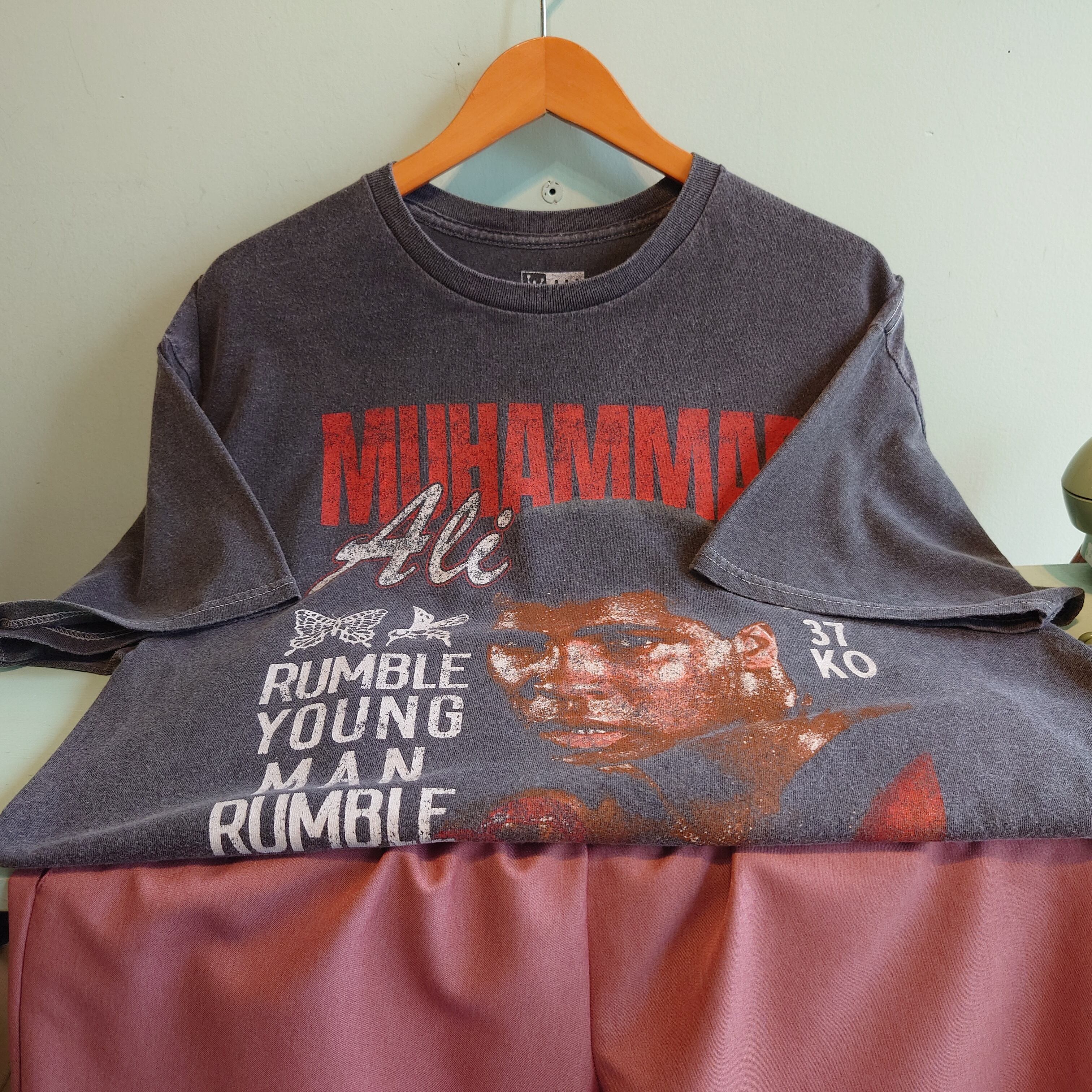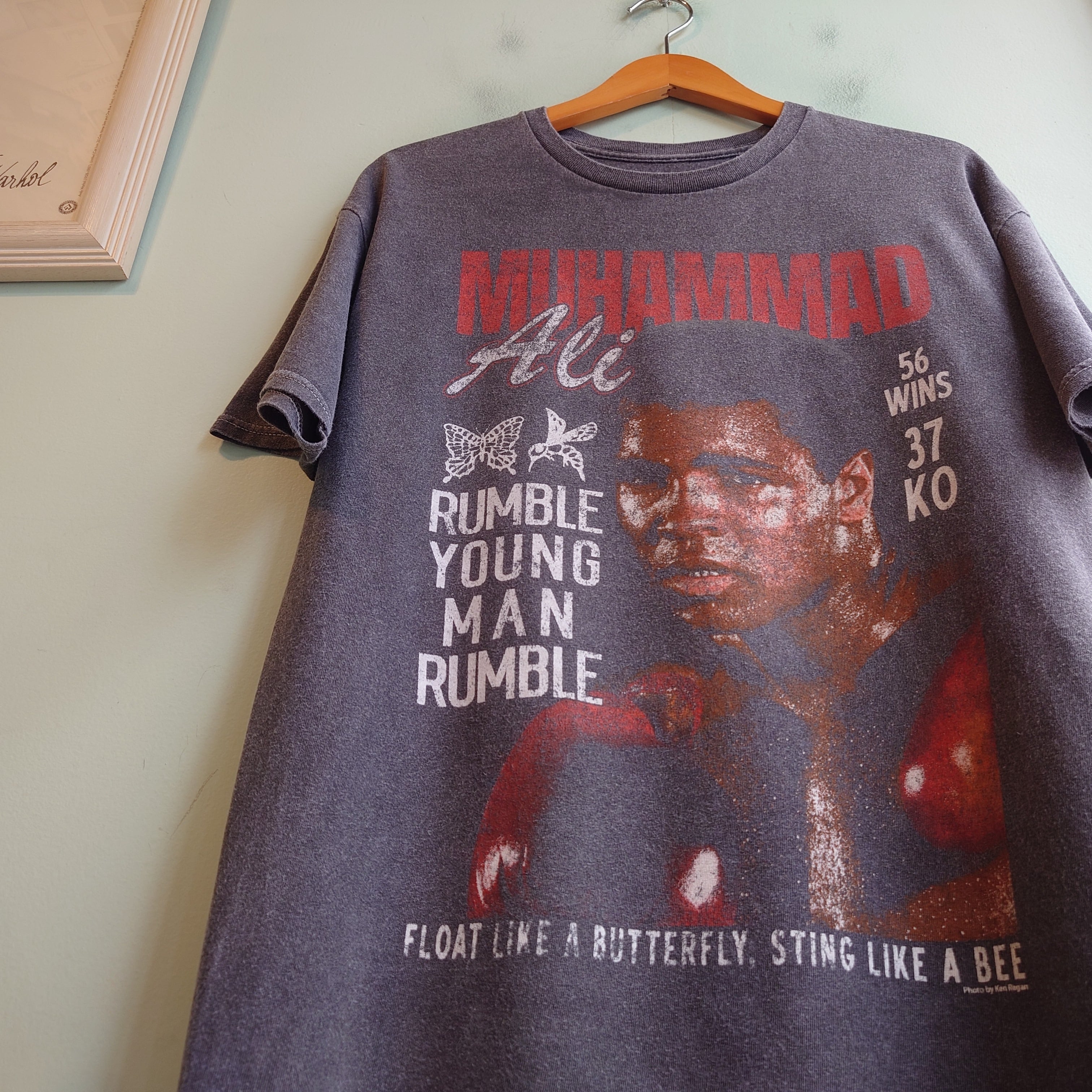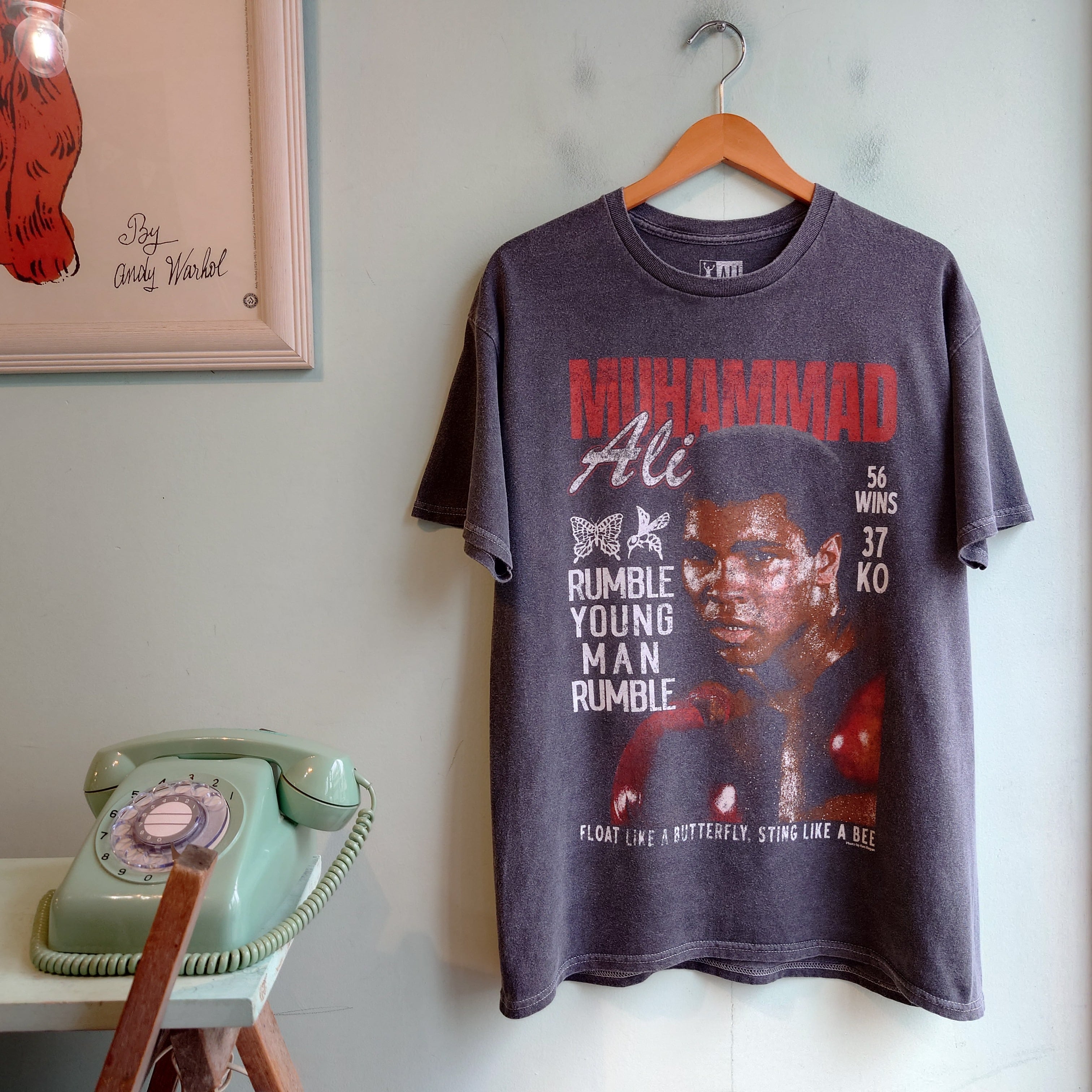 伝説のボクサー、モハメド・アリのグラフィックTシャツ。彼の戦績、37KOという戦績や、暴れろ若者よ、暴れろとの象徴的なフレーズ、そして「蝶のように舞い、蜂のように刺す」のイラストなど、人物像をクローズアップした一枚。ダークグレーを元に、ブリーチ感やウォッシュ感を加えた味わい深い雰囲気も最高。