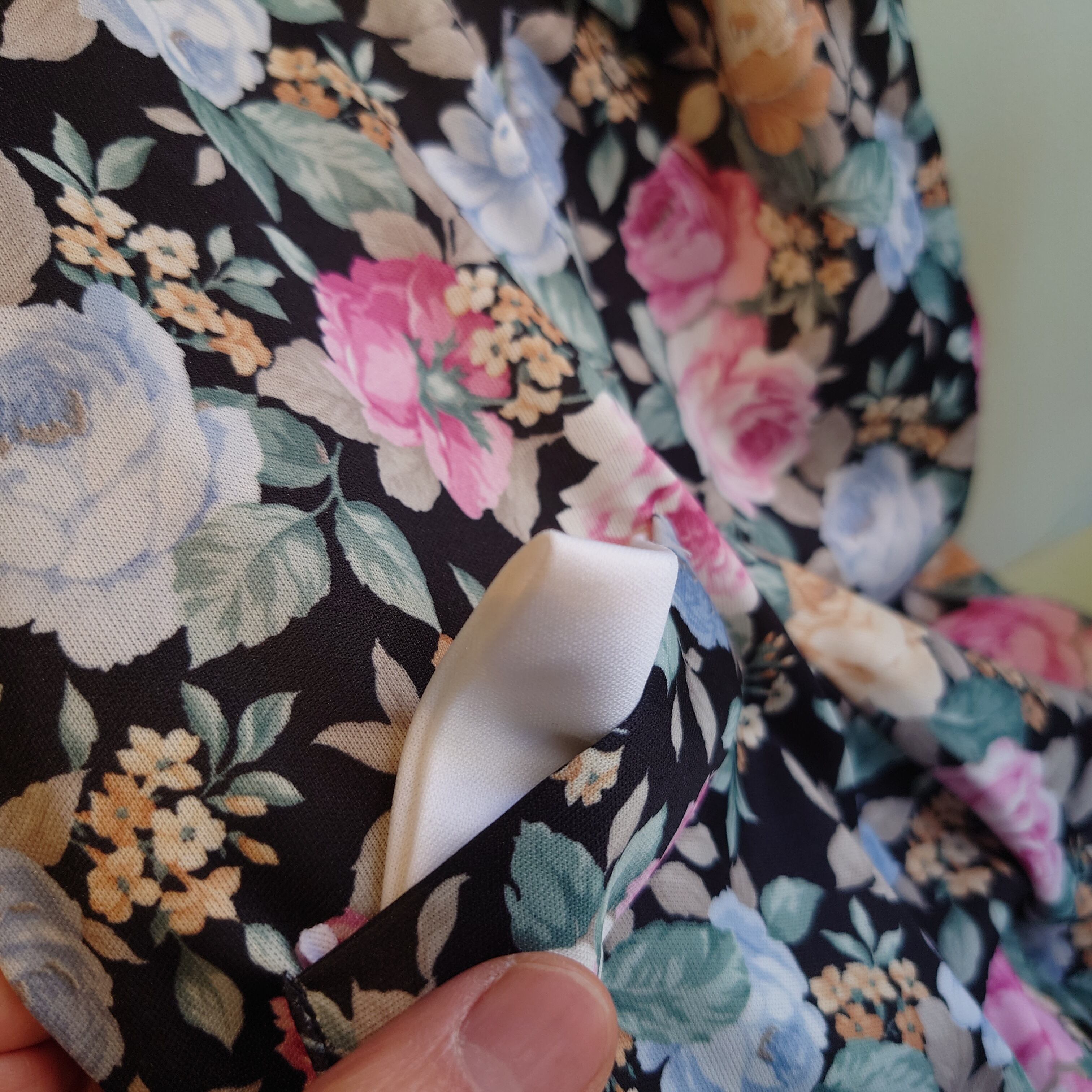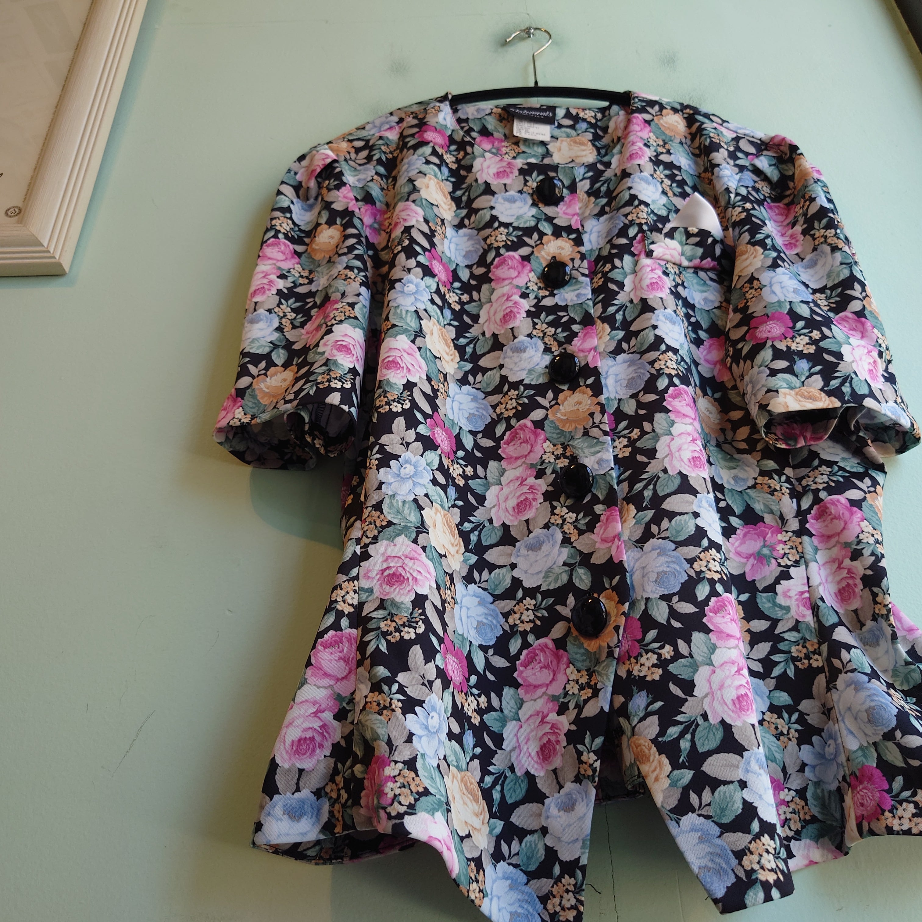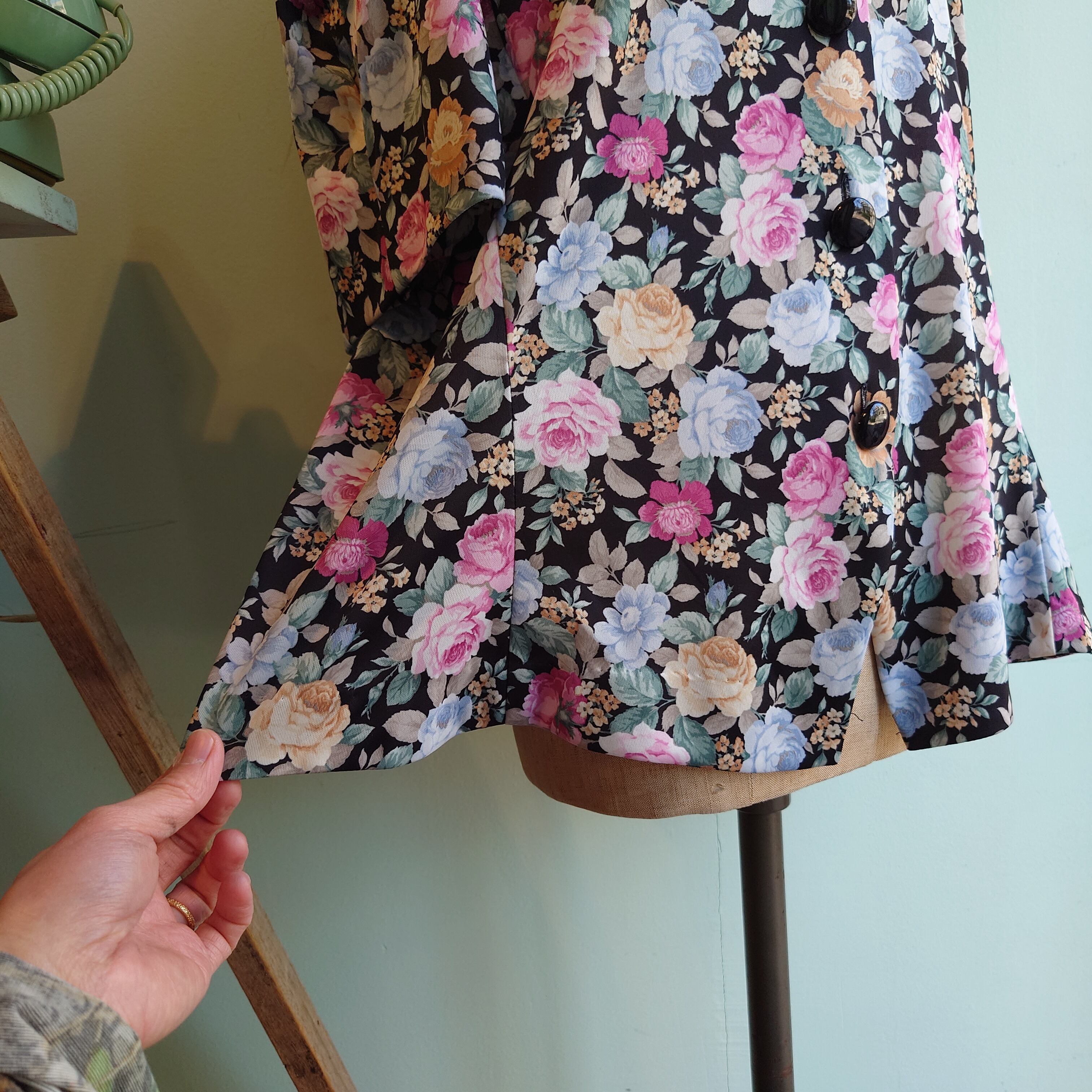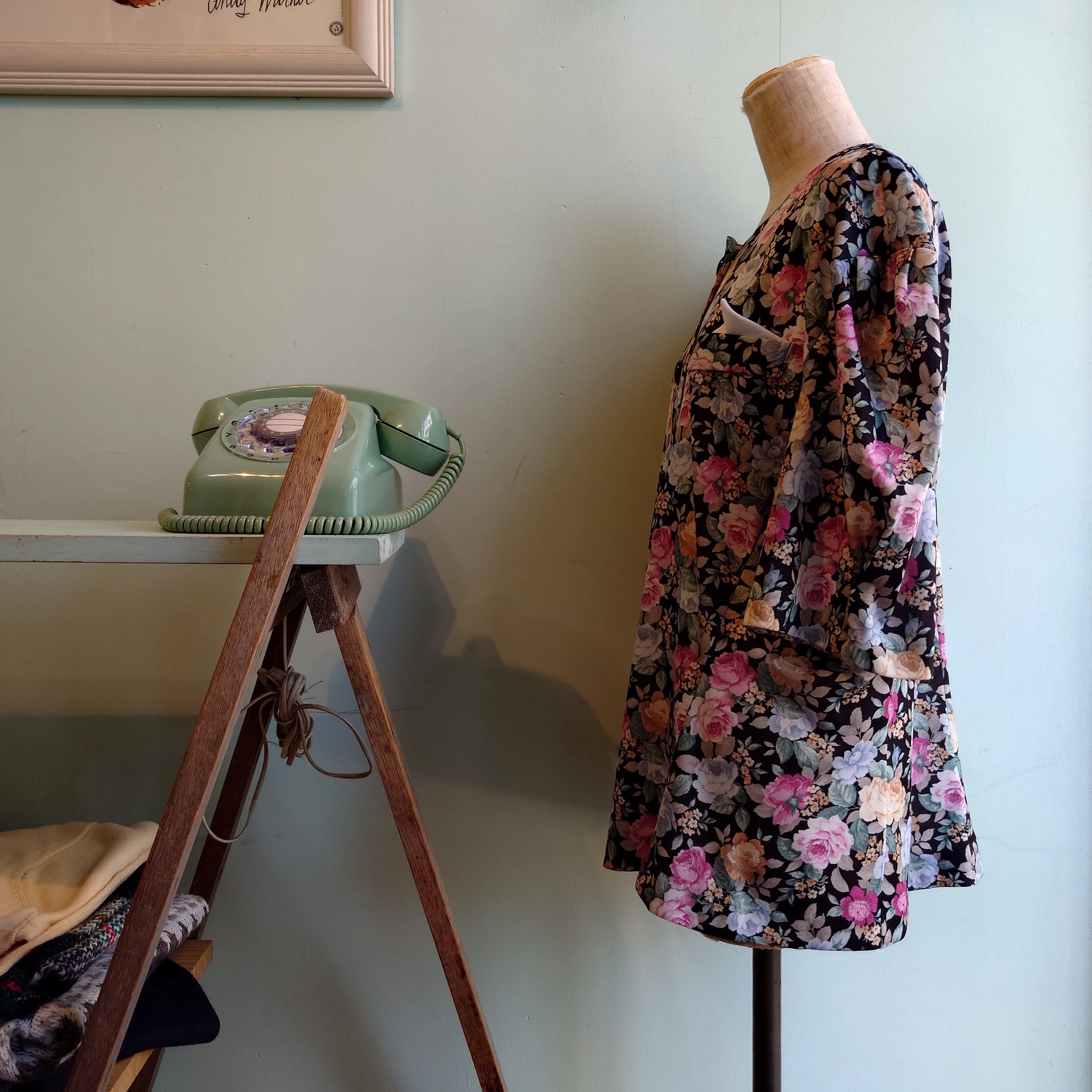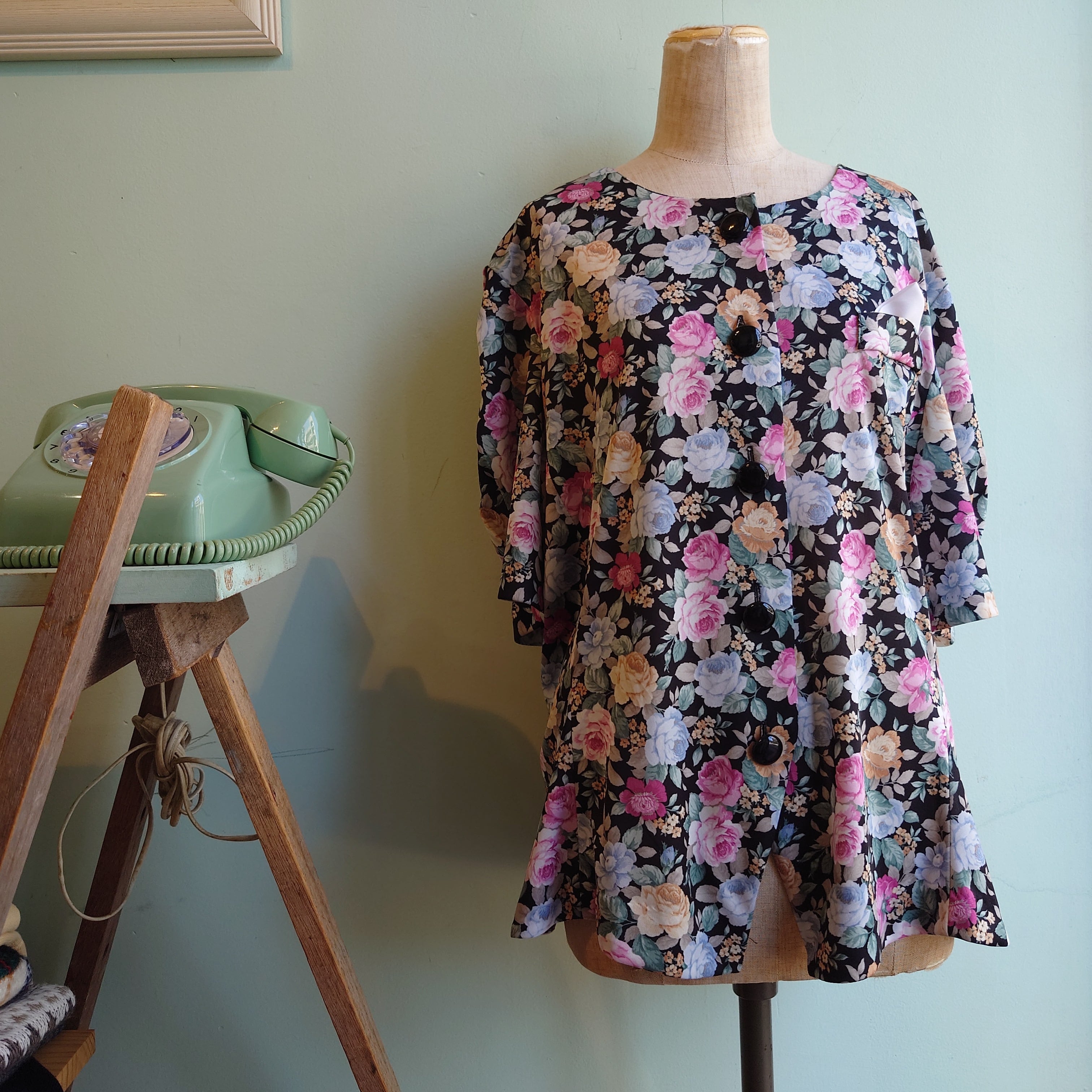 黒地に花柄が敷き詰められたジャケット風デザインの総柄ブラウス。70s のスタプレよりも柔らかめな、テロっとしたほんのり光沢系◎。すっきりノーカラーから、裾でフレアするガーリーシルエットがかわいい。ハイウエスト系パンツやショーツ、スカートに相性抜群です。