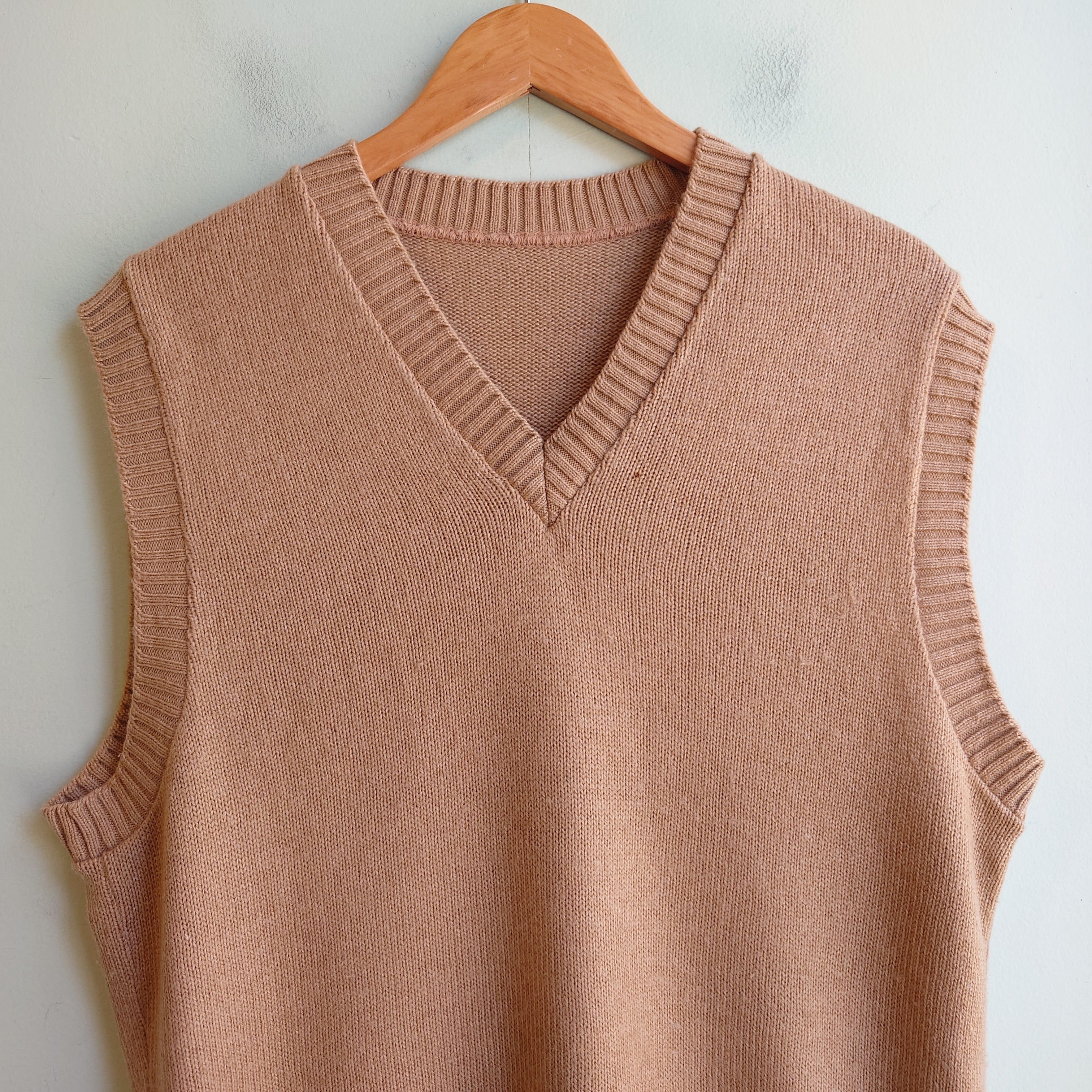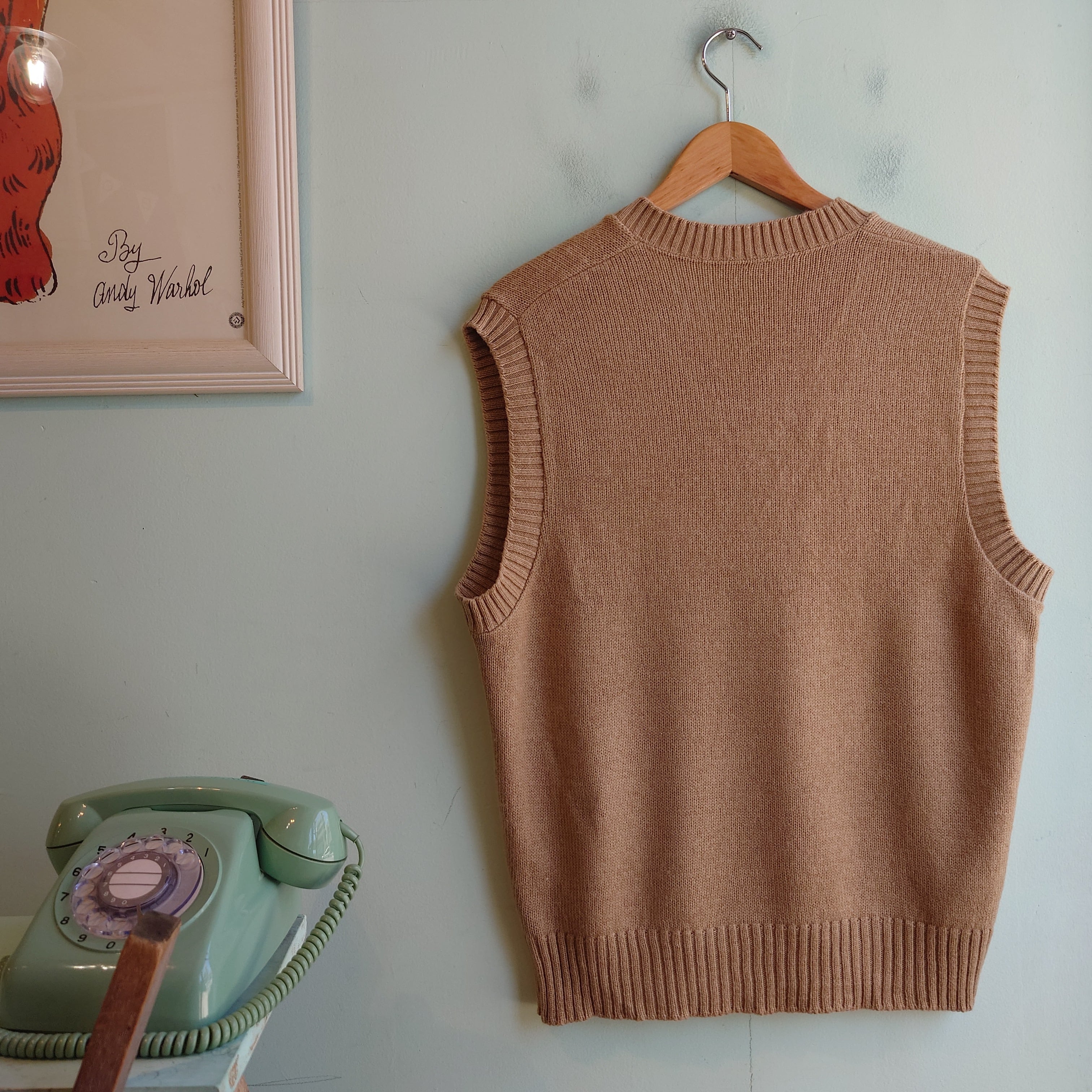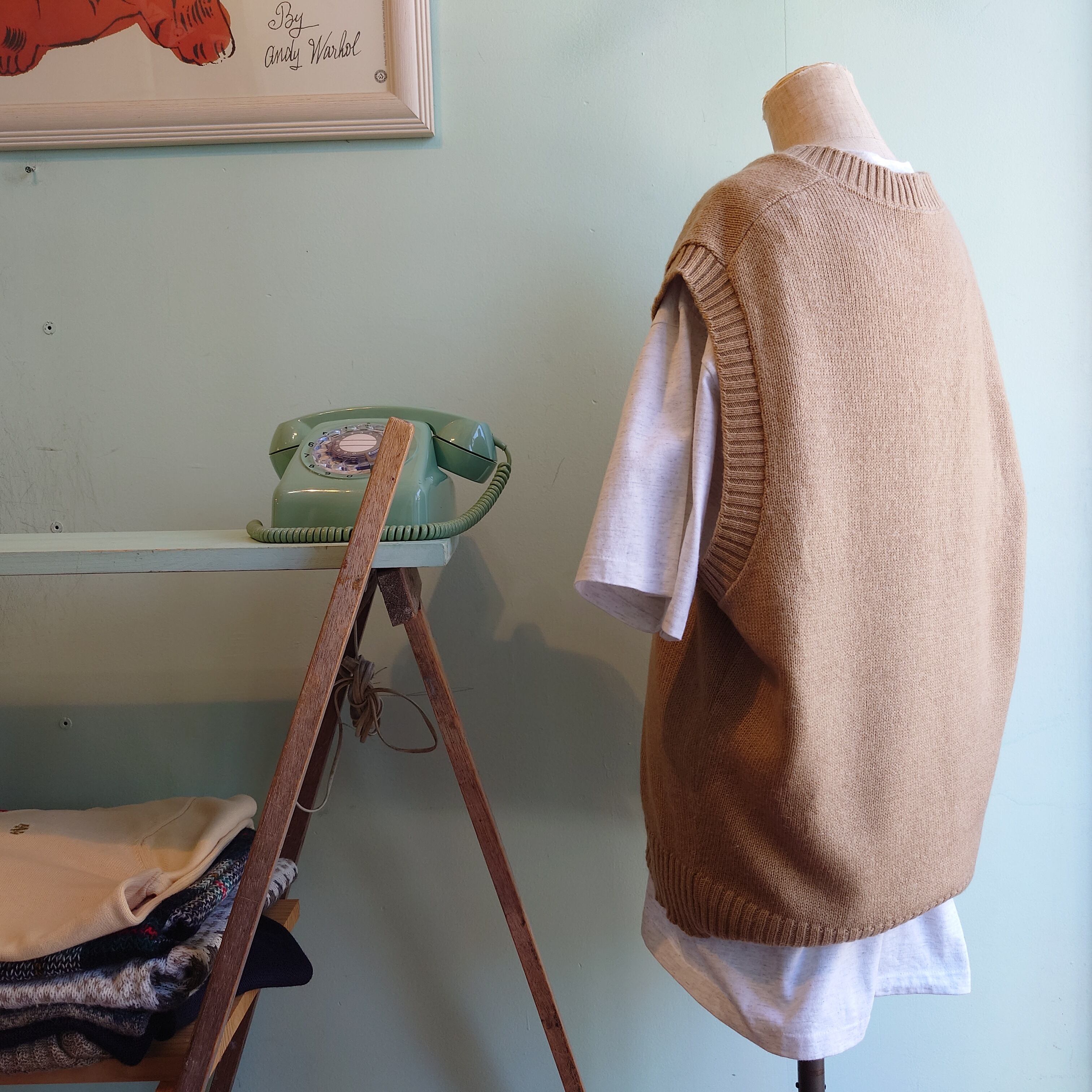 80s vintageのニットベスト。ワイドで長すぎないクラシックなボックスシルエットがレトロ。定番のシャツ合わせから、半袖Tシャツとのレイヤードまで、季節問わず使える優等生。ややダメージがありますが、なかなか出会えない色と味に注目の一枚◎