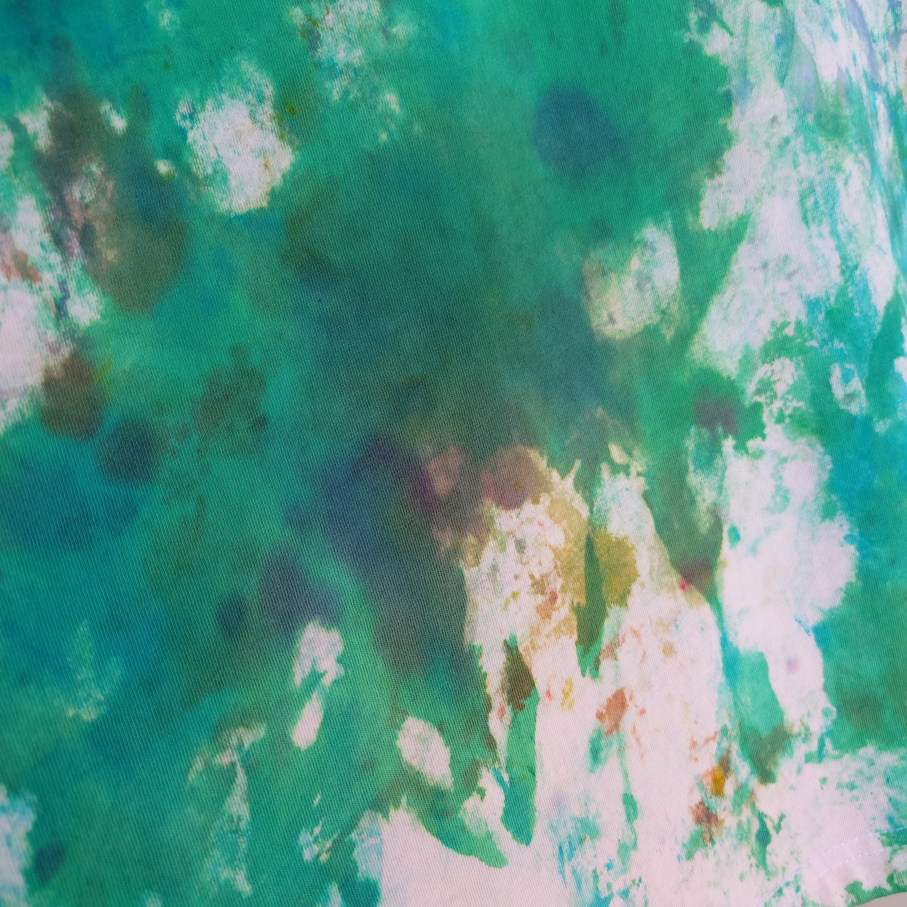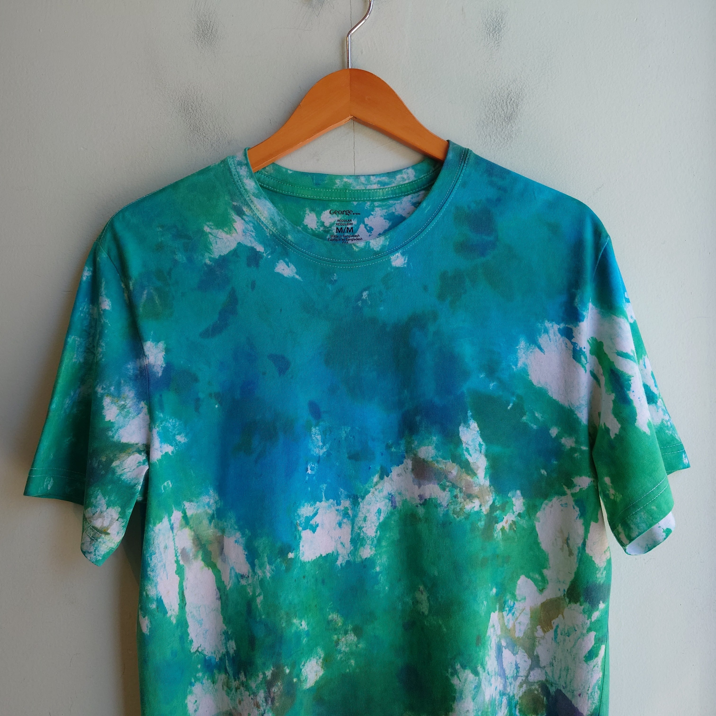 画用紙に水彩絵の具を飛ばしたような、独特なマーブル色に惹かれるタイダイTシャツ。青、緑をベースに、紫、カラシ、ありそうでないグラデーションがセンスよし。サイケでハッピーなタイダイとは違う大人っぽさと、アート感が魅力のグッドアイテム。