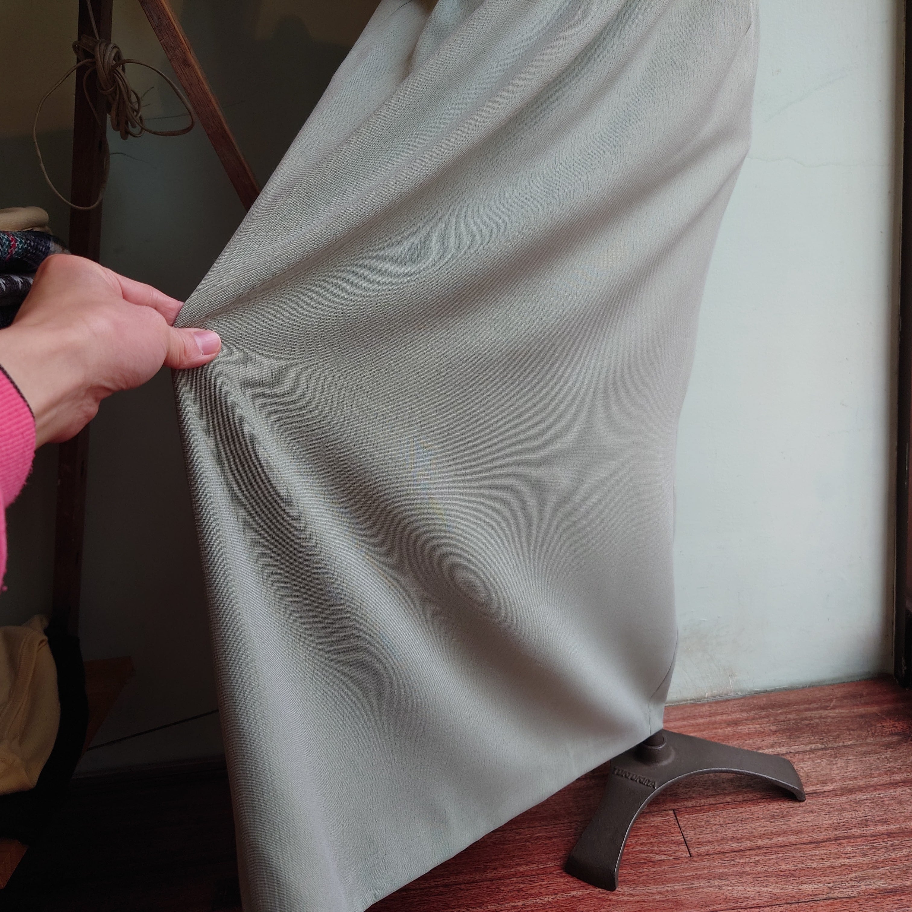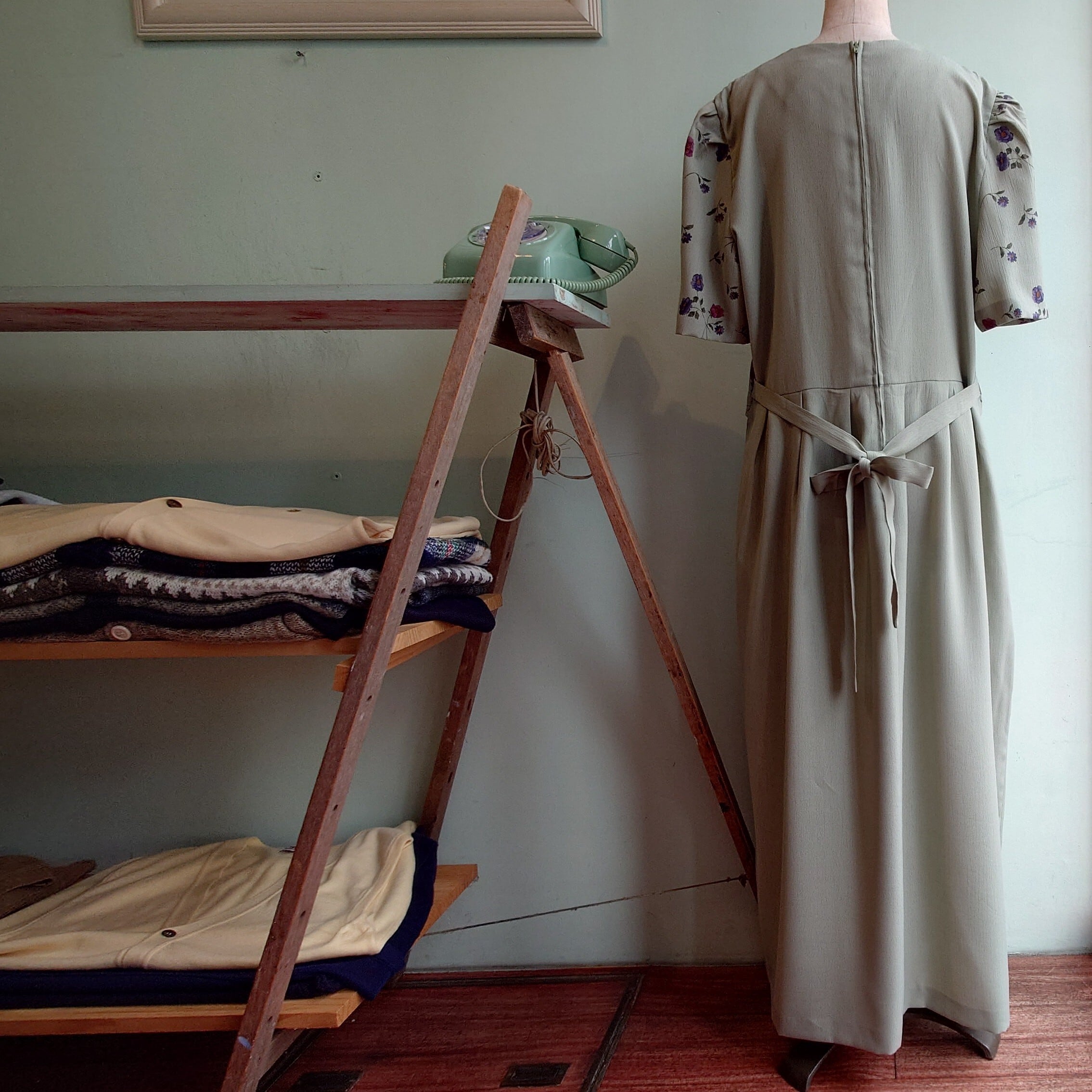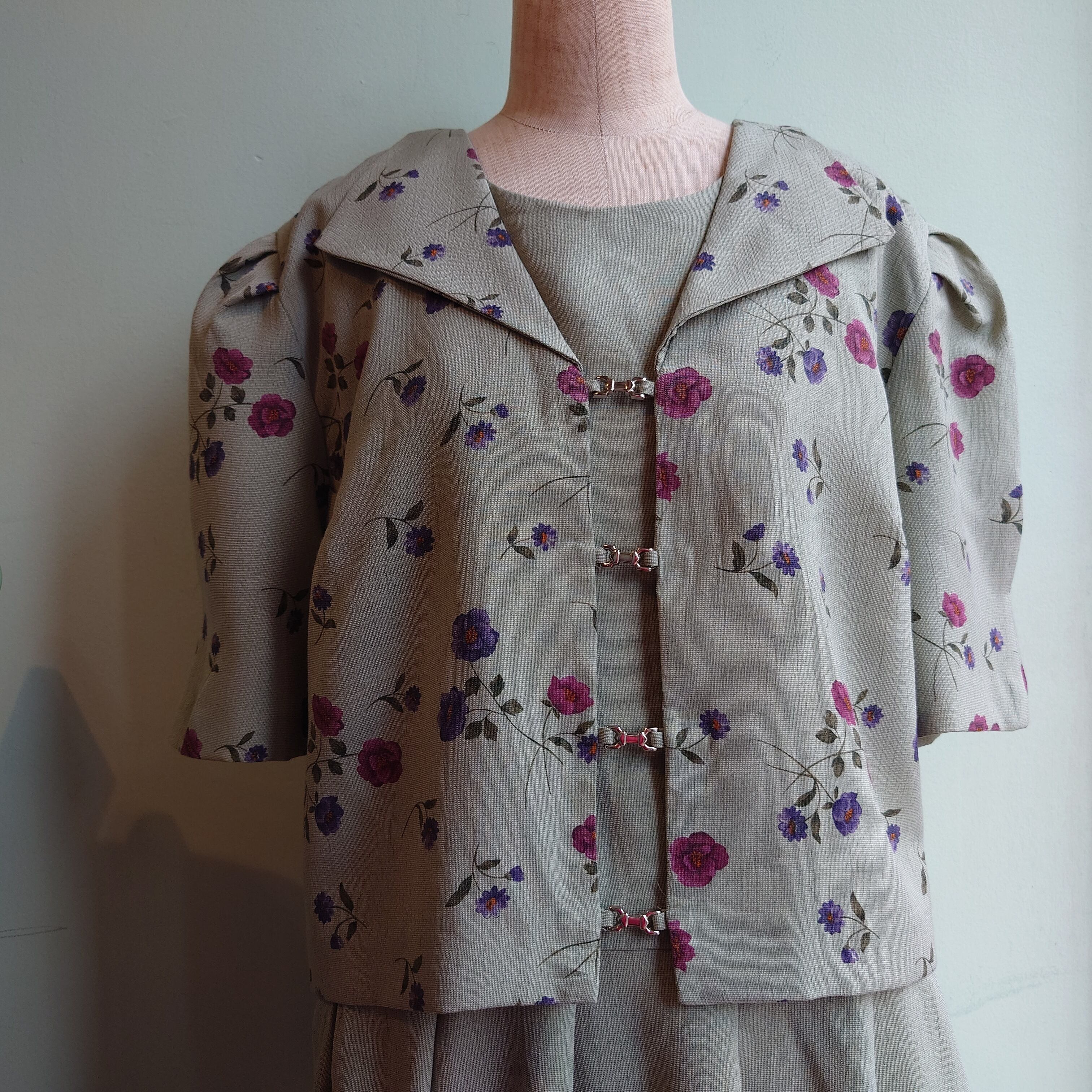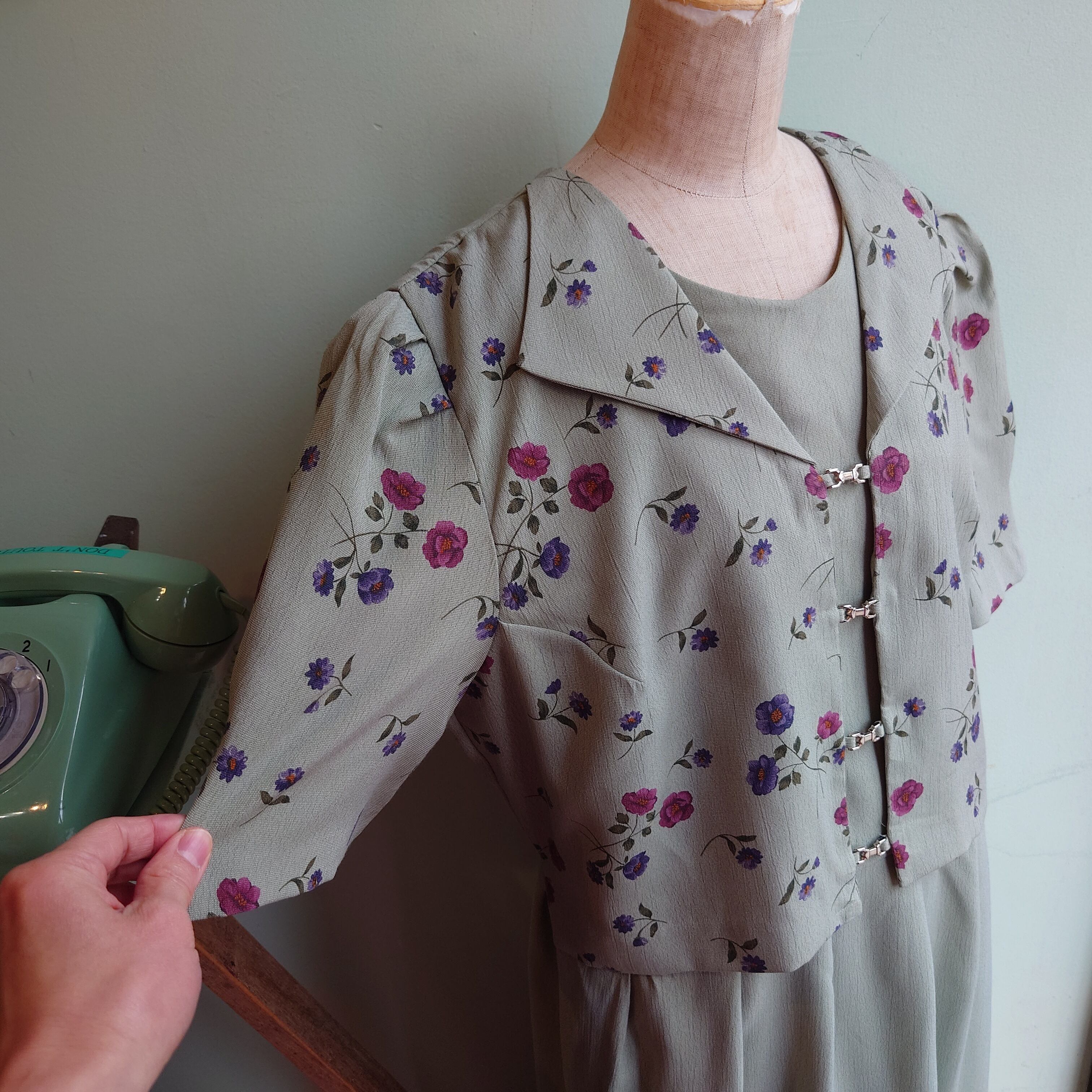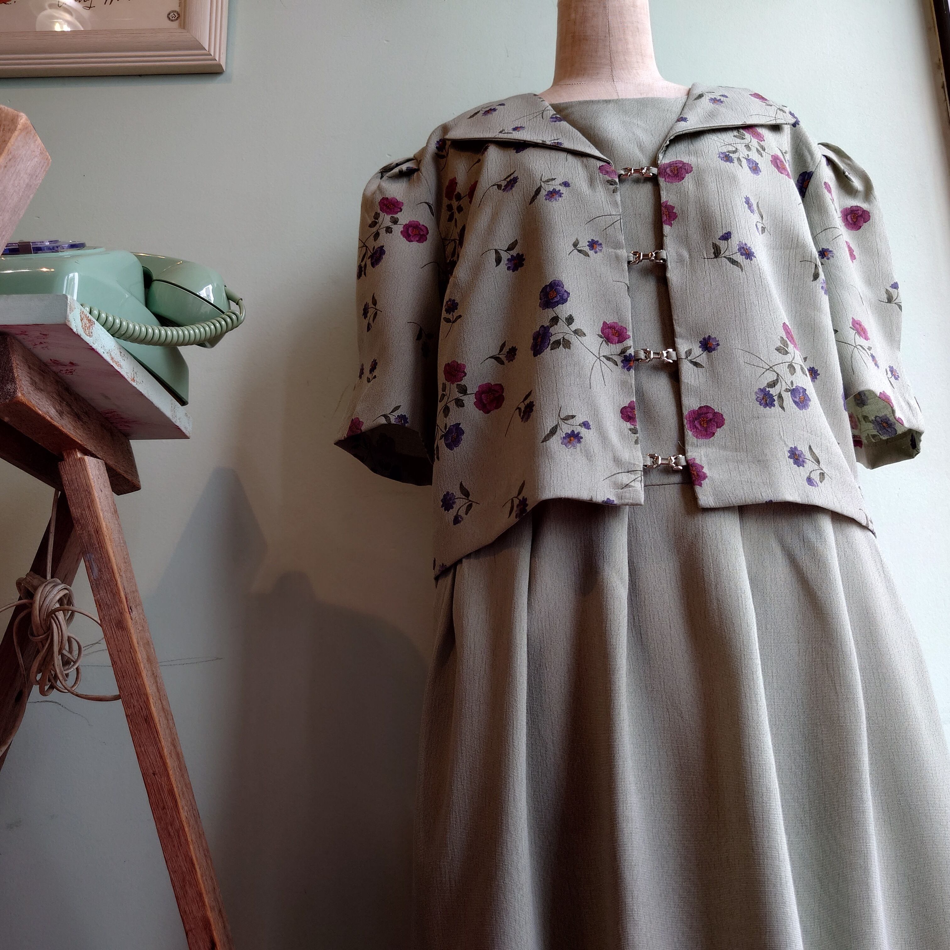セージやミントグリーンような、ナチュラルな緑が爽やかなアンサンブル系ドレス。セーラーのような襟がついた、総柄のジャケットがドッキングしたプルオーバーです。ウエストは紐でぎゅっと絞れるものの、アンサンブル系の中でもゆるっとしたデザインが珍しい。さらさらっとしたガーゼ感のある生地感で、見た目よりも涼しさあり。