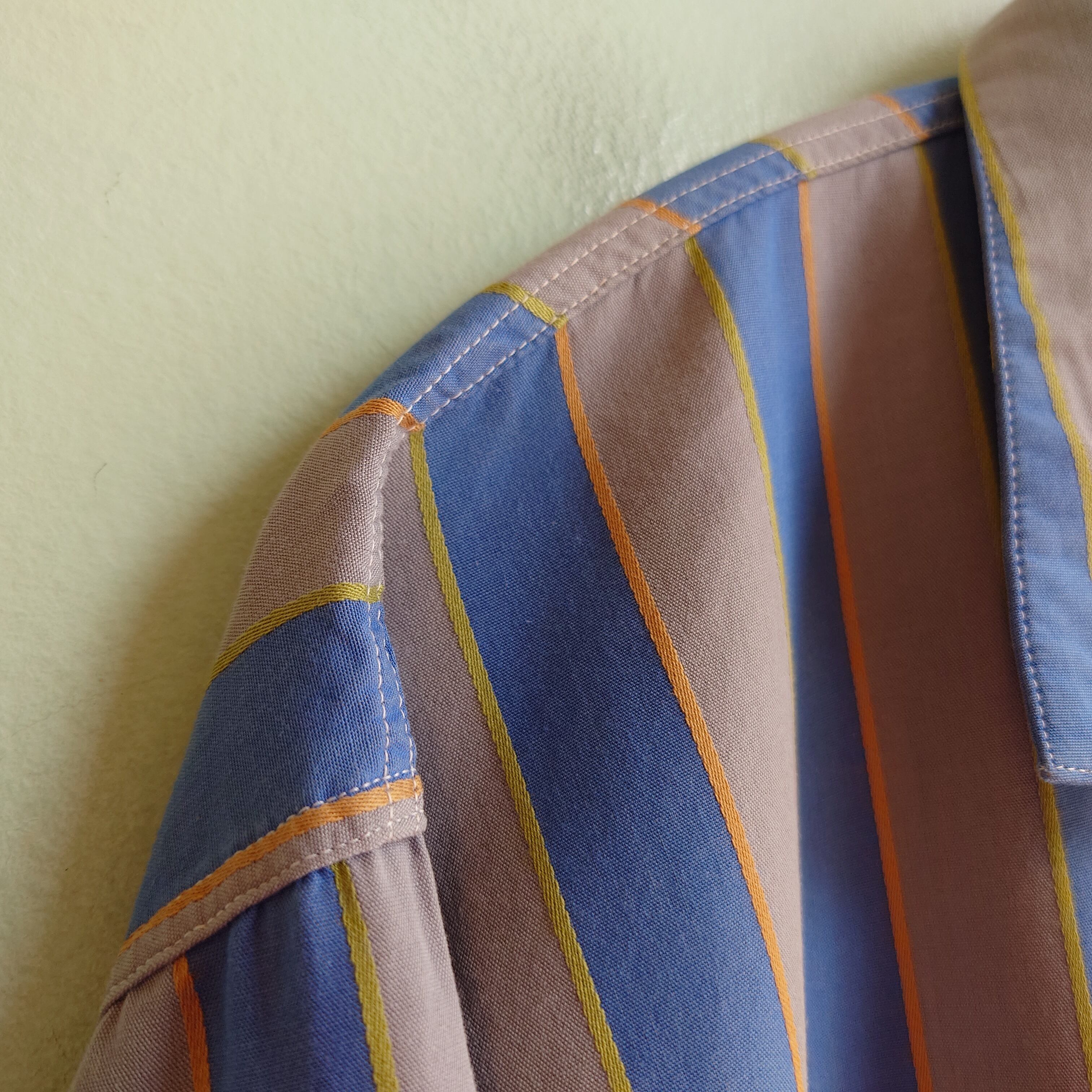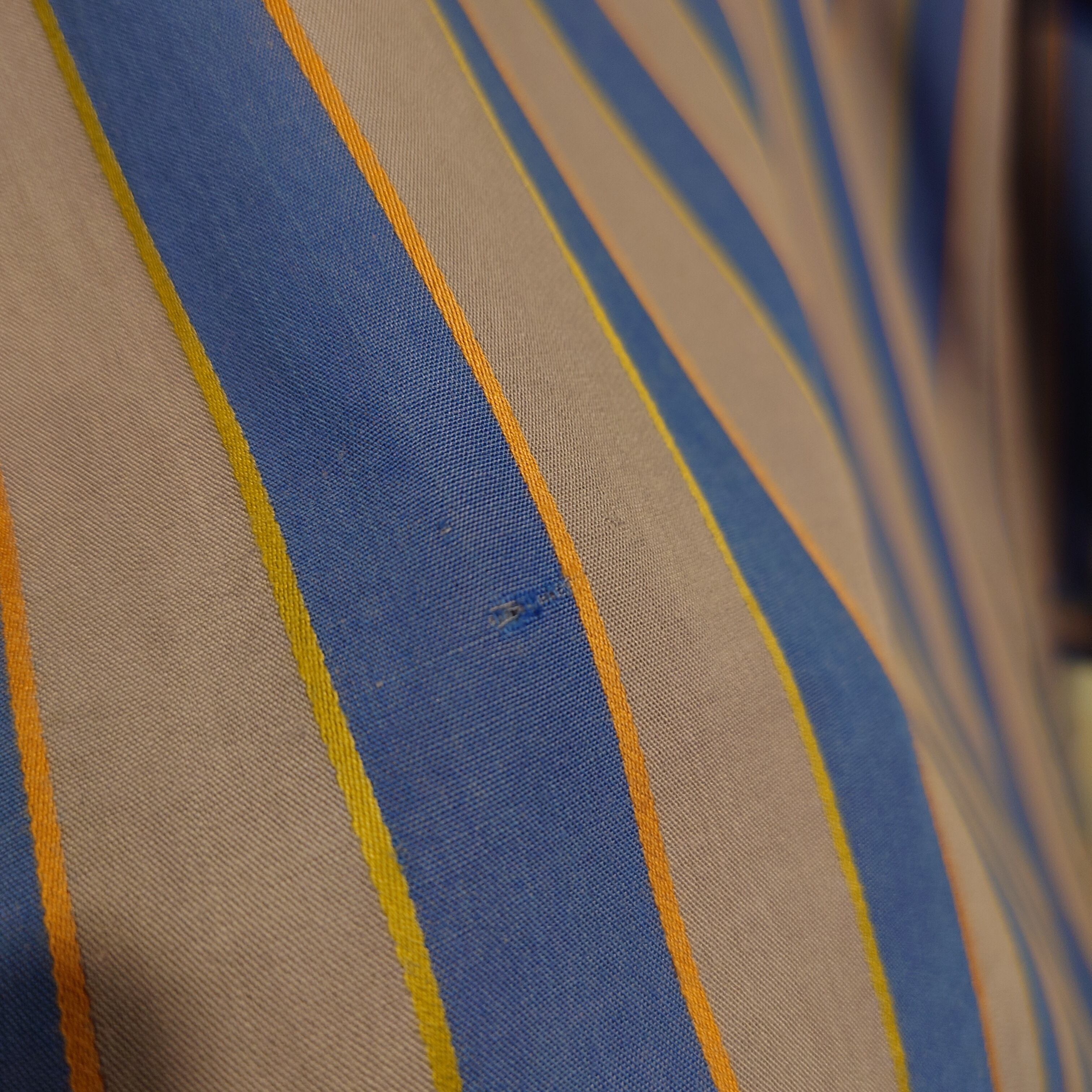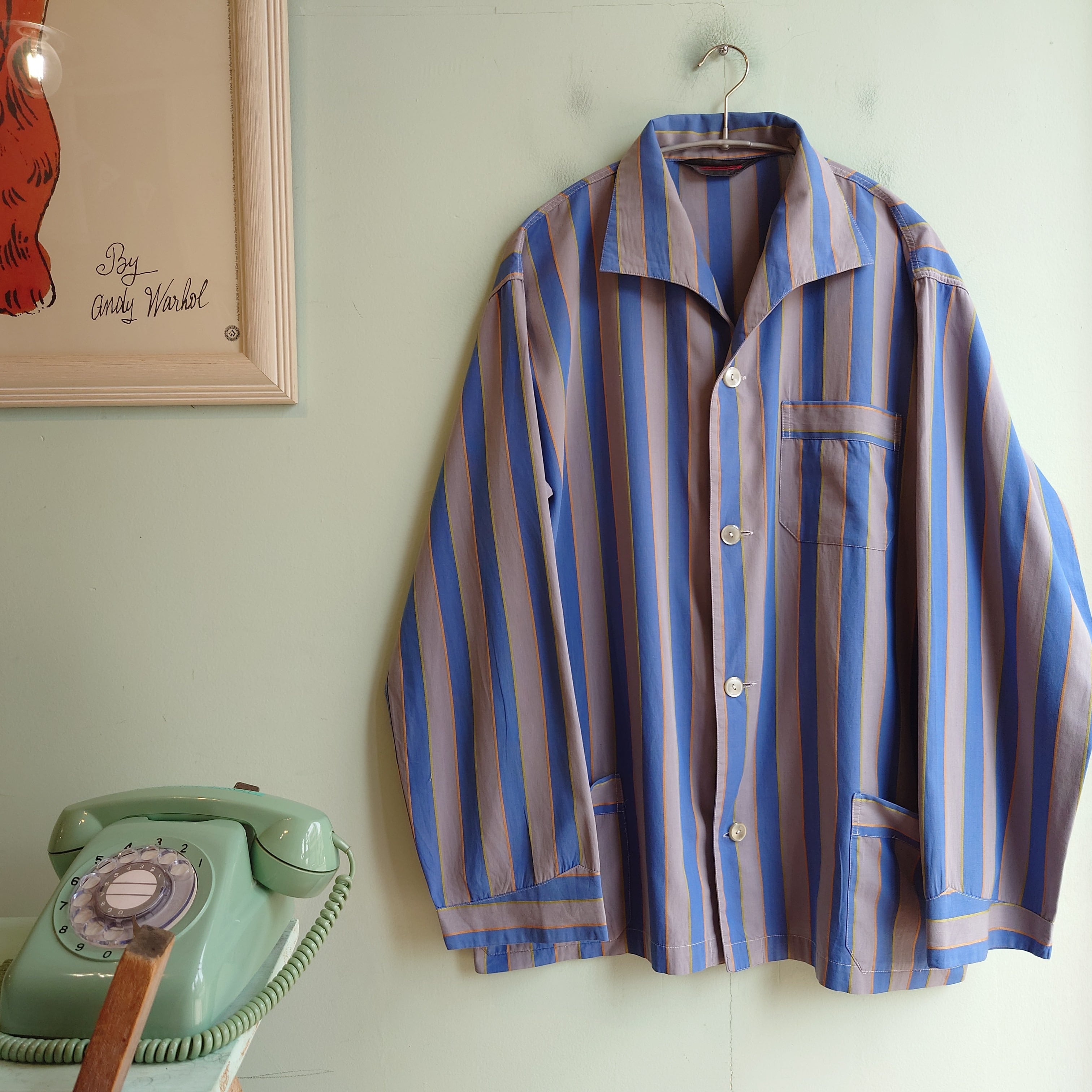 ユーロ系のヴィンテージパジャマシャツ。グレー×ブルーを縁取るようなストライプは織りのアクセントも。カモメのようなカーブを描く、独特な襟のカーブが絶妙。ジャケットライクなシルエットは羽織にも抜群で、裾のポケットもナイトウエアならでは。普通のシャツとは違うアンニュイな雰囲気と、夏にも合わせられる薄手がいい。