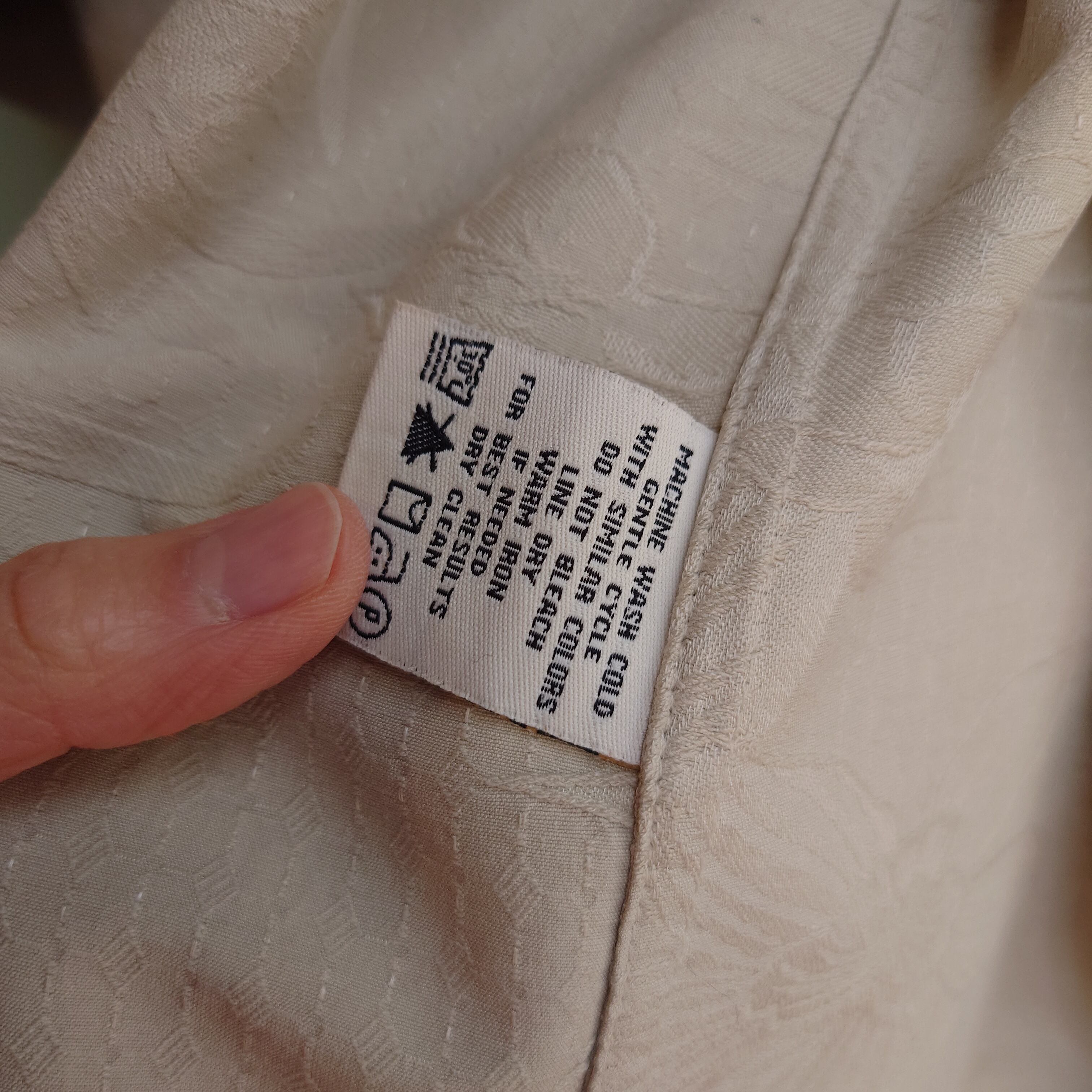 リゾートウエアブランド、Banana Cabanaのシルクシャツ。ドレッシーなドット柄の上にハイビスカスが重なり合う、ベージュからオフホワイトのワントーン系。シルクならではの光沢感や、クタッと流れるようなとろみが気持ちいい。一見無地にも見えるさり気なさがかっこいい。