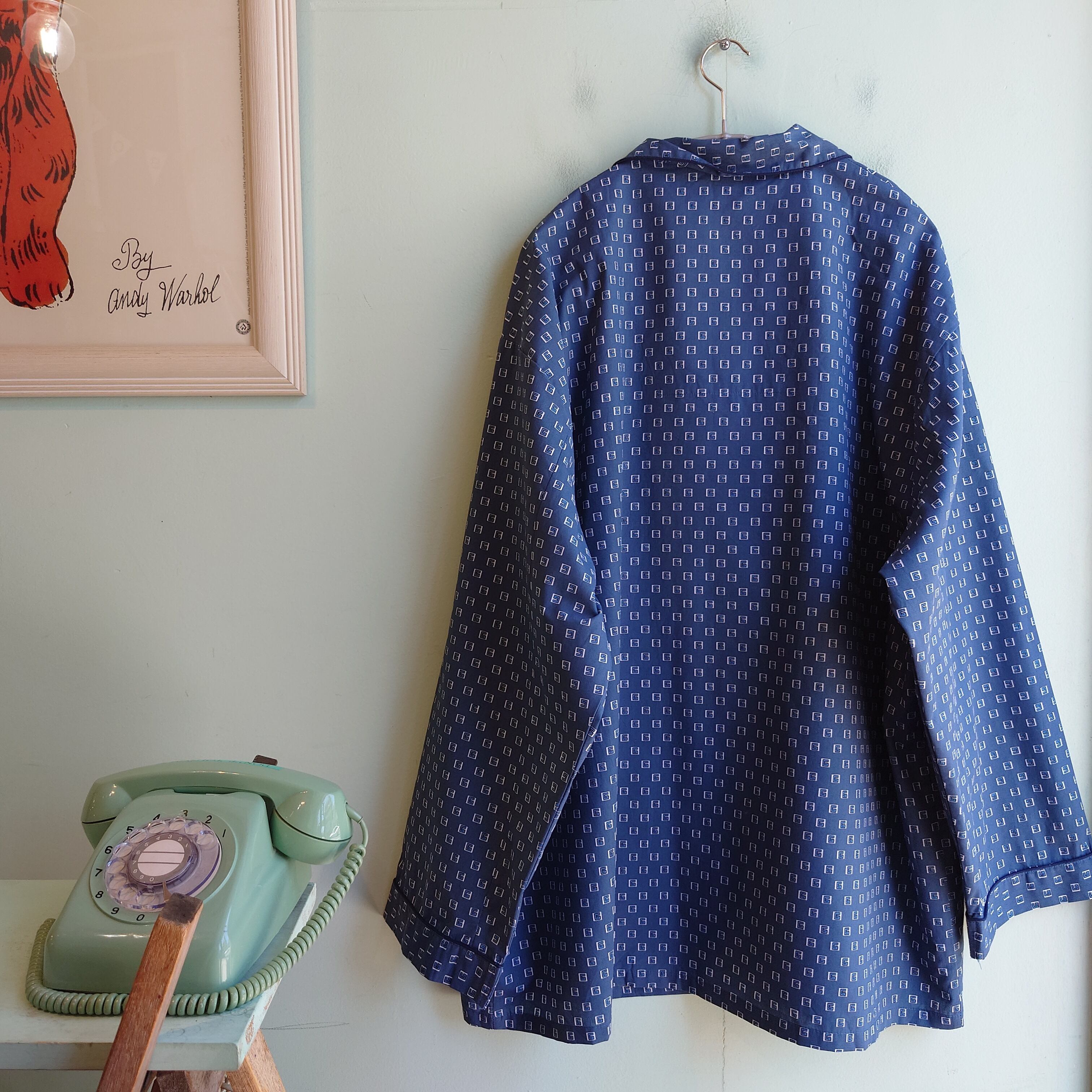 ユーロ系のパジャマシャツ。数字をモチーフにした総柄で、ナイトウエアながら柄シャツ要素が詰まったレアタイプ。まだ生地のパリッとした風合いが残るグッドコンディション。ボクシーなシルエットは羽織にも抜群、Tシャツに羽織って夏の日焼け対策にも。