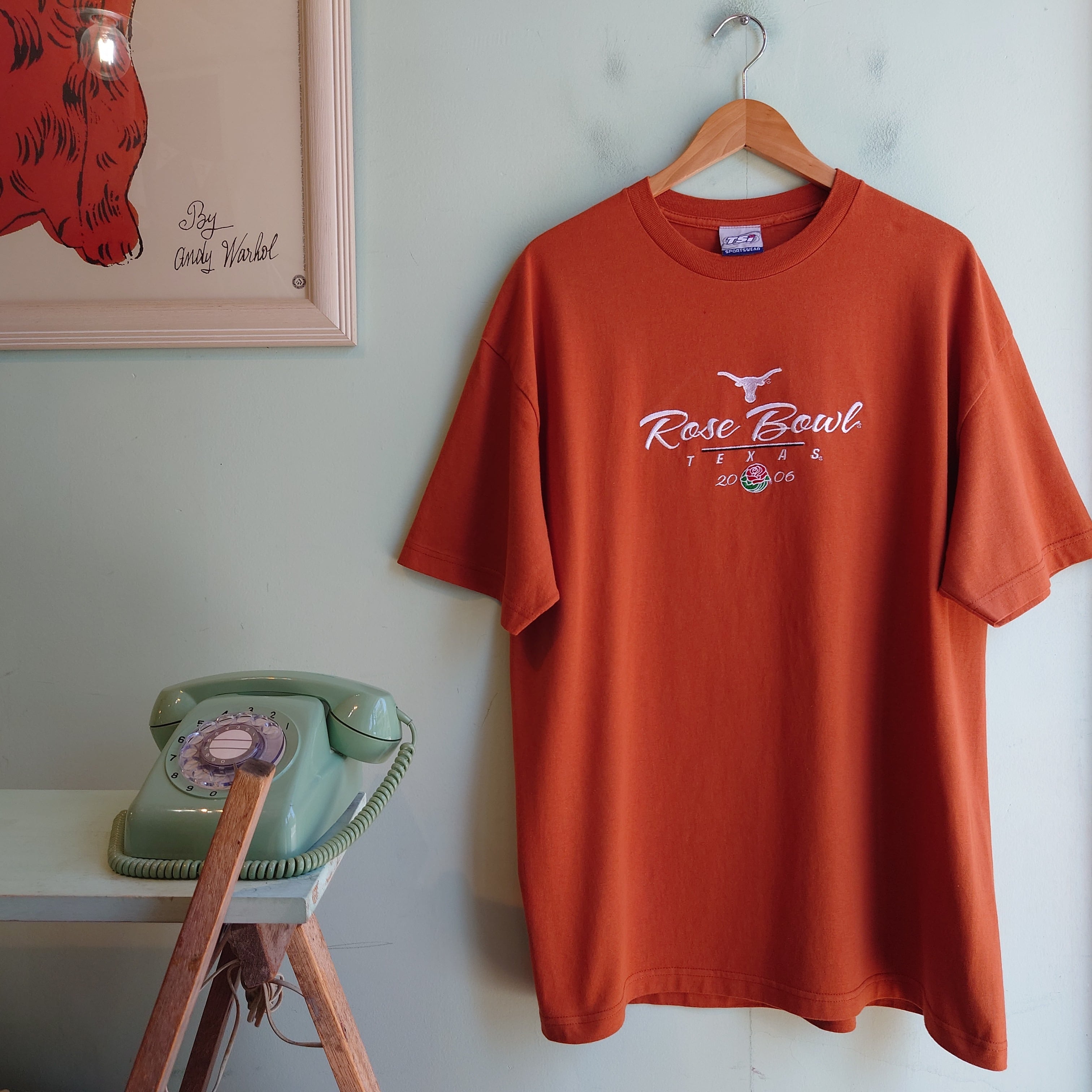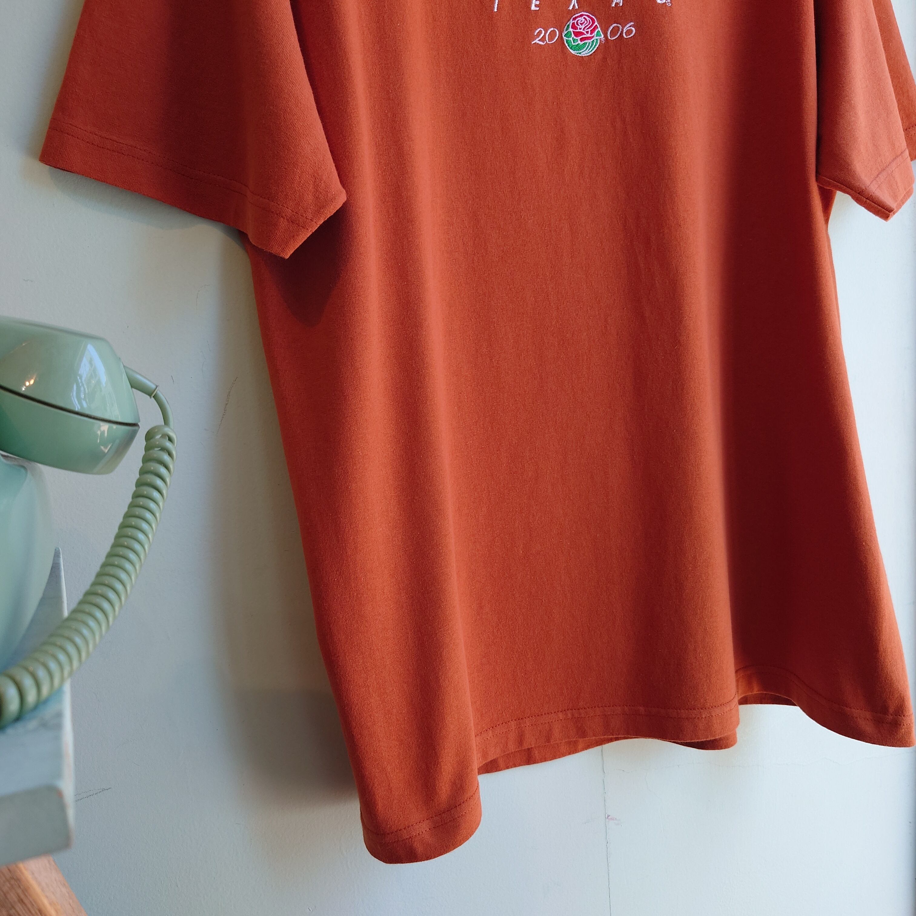 カレッジフットボールリーグの頂点ローズボウル、2006年テキサス大学優勝のメモリアルTシャツ。ざっくりヘヴィーなコットン素材に、アンバー系オレンジのカレッジカラー、刺繍がゴージャスな上級カレッジ系。スポーティーなカレッジ系よりも大人っぽい雰囲気も抜群。