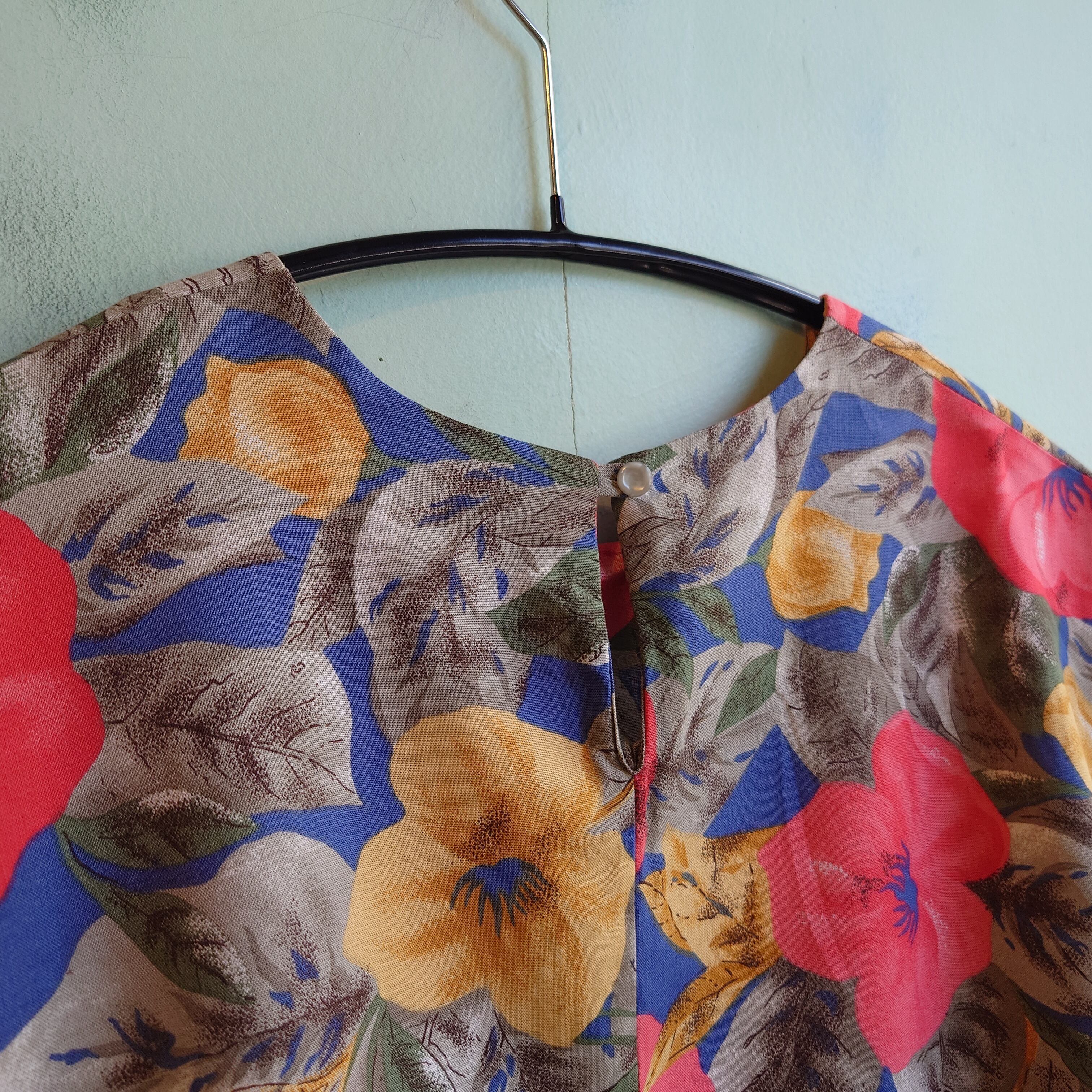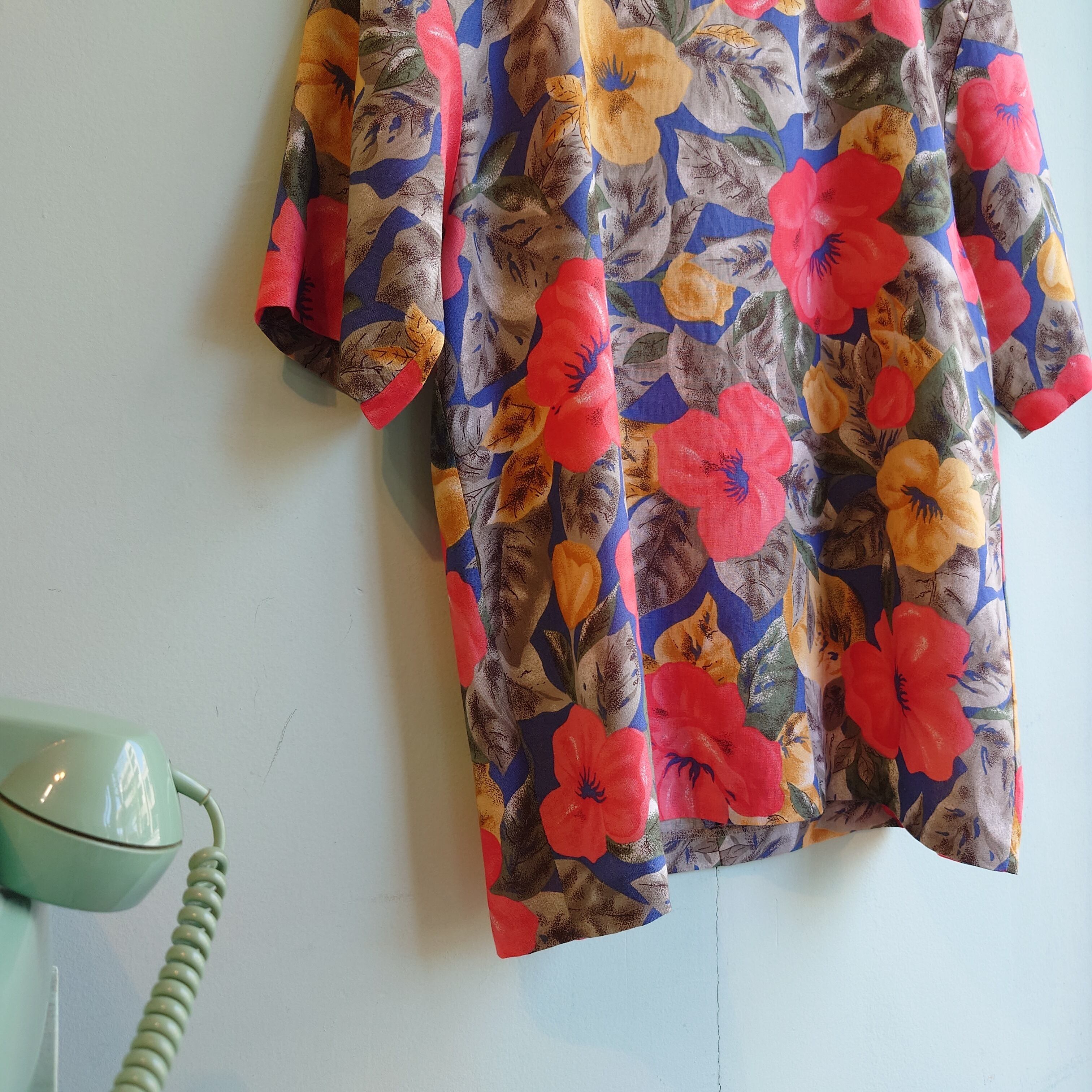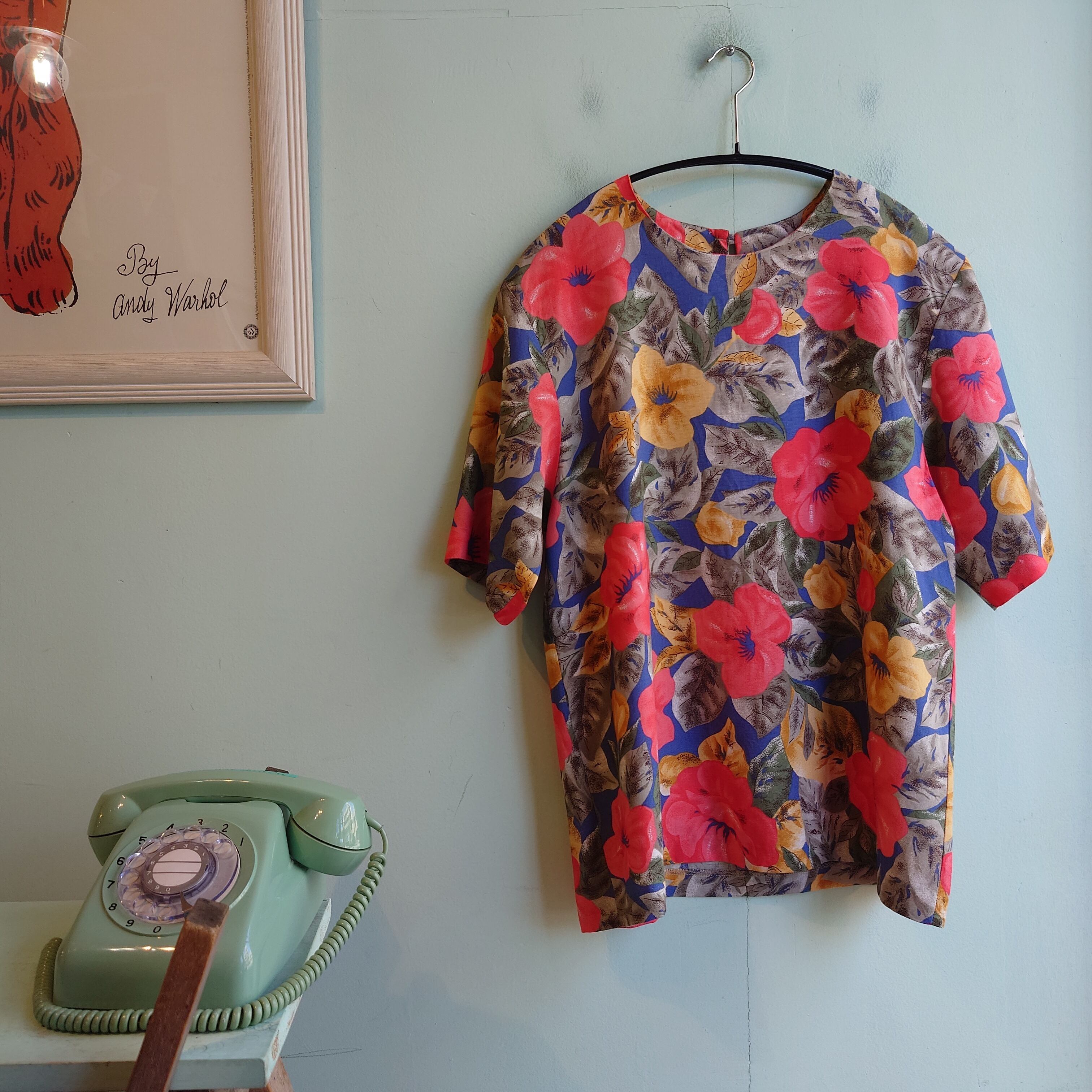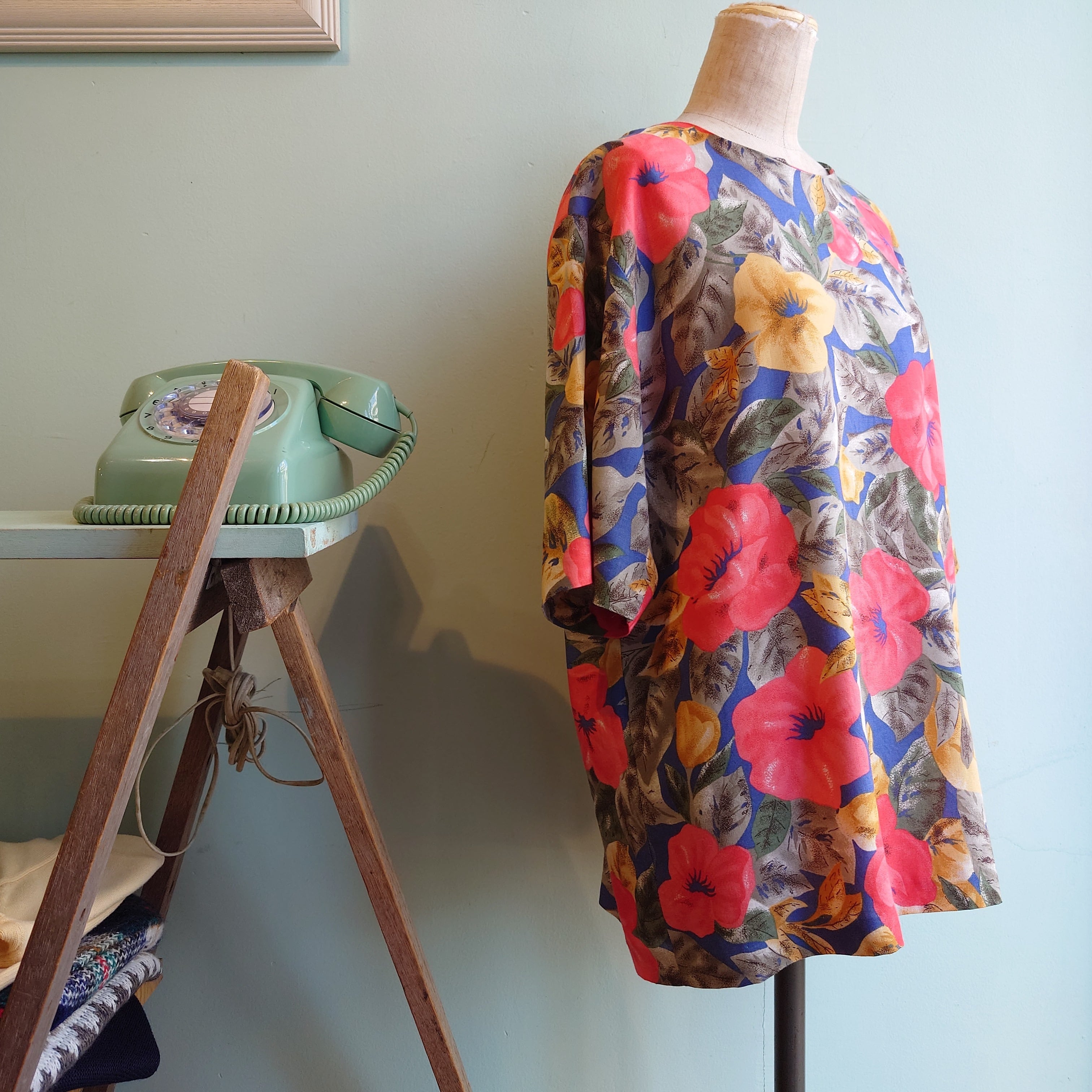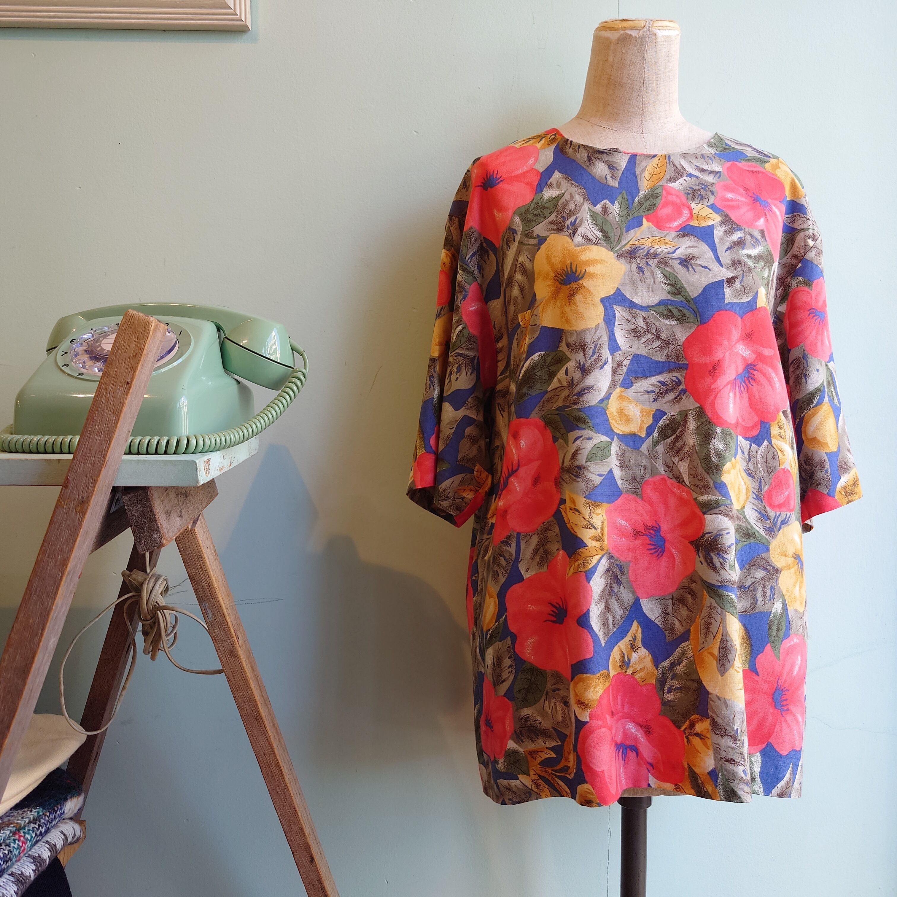 名門Donn kennyのプルオーバーブラウス。ハイビスカスを抽象画のように表現した、独特な花柄がかわいい。レーヨンのさらっとひらっとした素材を、Tシャツ感覚でかぶるシャツ。夏のTシャツに飽きたときにチョイスしても良し、風が抜ける感覚は病みつきに。