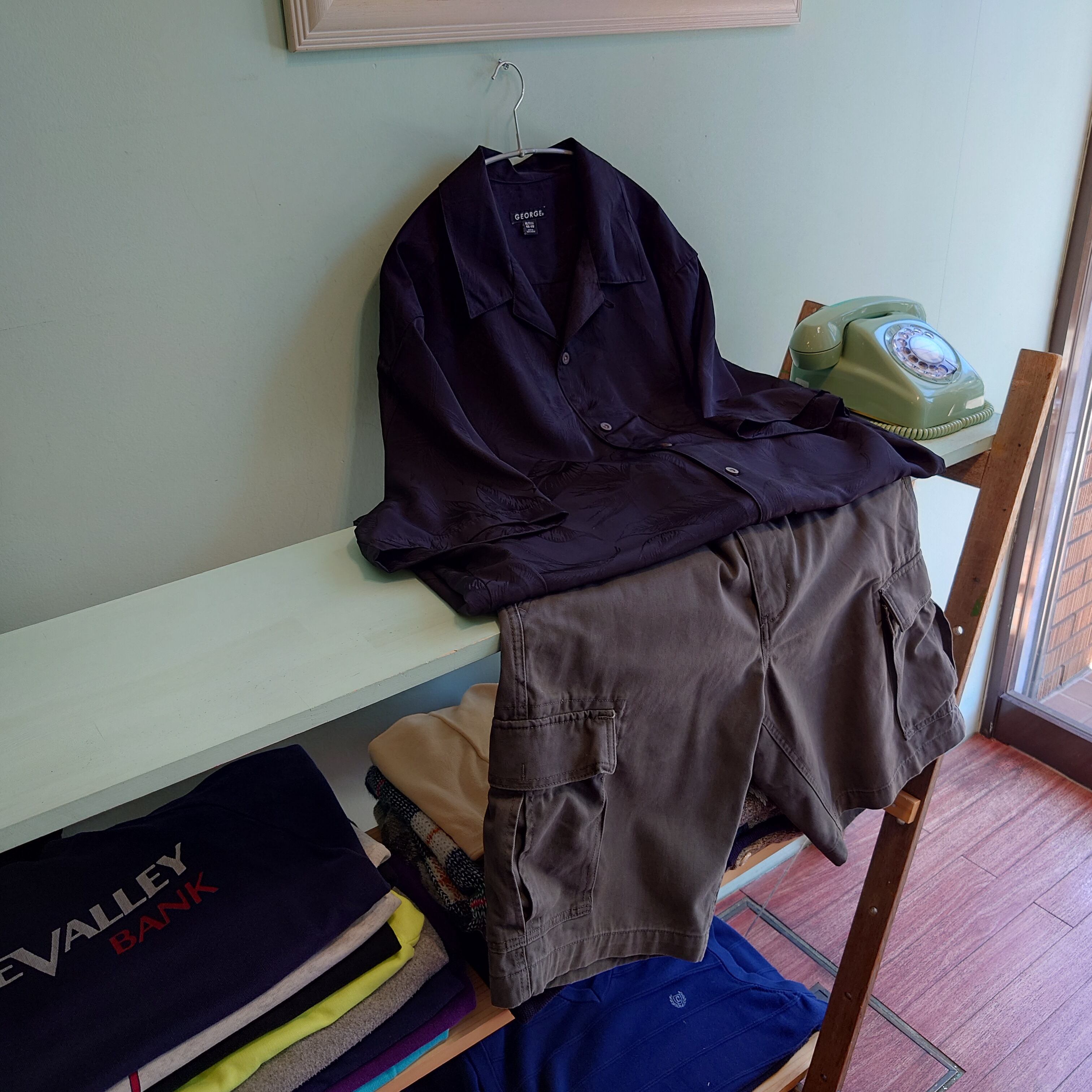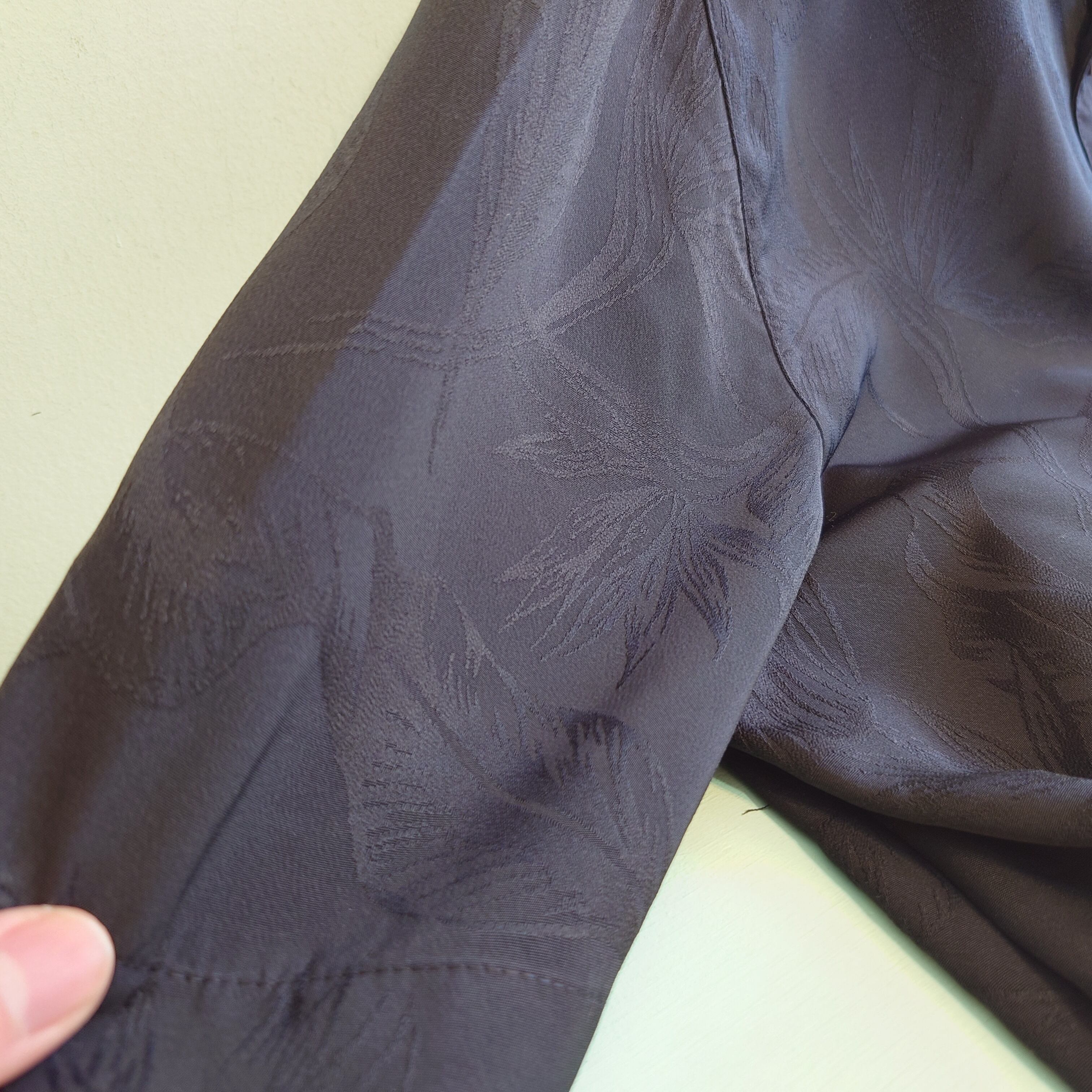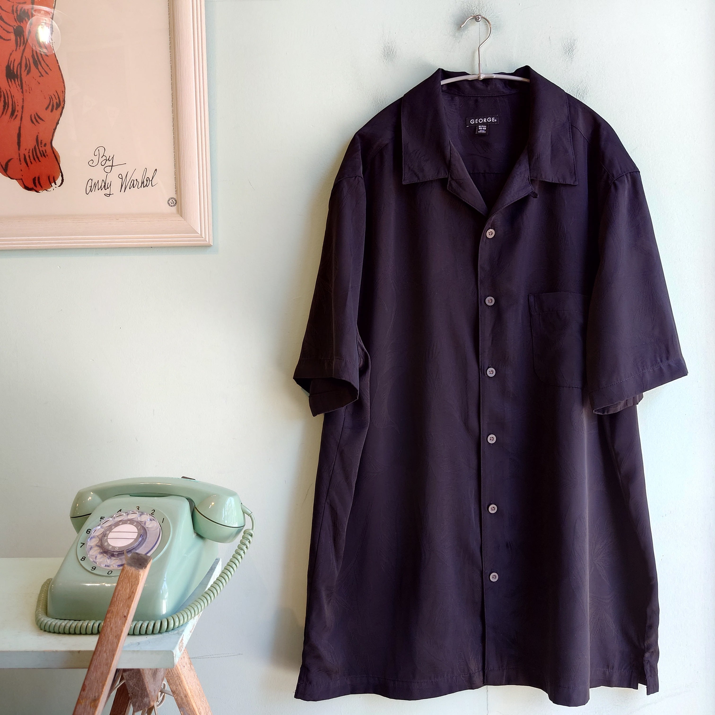 シルエット、素材感に優れる、georgeのオープンカラーシャツ。さらっとしたポリ素材で、とろみ感動き感が格別な薄手が気持ちいい。ハイビスカスではなく、珍しくリーフ柄のワントーン。一見無地にも見えて実は総柄がセンスあり。